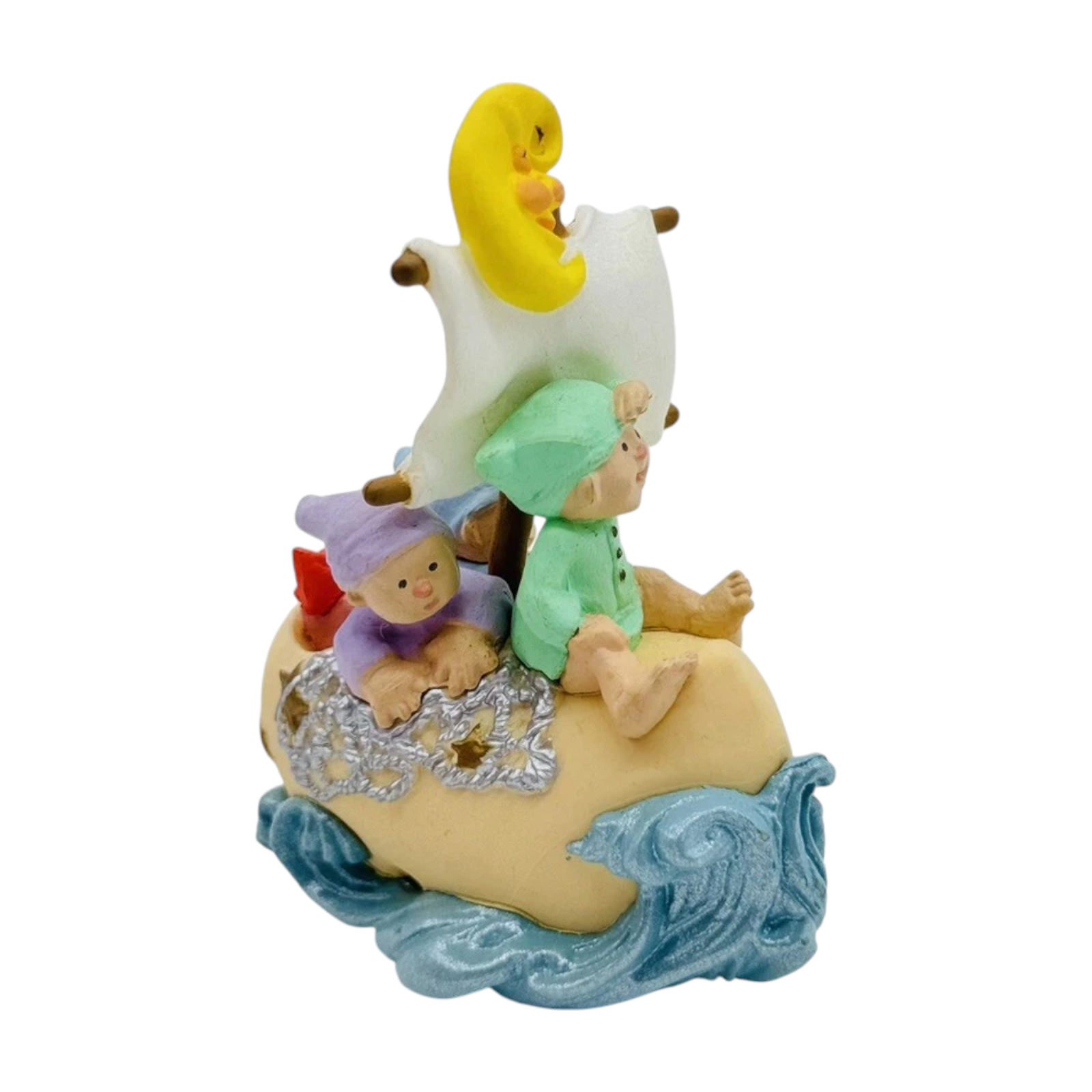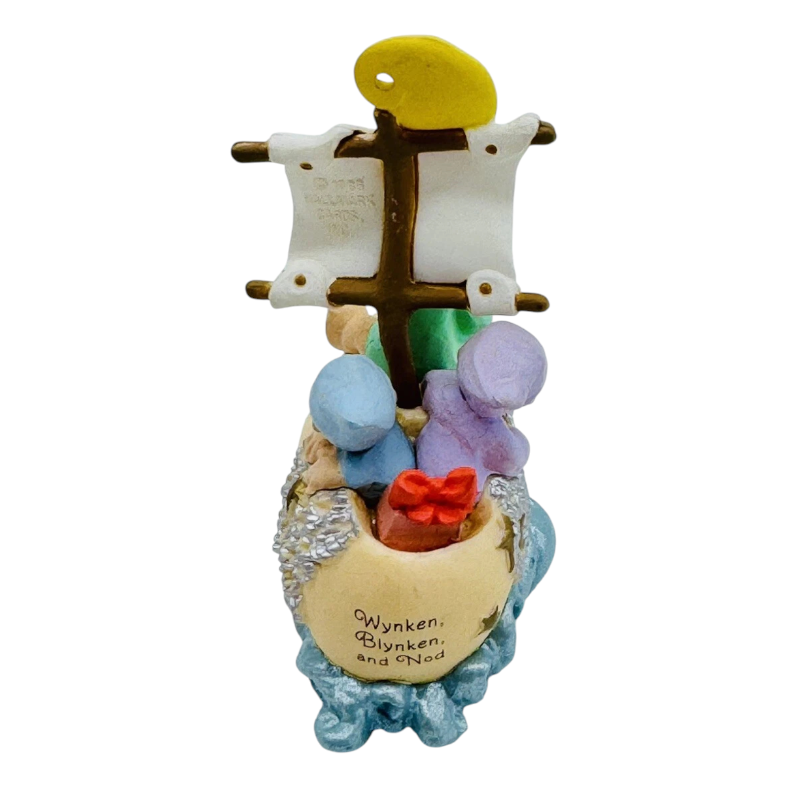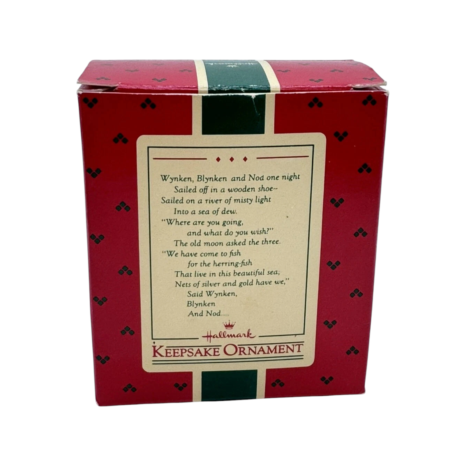 Illustrating the beloved bedtime poem, Wynken, Blynken and Nod, this magical ornament was introduced in 1986. Three dreamy children drift on a boat shaped like a crescent moon, riding over sculpted waves beneath stars. Handcrafted by Donna Lee, it typically comes in its original red-and-green collector’s box labeled Wynken, Blynken and Nod with the ornament tag. No batteries, lights, or cords are needed—just hang to watch the nostalgic story come to life.