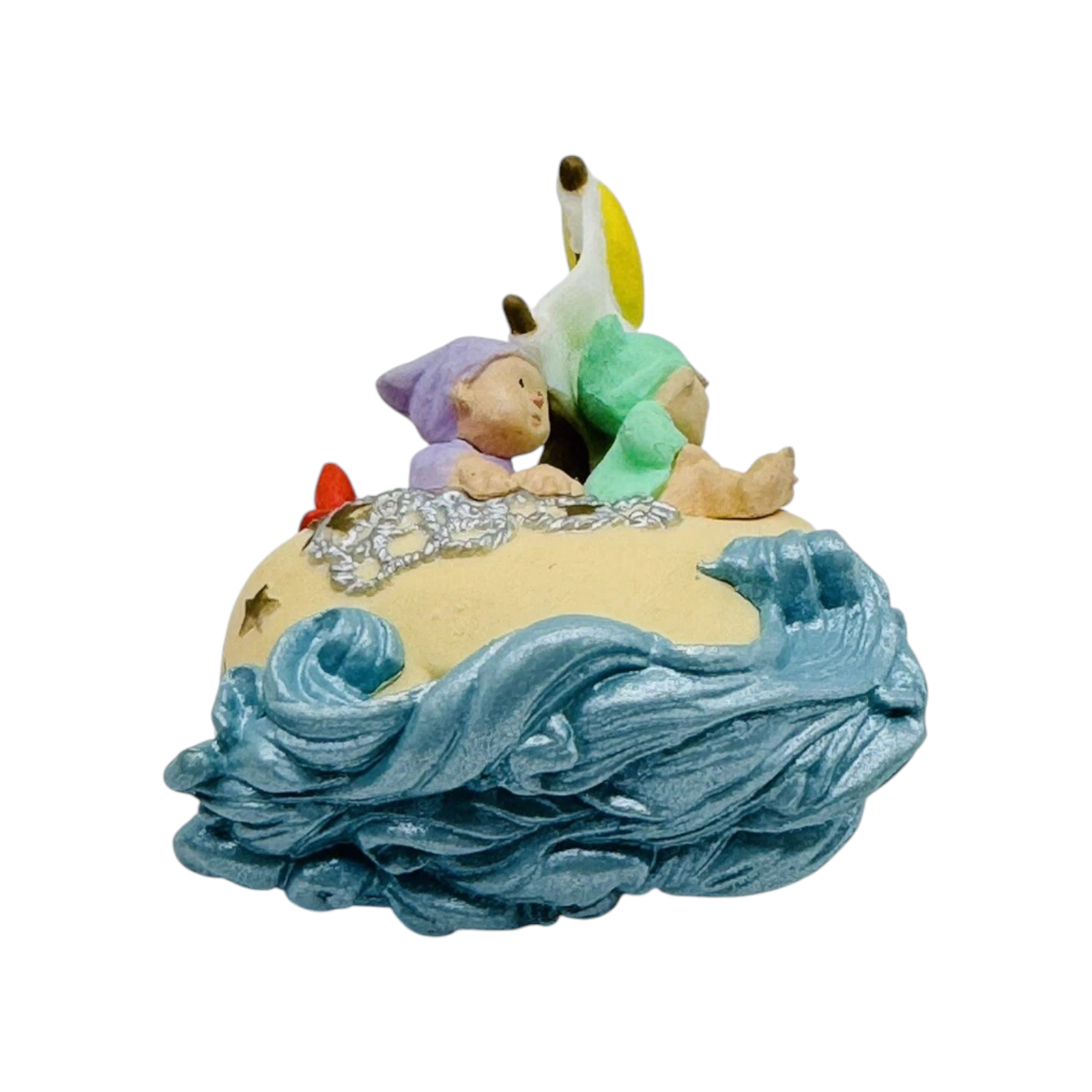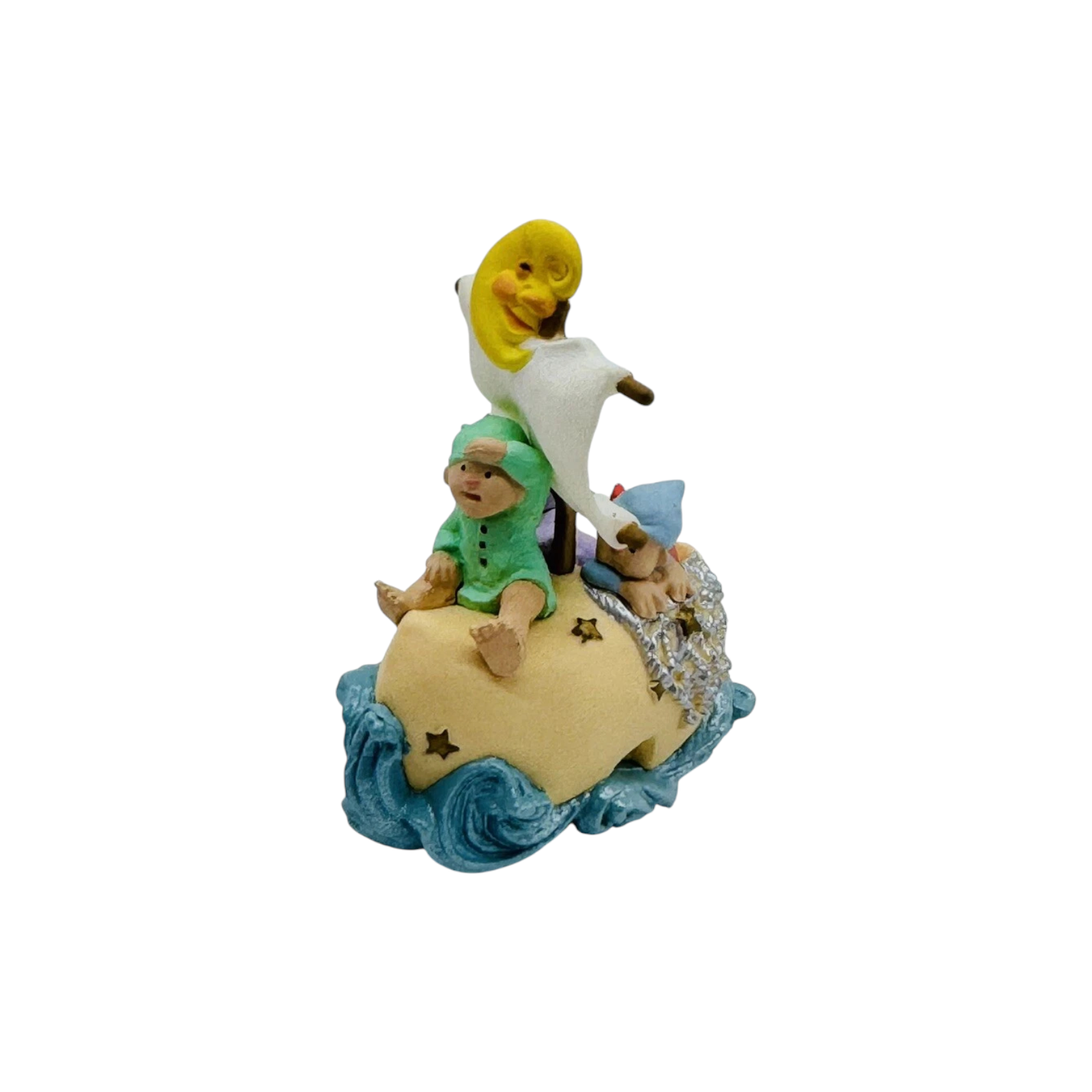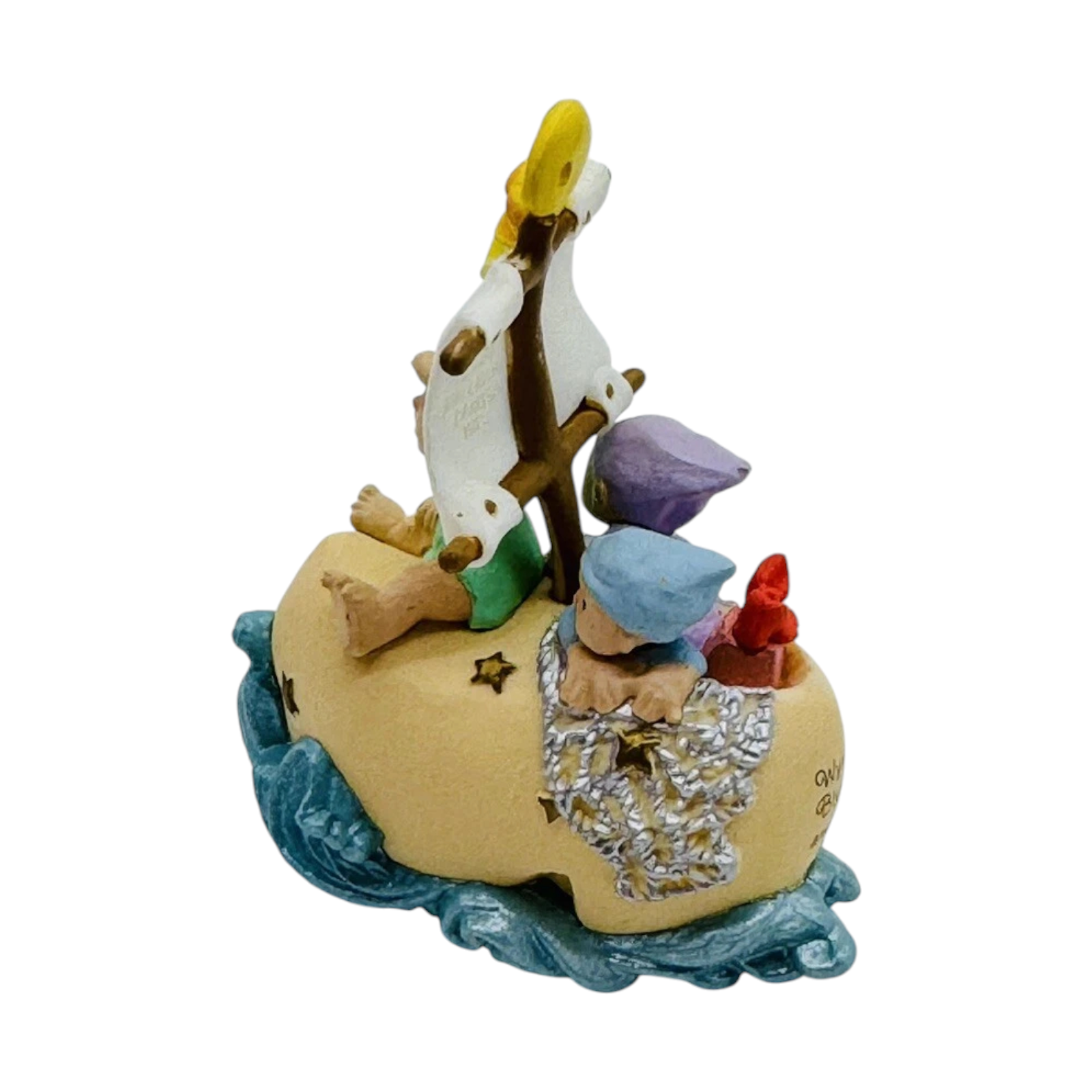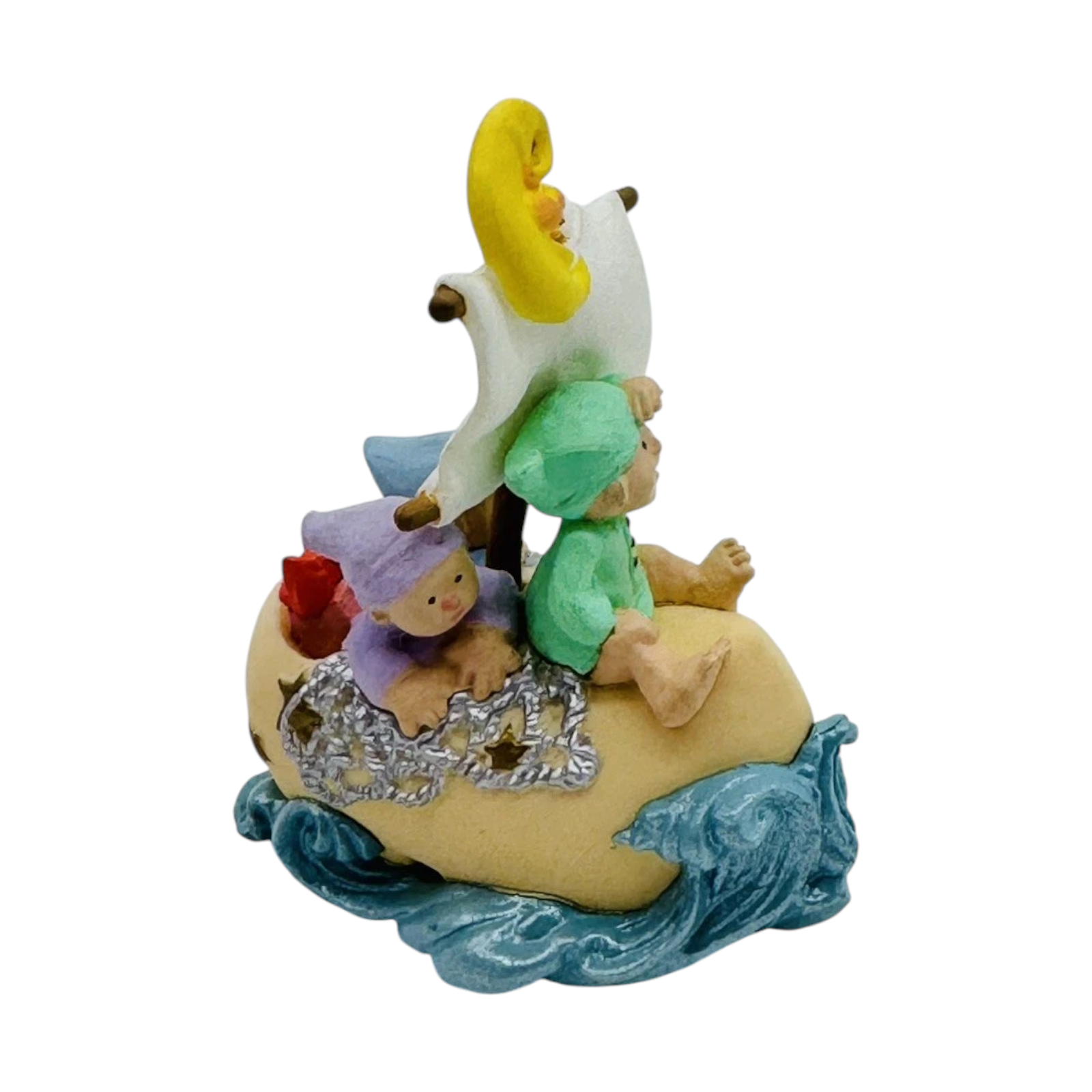 Illustrating the beloved bedtime poem, Wynken, Blynken and Nod, this magical ornament was introduced in 1986. Three dreamy children drift on a boat shaped like a crescent moon, riding over sculpted waves beneath stars. Handcrafted by Donna Lee, it typically comes in its original red-and-green collector’s box labeled Wynken, Blynken and Nod with the ornament tag. No batteries, lights, or cords are needed—just hang to watch the nostalgic story come to life.