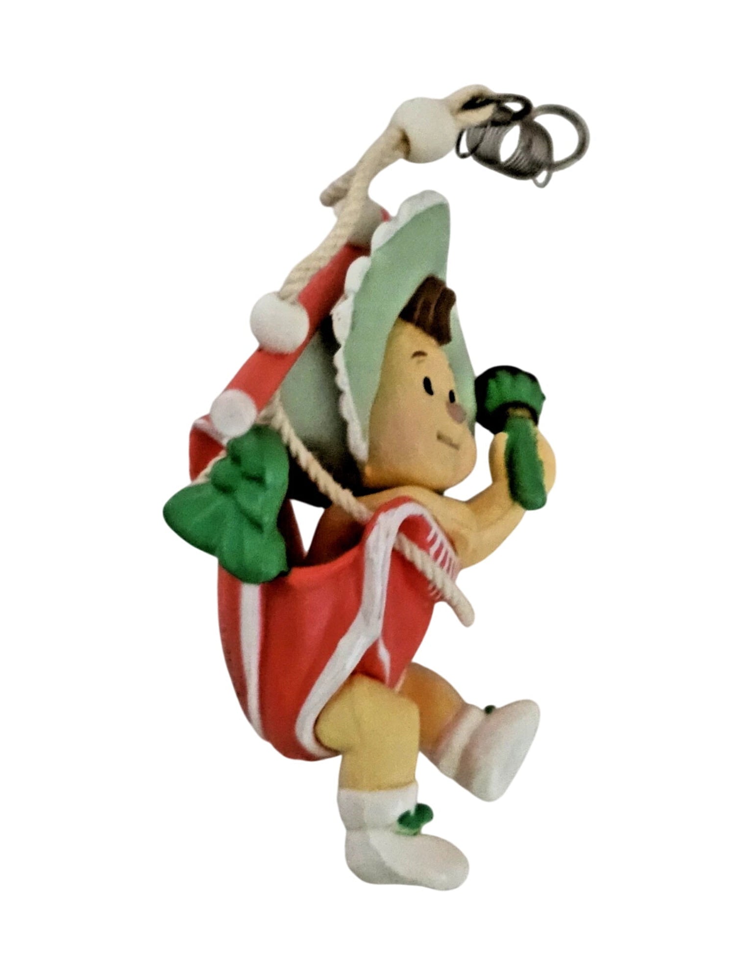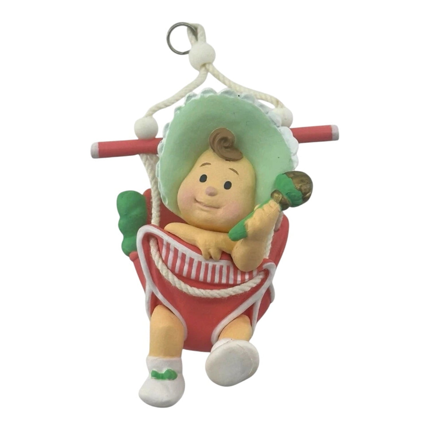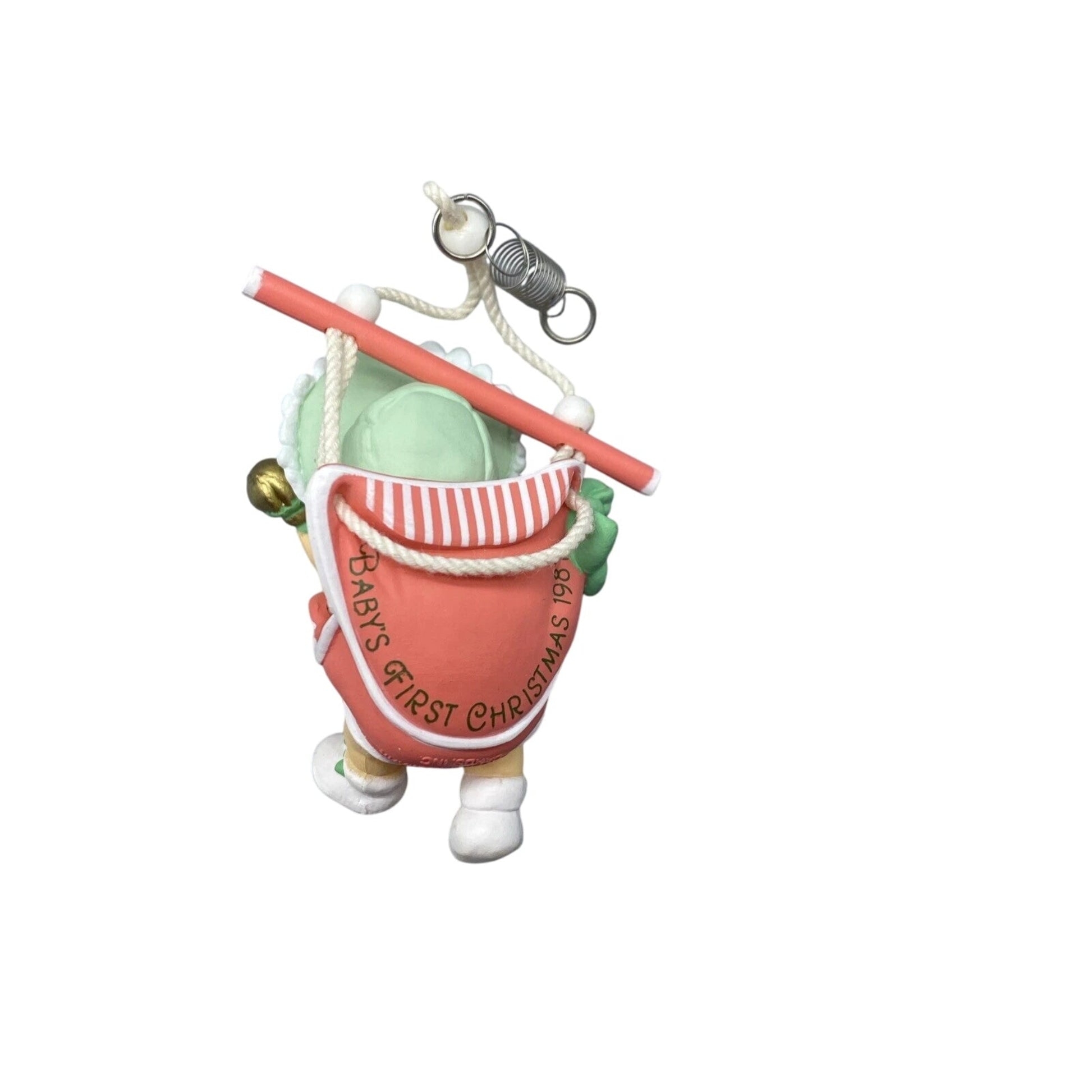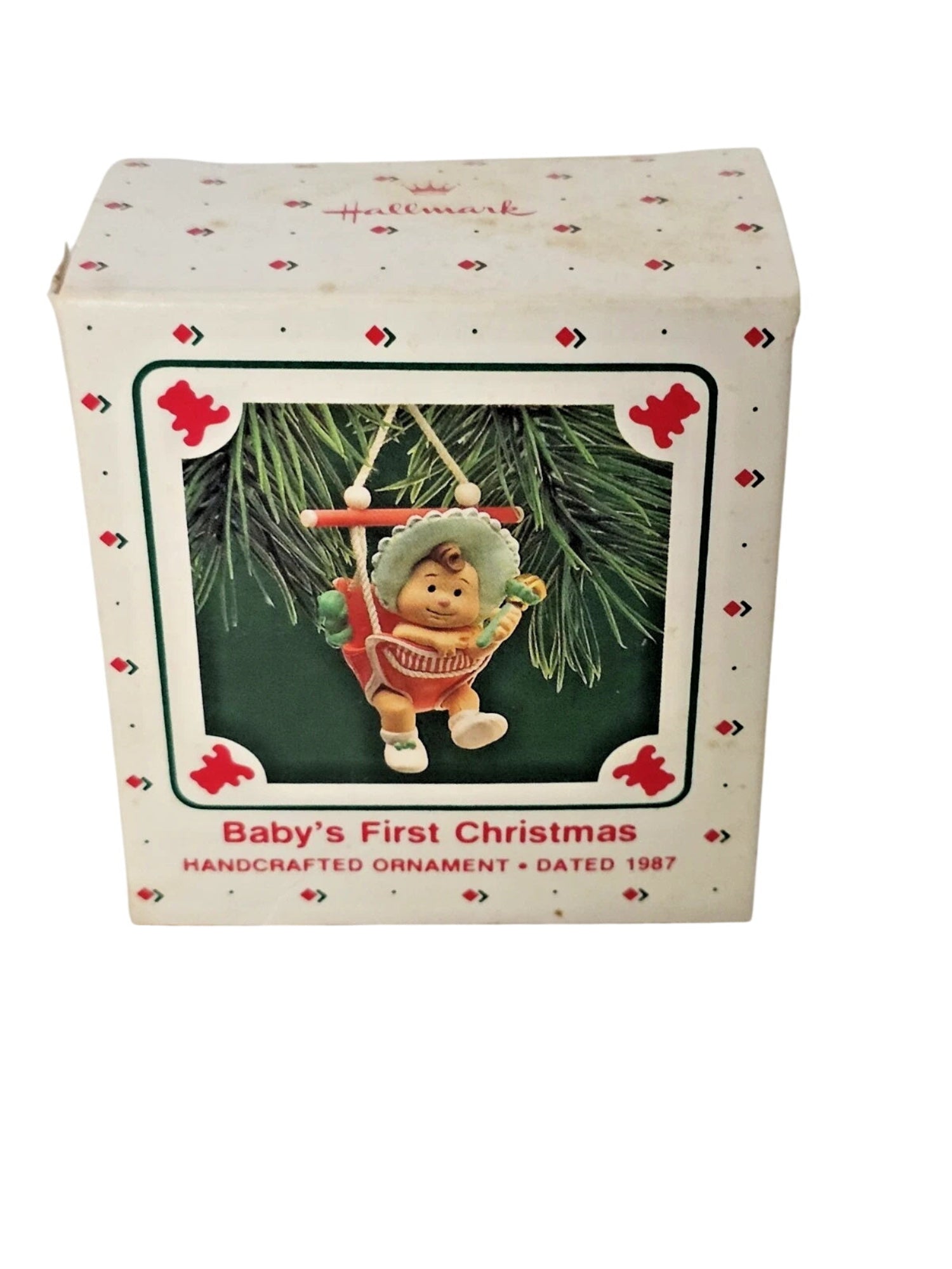 Welcome the wonder of a newborn’s first holiday with this enchanting 1987 Baby’s First Christmas ornament, part of Hallmark’s Baby First Christmas series. This resin keepsake features a sweet baby nestled in a jumper, adorned with pastel tones and dated “1987.” It includes the original Keepsake box and, uniquely for its time, offers lighted functionality, complete with a plug-in cord that illuminates the ornament as you display it.