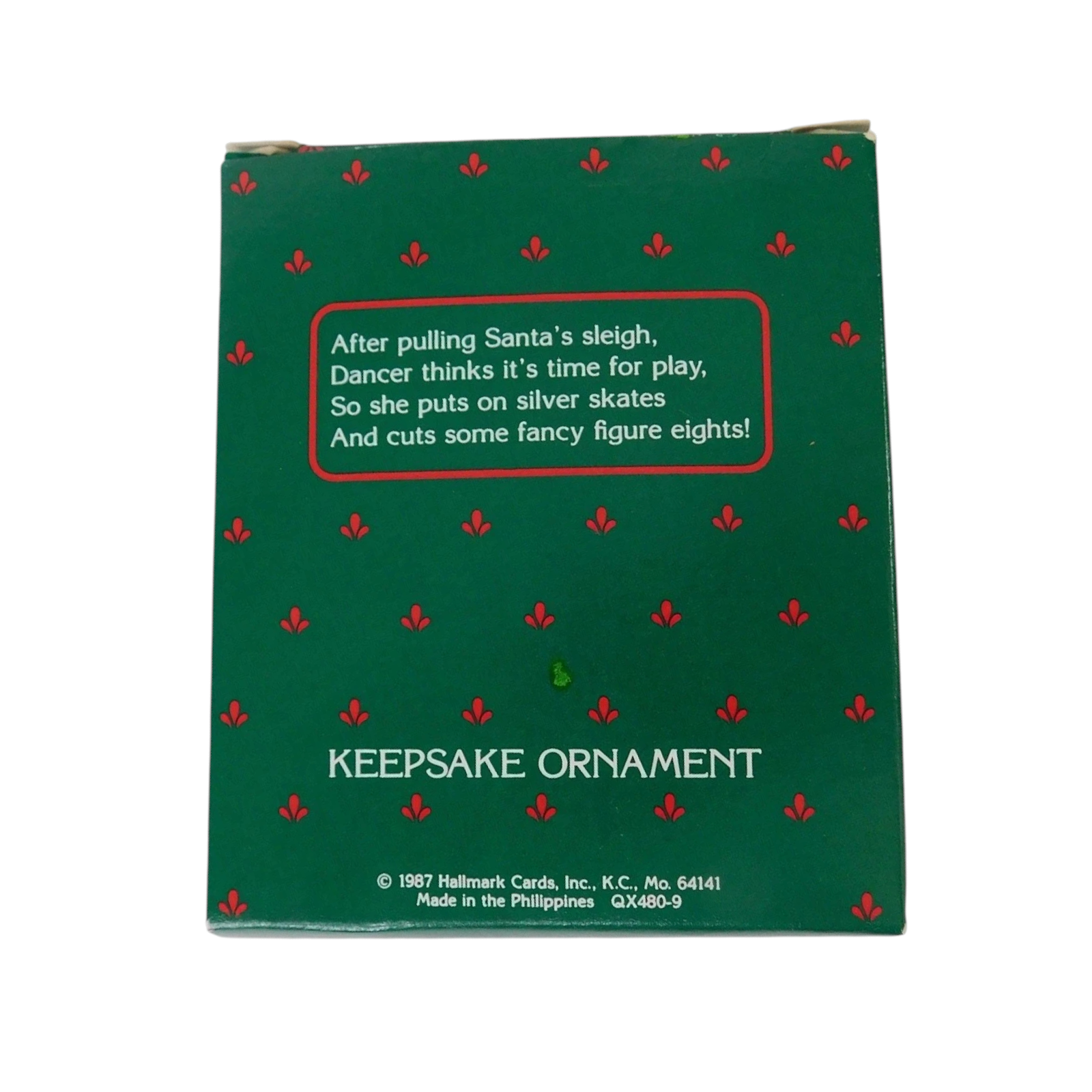 Celebrate festive flair with the spirited 1987 Reindeer Champs Dancer ornament — the second entry in Hallmark’s playful Reindeer Champs Series. This handcrafted resin ornament features Dancer the reindeer ice-skating, dressed in a sporty red jacket emblazoned with “87”, a green skirt, and tiny silver skates. It usually arrives in its original green Collector’s Series box with the decorative hang‑tag and interior packaging. No power is needed — simply hang on your tree to showcase its dynamic design.