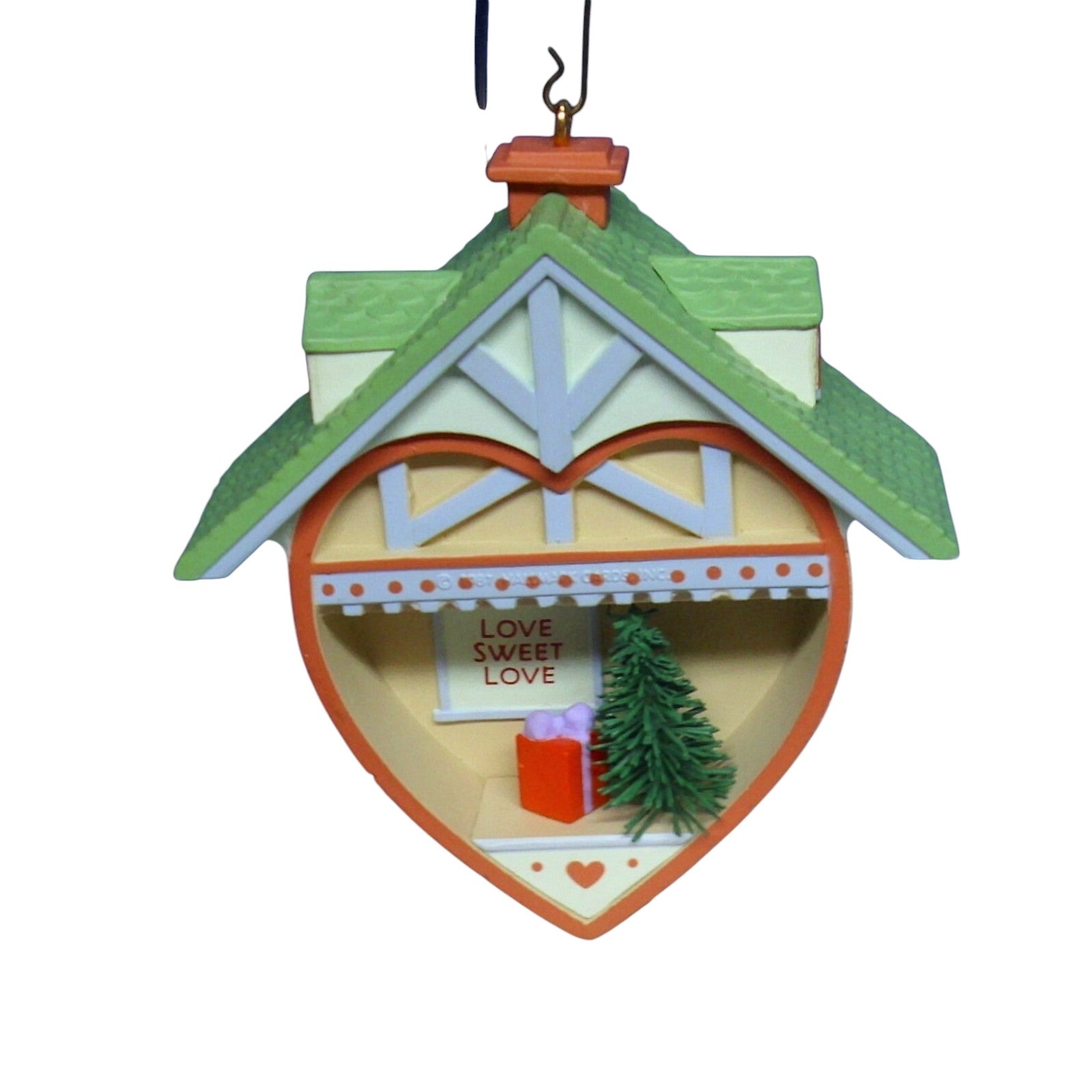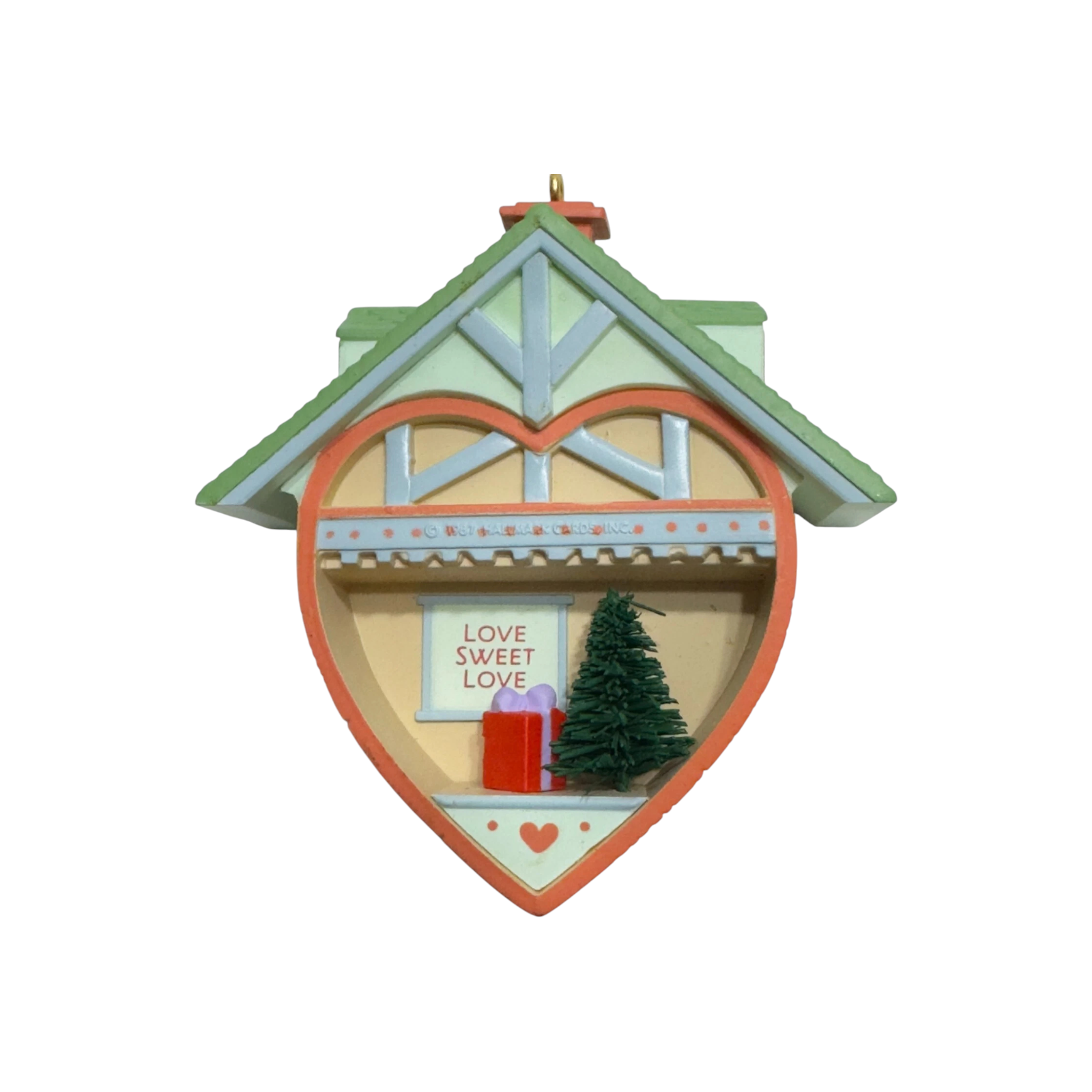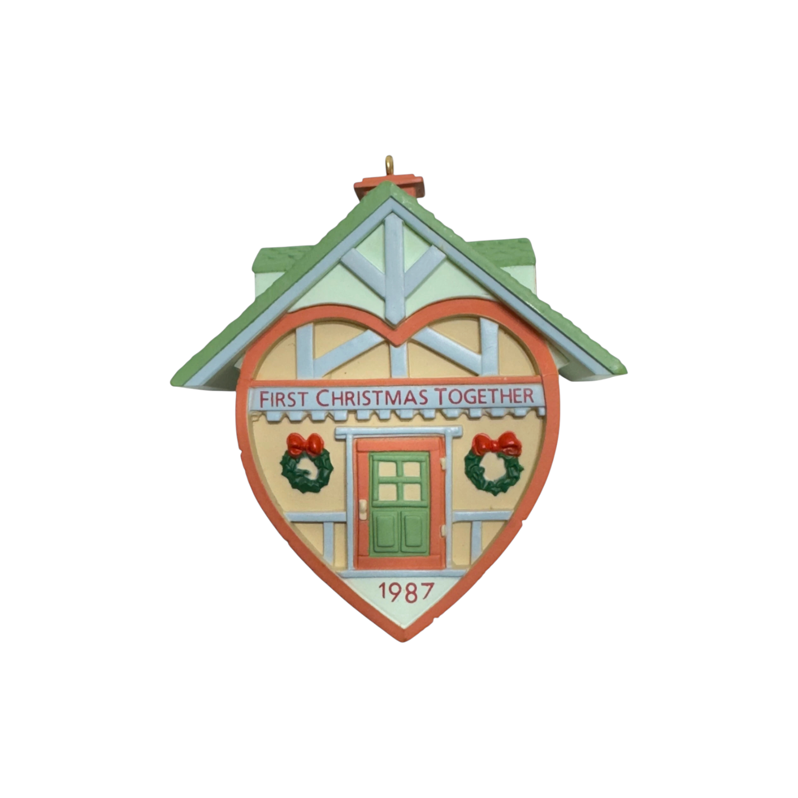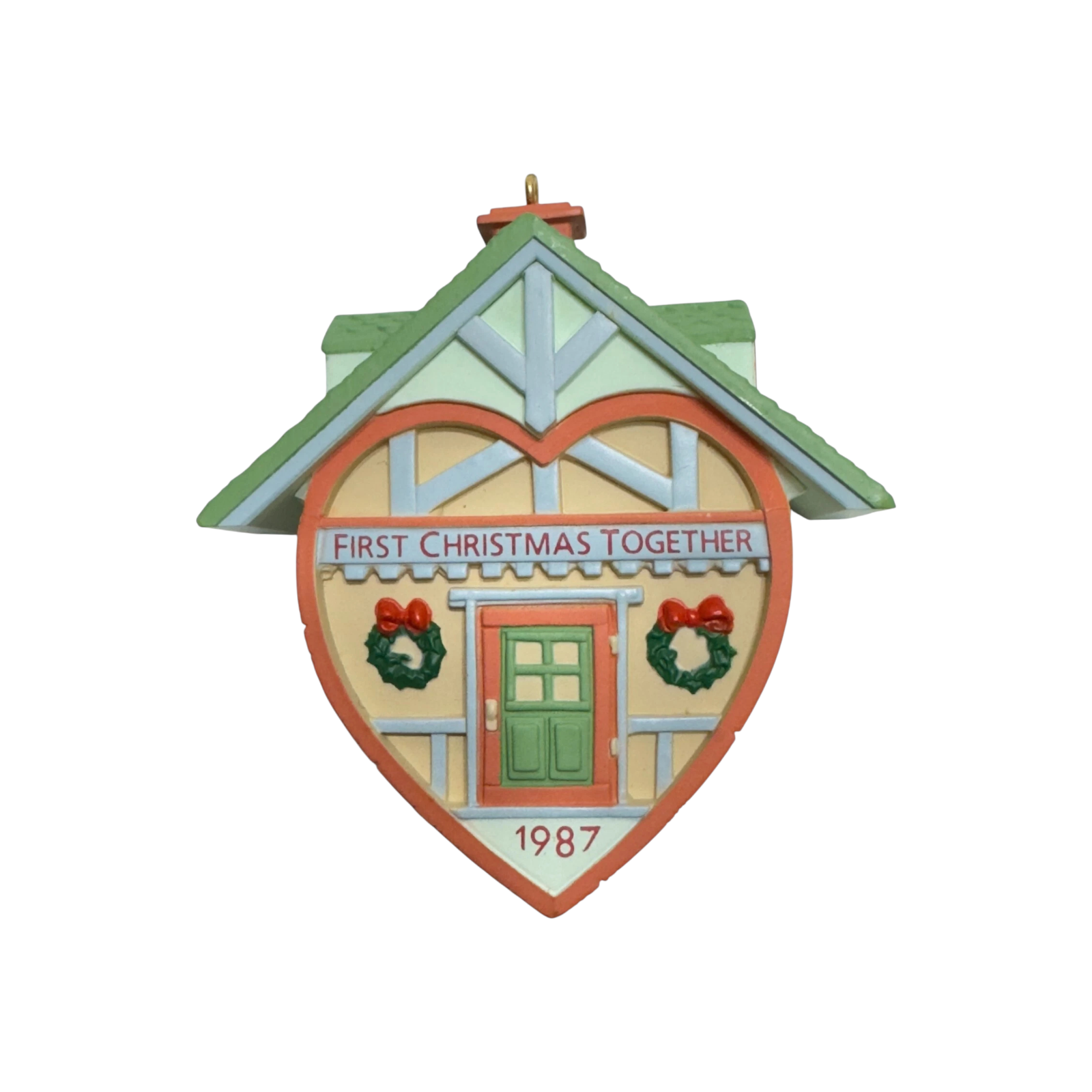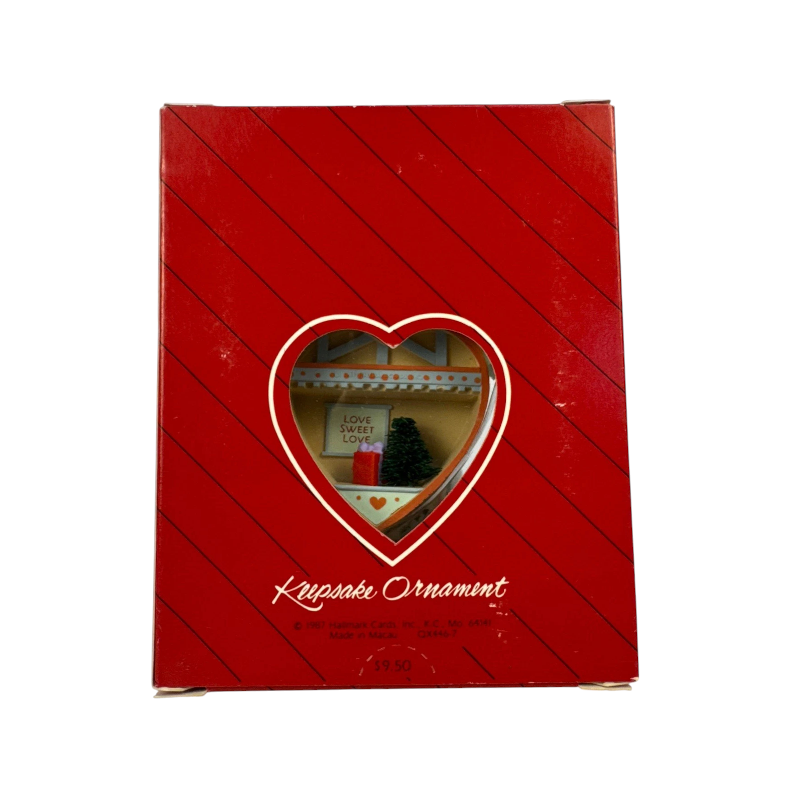 The 1987 First Christmas Together ornament is a heartwarming keepsake designed to celebrate a couple’s first holiday season together. It features two white doves perched atop a delicate red heart inscribed with the words “Our First Christmas Together 1987.” The doves hold a gold ribbon in their beaks, symbolizing unity and love. Crafted in porcelain with elegant gold accents, this ornament captures the sentimental spirit of Hallmark’s romantic 1980s designs. It comes with its original Hallmark box and hanging cord and requires no cords, batteries, or lighting—just timeless holiday charm.