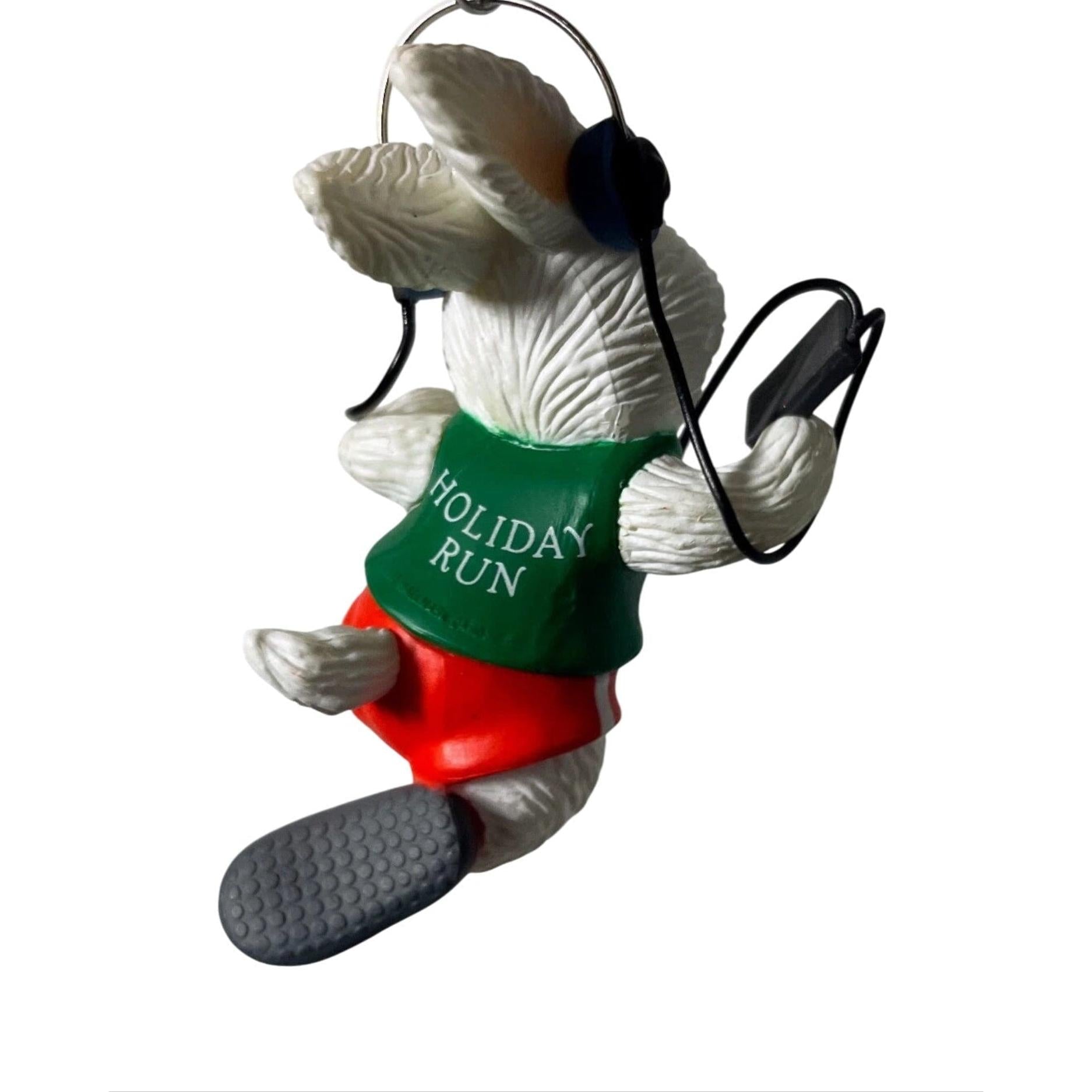 Bring a playful puff of winter to your tree with the 1987 Jogging Through the Snow ornament. This spirited resin figure depicts a white rabbit donned in a green track shirt emblazoned “87,” red jogging shorts, headphones, and sneakers—capturing festive fun on the go. It typically arrives in its original red-and-green Keepsake box with the hang-tag included. No batteries or cords are needed—just hang it on a branch and let this sporty bunny bring icy cheer to your holiday décor.