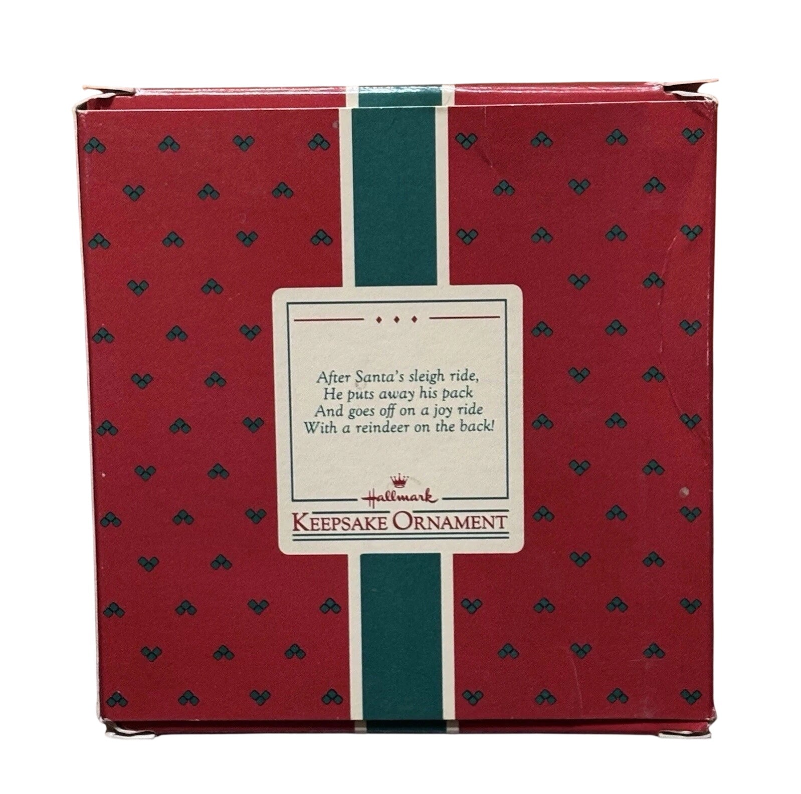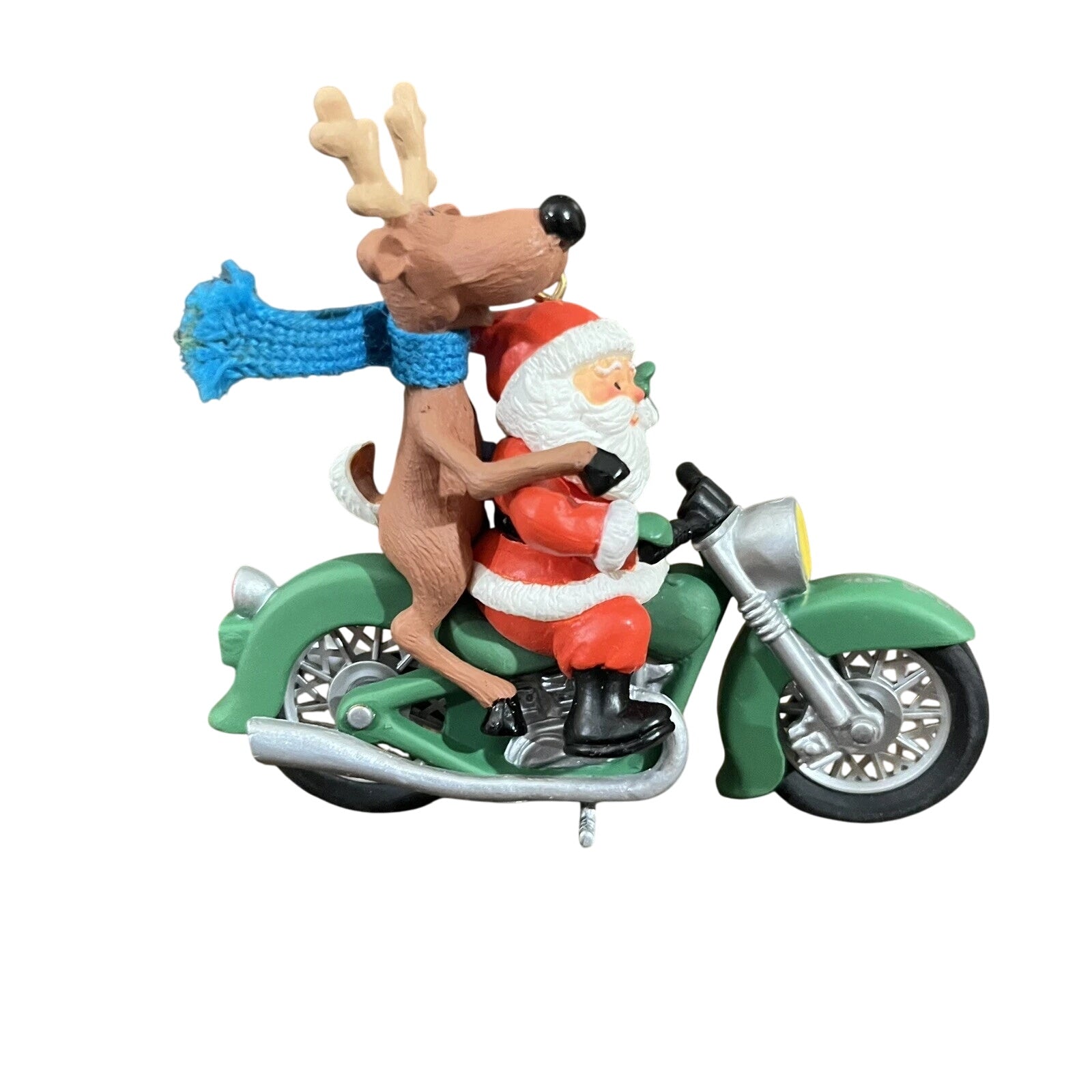 Reignite holiday humor and whimsy with the daring 1987 Joy Ride ornament from Hallmark’s Santa Claus series. This playful resin piece features Santa Claus seated on a green motorcycle, accompanied by a joyful reindeer passenger wearing a blue scarf. The motorcycle fender proudly reads “Joyride” and its 1987 license plate adds charm. The functional wheels actually turn! Included in the original red keepsake box emblazoned “Handcrafted Ornament Dated 1987” and the decorative hang‑tag. No batteries or power needed—just hang and let the fun roll into your holiday décor.