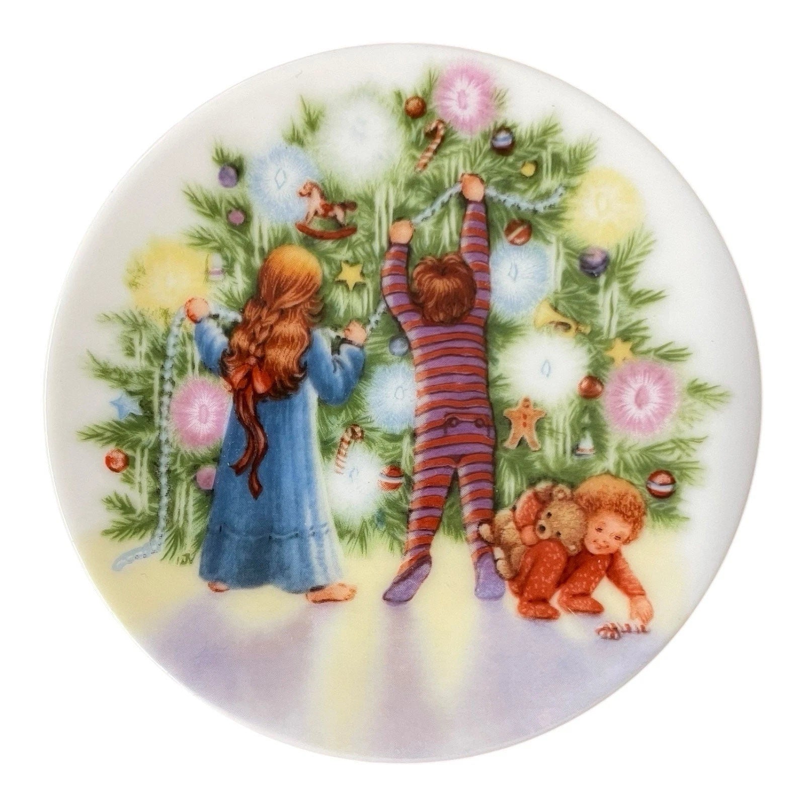 Celebrate the inaugural piece in Hallmark’s Collector’s Plate Series with 1987 Light Shines at Christmas. This fine porcelain mini plate features three children in cozy pajamas lovingly decorating a glowing Christmas tree, with stocking accents and soft pastel tones. Packaged in its original Keepsake Collector’s Plate box—often including a clear plastic stand for display—and includes the hang‑tag. No batteries or cords are required. This heirloom-quality ornament is as much a tabletop collectible as a tree decoration.