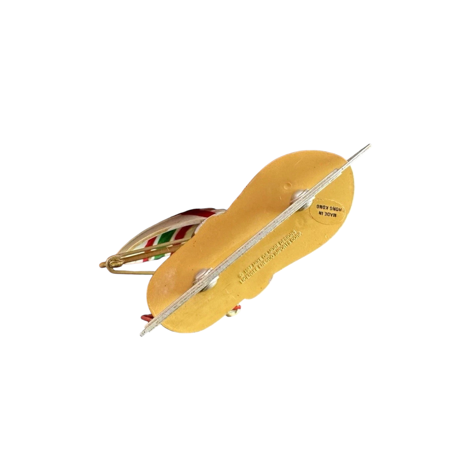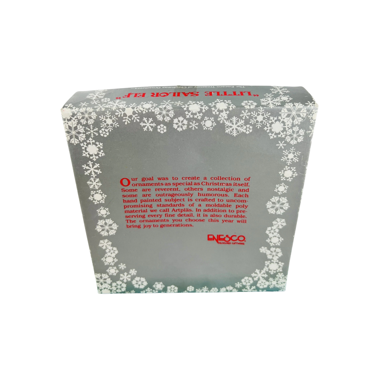 The 1987 Little Sailor Elf ornament from Enesco is a charming nautical-themed holiday collectible featuring a cheerful elf dressed in a sailor outfit. The elf wears a classic white sailor cap with a blue trim, a matching blue collar, and a red necktie while sitting proudly on a toy sailboat decorated with festive Christmas colors. His smiling face and playful pose capture the joy and whimsy of Enesco’s 1980s design style. Hand-painted with fine detail, this porcelain ornament embodies a unique blend of Christmas cheer and maritime spirit. It comes with its original Enesco box and hanging cord and requires no cords, lights, or batteries.