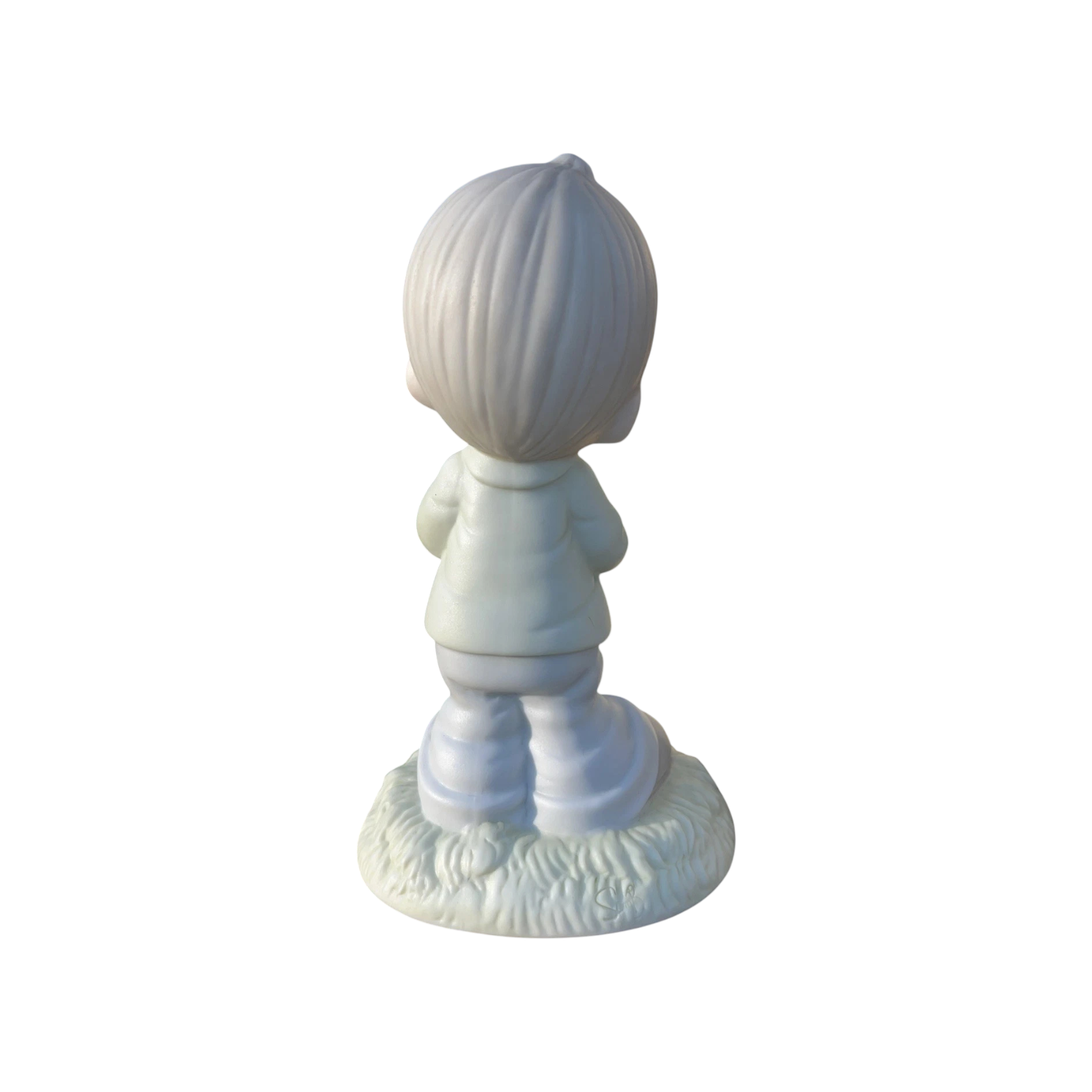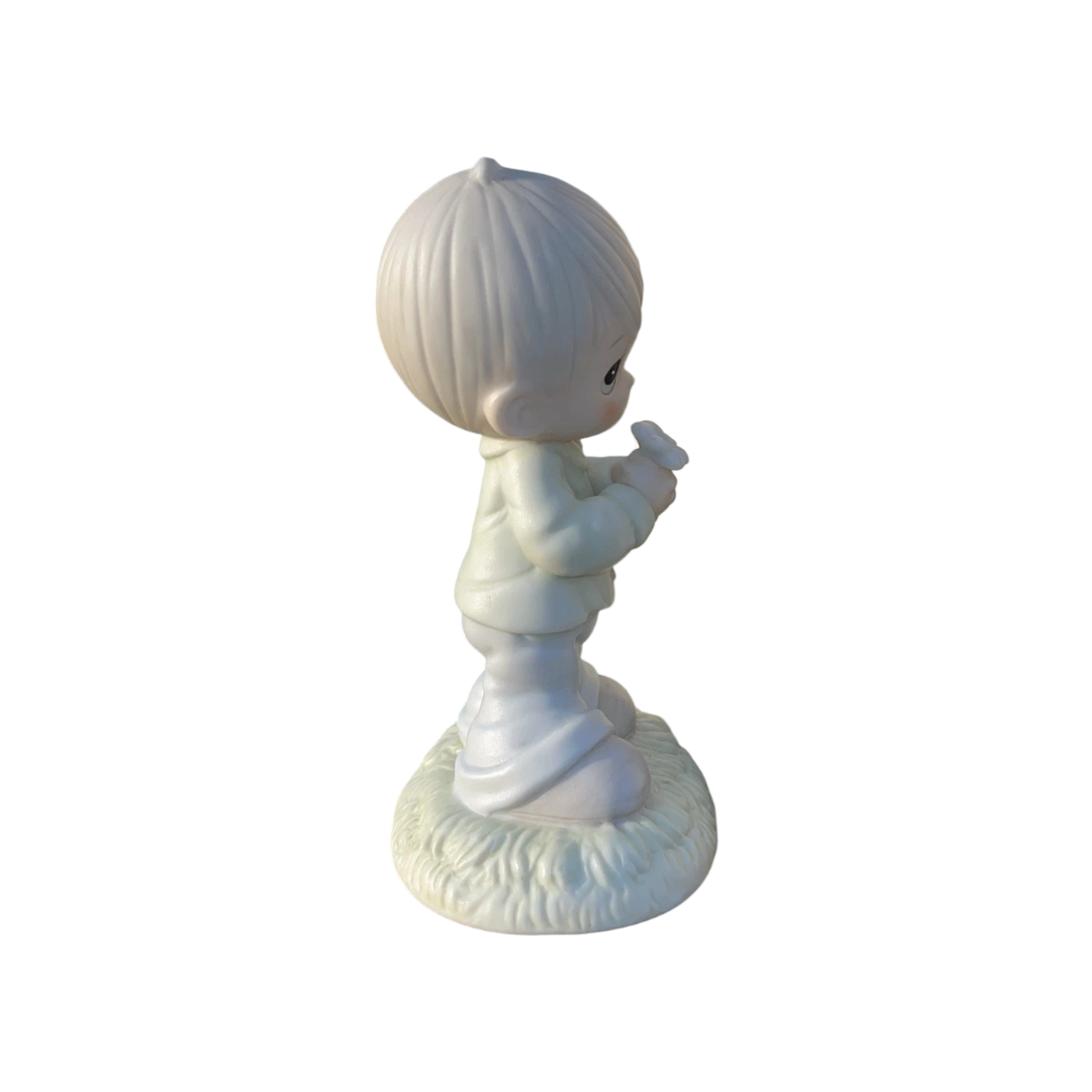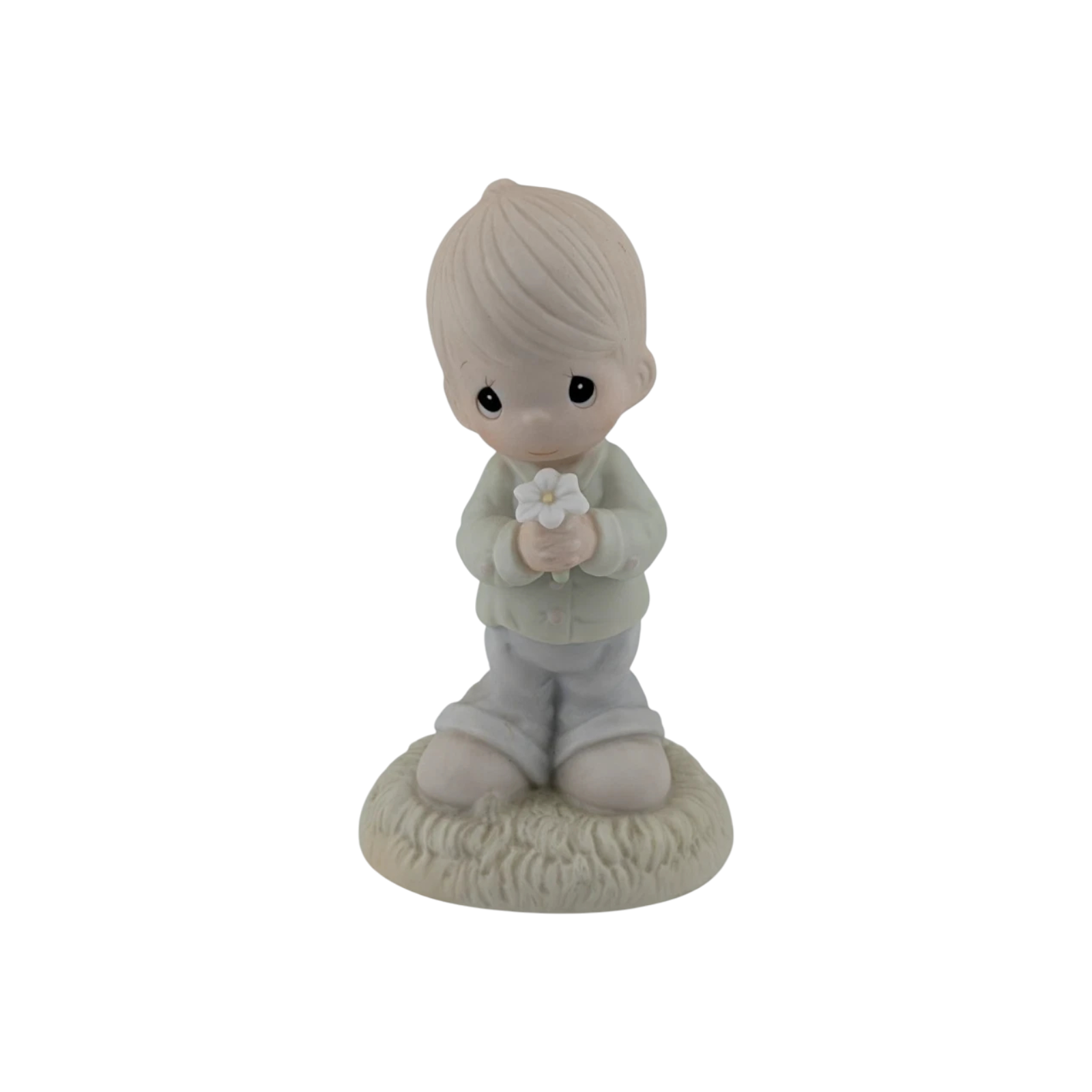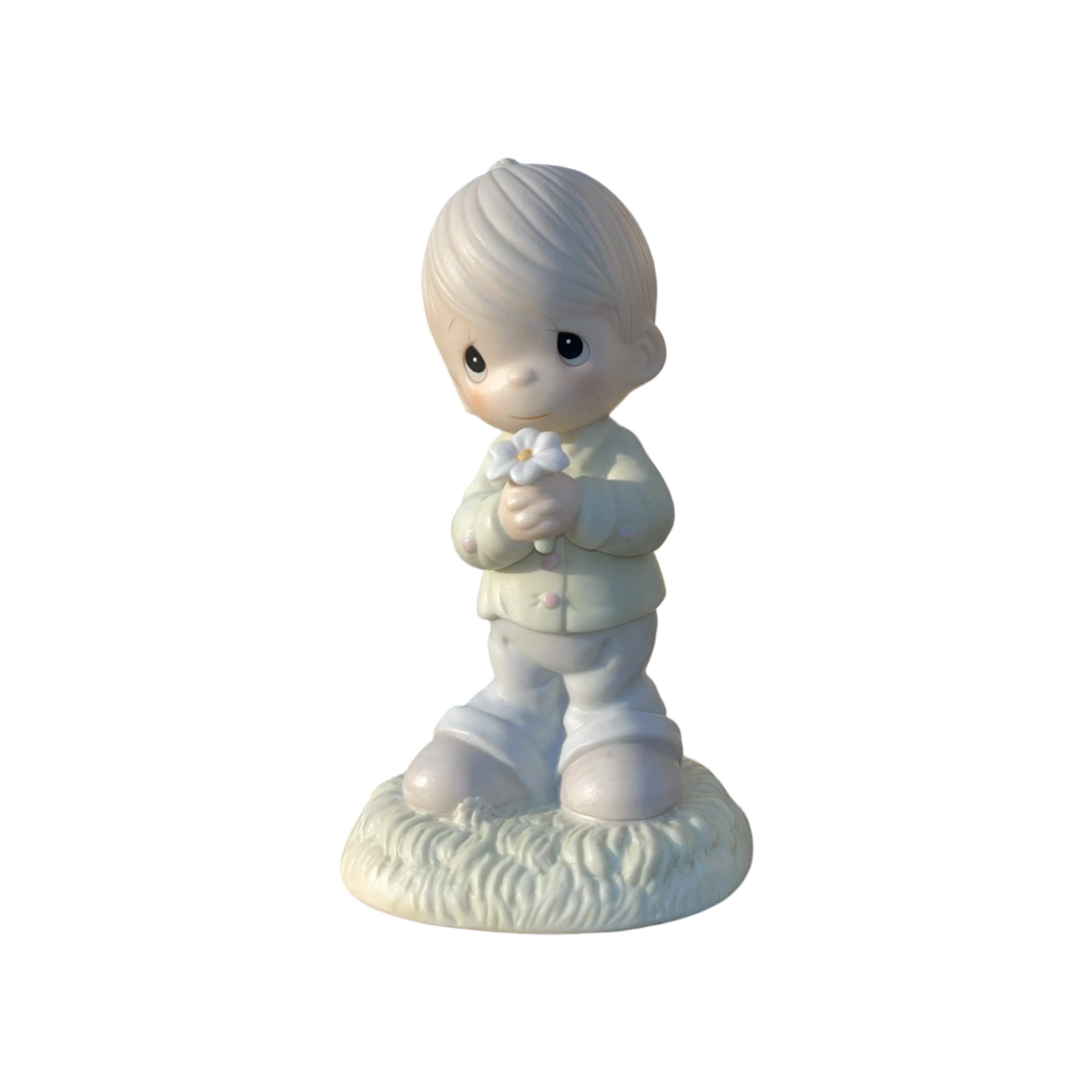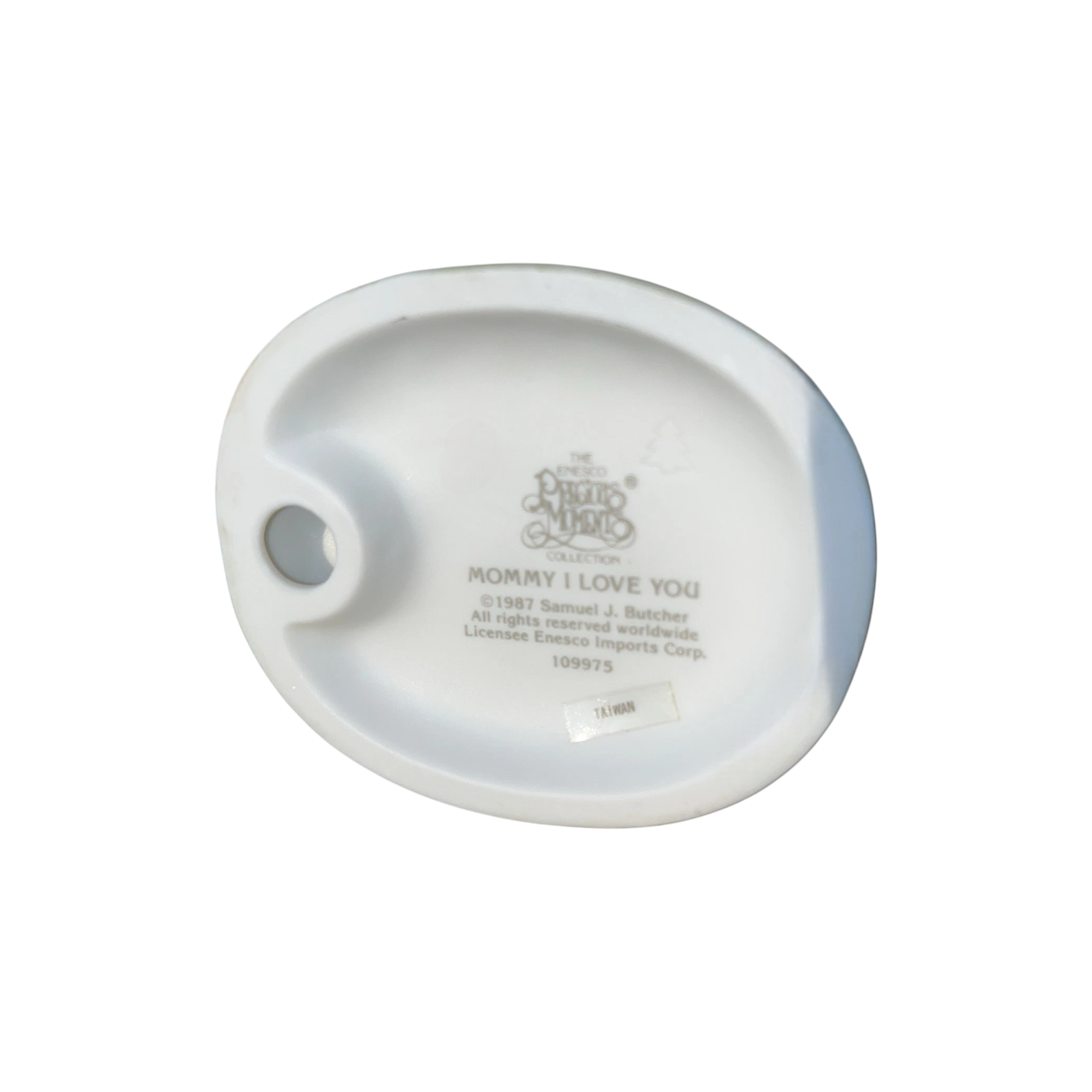 Capture a moment of tender affection with the 1987 Mommy I Love You (Precious Moments) figurine, model #109975. In classic Precious Moments style, the delicate porcelain piece features a sweet, downcast young boy gently holding a single flower behind his back—as though preparing a surprise gift for his mother. The soft pastels, matte finish, and signature teardrop eyes lend a timeless aura of innocence and love, making this piece a touching gift or collectible to honor motherhood.