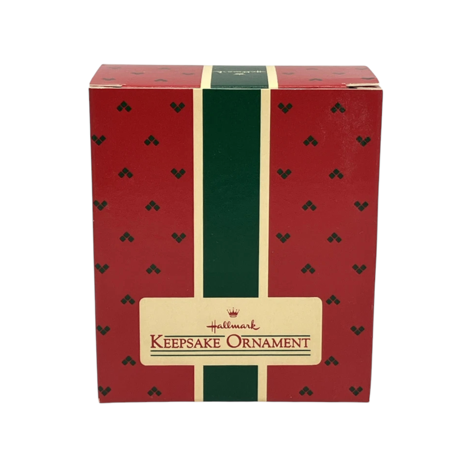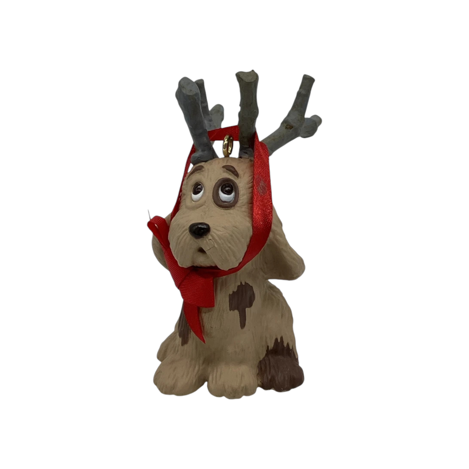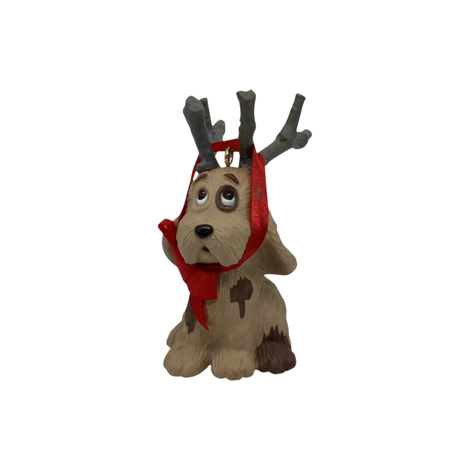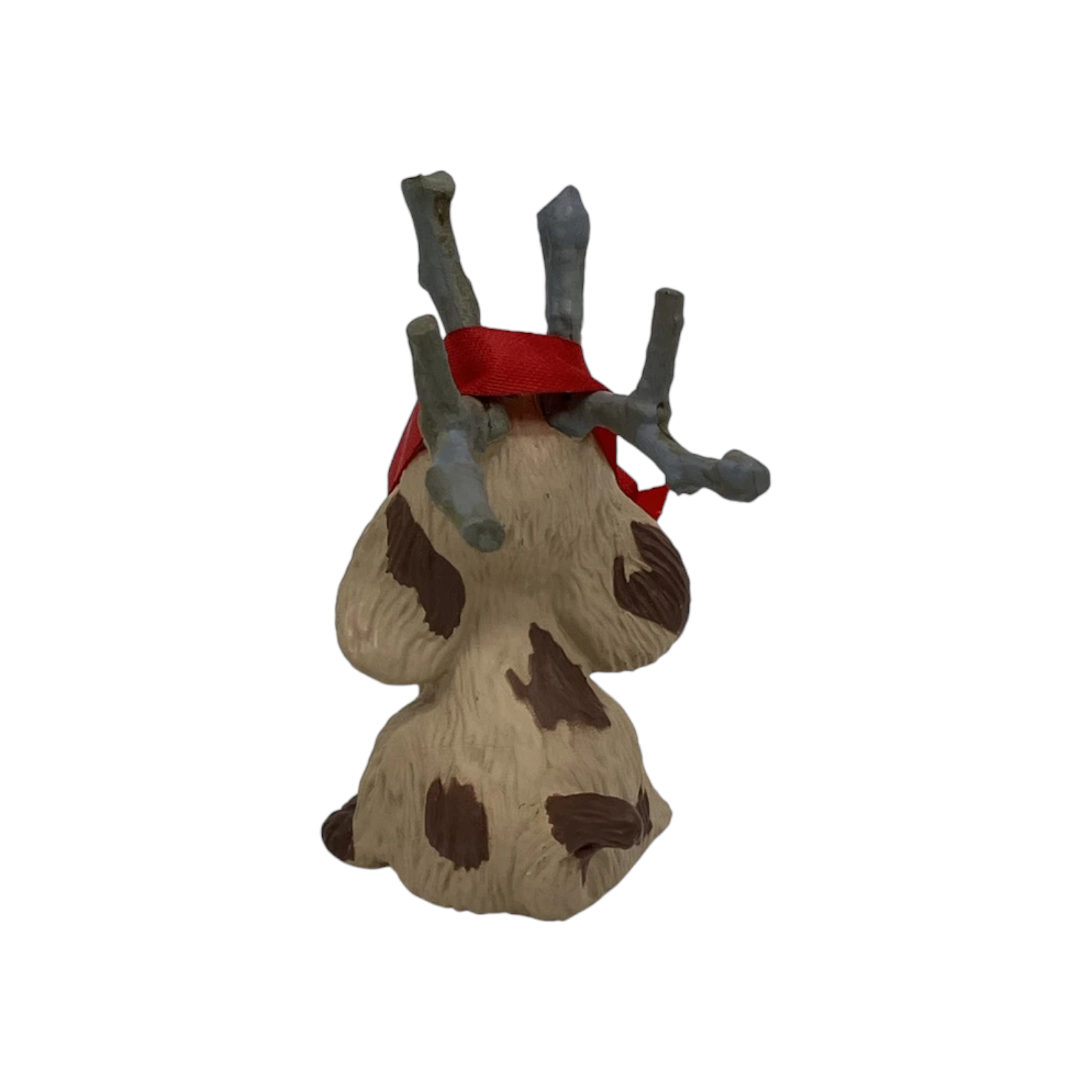 The 1987 Reindoggy ornament is a playful Hallmark creation featuring an adorable brown puppy dressed up as a reindeer for Christmas. The dog wears a pair of antlers and a red nose, proudly posing as “Santa’s little helper.” Its sweet, smiling face and festive holiday colors capture the heartwarming humor typical of Hallmark’s 1980s ornaments. Made of hand-painted resin, this ornament comes with its original Hallmark box and hanging cord. It is a non-lighted, non-mechanical piece meant purely for display and holiday cheer.