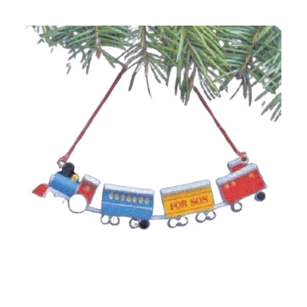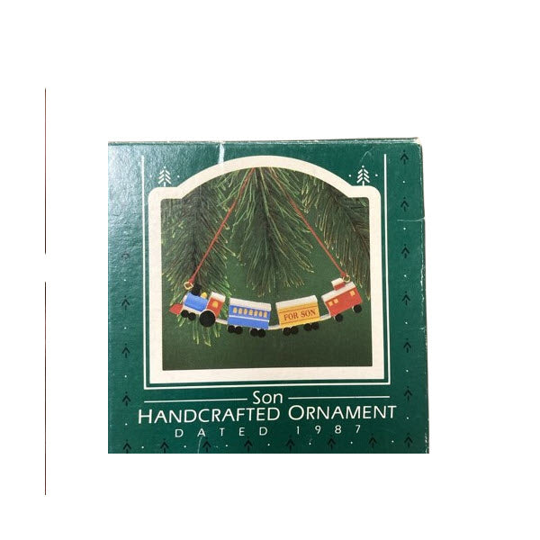 Chug into Christmas nostalgia with the 1987 Son Train ornament—a colorful four-car train featuring a locomotive, passenger car, freight car stamped “Christmas 1987,” and a caboose with “For Son.” Designed by Linda Sickman, this cedar-hued keepsake typically arrives in its original Collector’s Series box with the decorative hang‑tag. No batteries or lights are needed—just clip it on and enjoy. The articulated cars convey a charming motion even at rest.