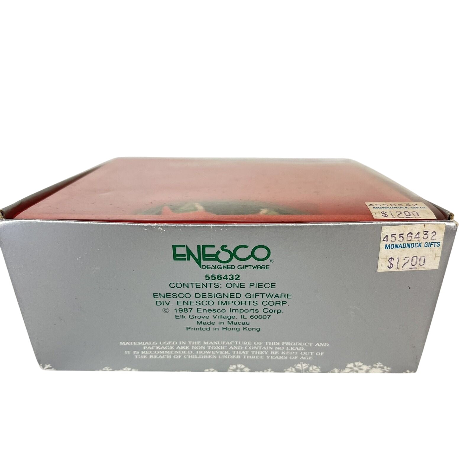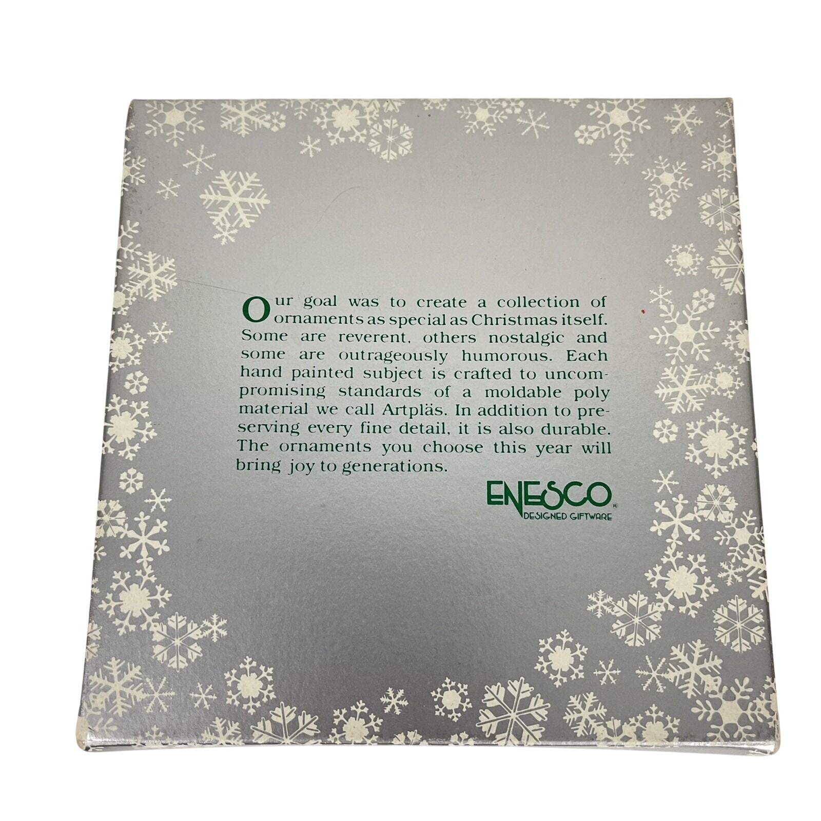The 1987 Two Turtledoves ornament is the second piece in Enesco’s elegant Twelve Days of Christmas series. This lovely collectible features two white doves nestled together on a leafy branch, symbolizing love, peace, and unity. Their wings are delicately detailed, and the ornament is hand-painted in soft ivory tones with gentle pastel and gold accents. The design beautifully reflects the romantic charm of the classic Christmas carol. Crafted from fine porcelain, this piece includes its original Enesco box and gold hanging cord. It’s a non-illuminated, purely decorative ornament perfect for traditional holiday displays.
