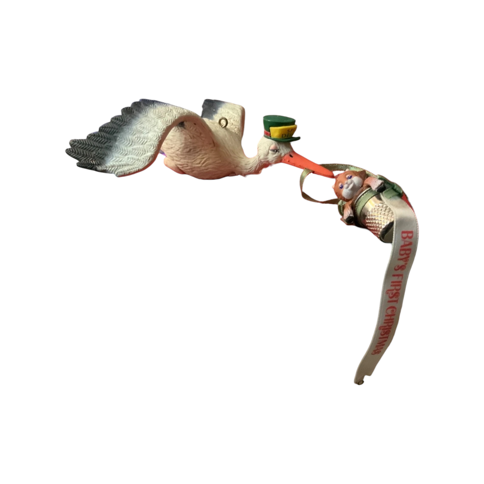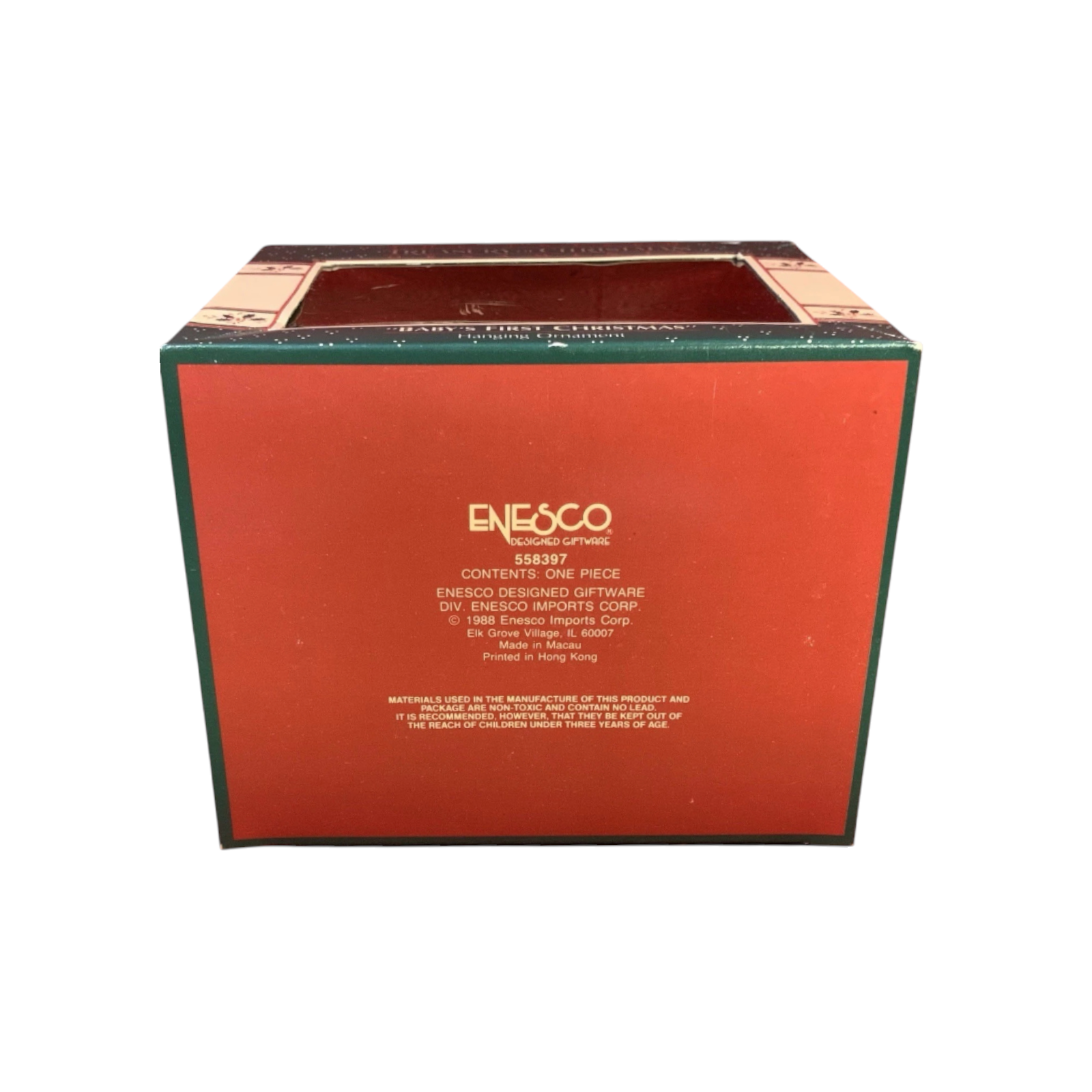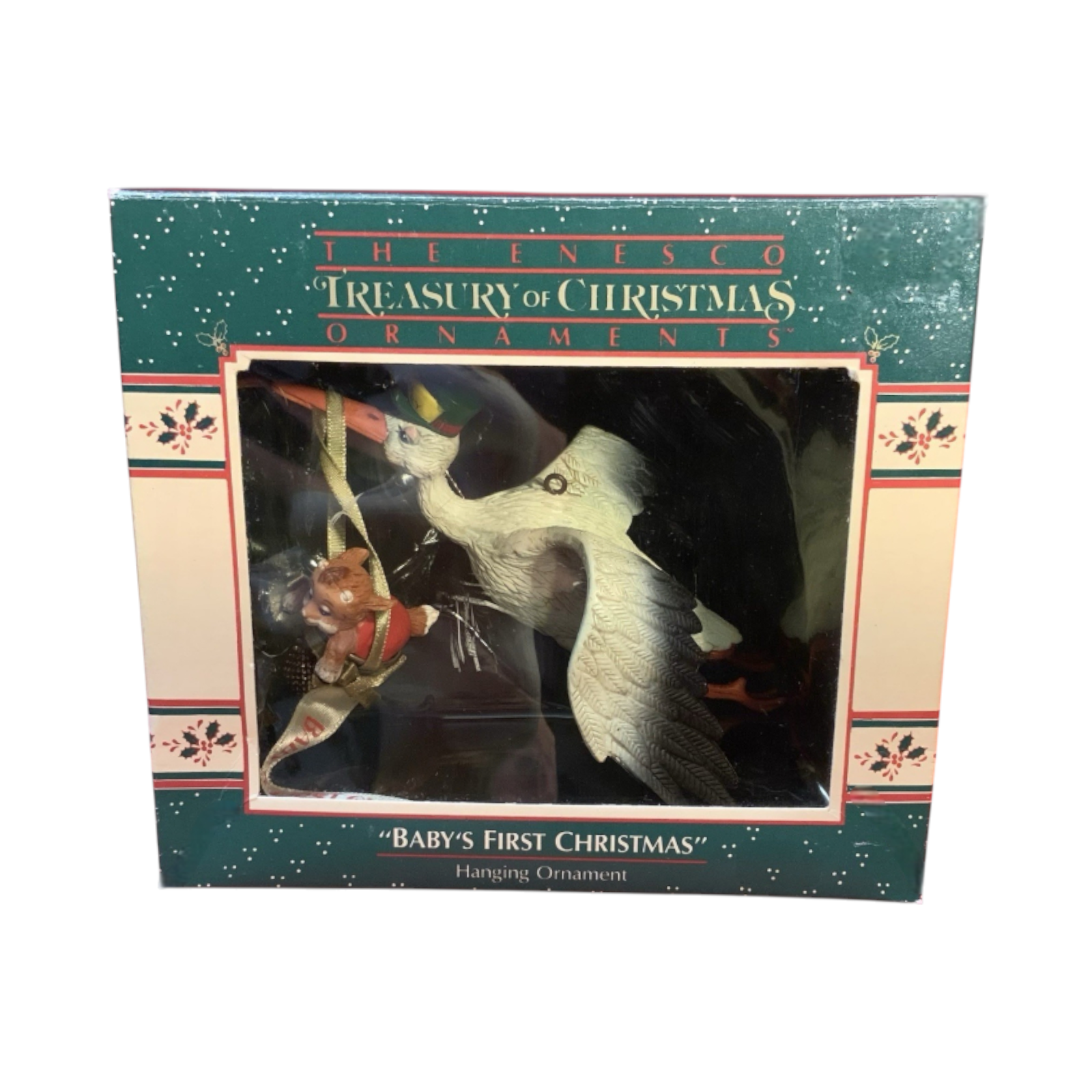 Celebrate life’s sweetest milestone with the 1988 Enesco “Baby’s First Christmas” ornament. This heartwarming collectible features an adorable baby bird nestled in a festive stocking, symbolizing love, joy, and new beginnings. Hand-painted in soft pastel tones with Enesco’s signature craftsmanship, it beautifully captures the tenderness and innocence of a child’s first holiday season. A timeless keepsake for parents and collectors alike, this ornament is a perfect reminder of the wonder and warmth of that very first Christmas.
