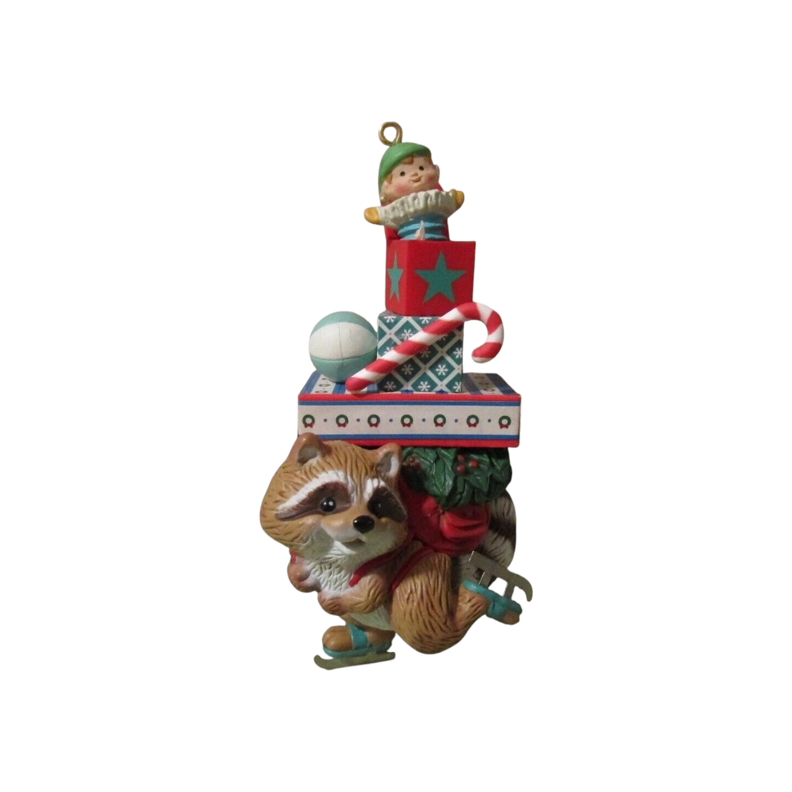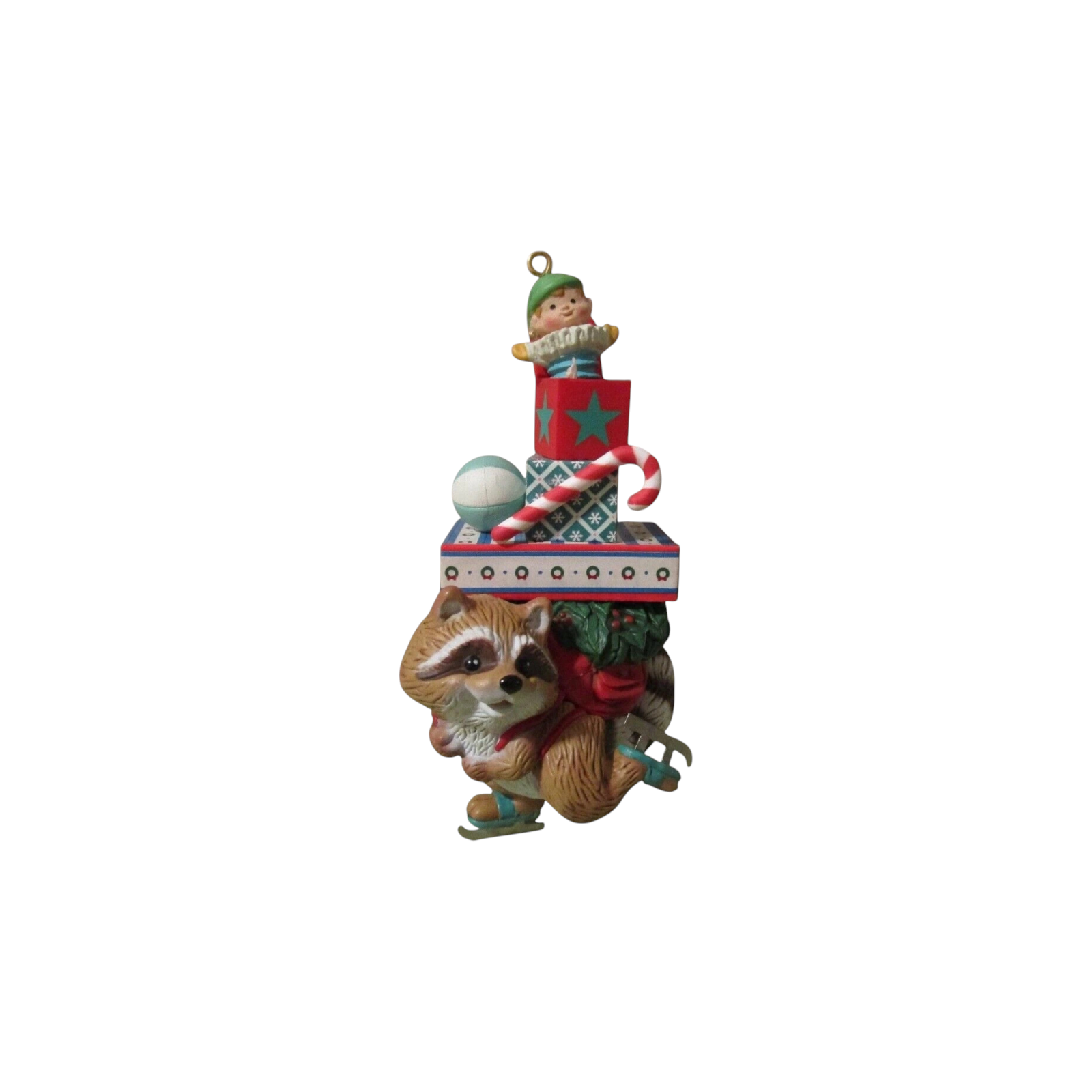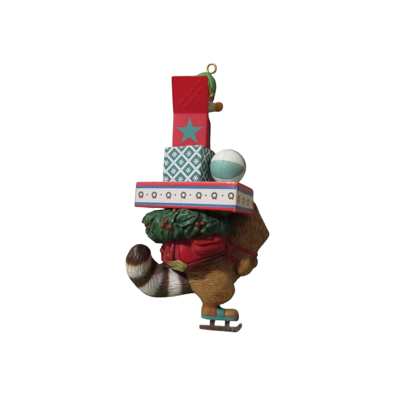 The 1988 Bundles of Joy ornament by Carlton Cards is an adorable woodland-themed collectible featuring a cheerful raccoon dressed in cozy winter attire. The raccoon is bundled up in a red knit hat and green scarf, carrying a stack of colorfully wrapped Christmas presents tied with golden ribbons. His wide-eyed, joyful expression perfectly captures the excitement of gift-giving and the spirit of the season. This ornament is part of Carlton’s 1988 holiday line, known for its detailed hand-painted designs and warm, nostalgic charm. Made from durable resin, it typically includes its original box and hanging cord. No batteries, cords, or lights are needed—just a smile-worthy addition to any tree.