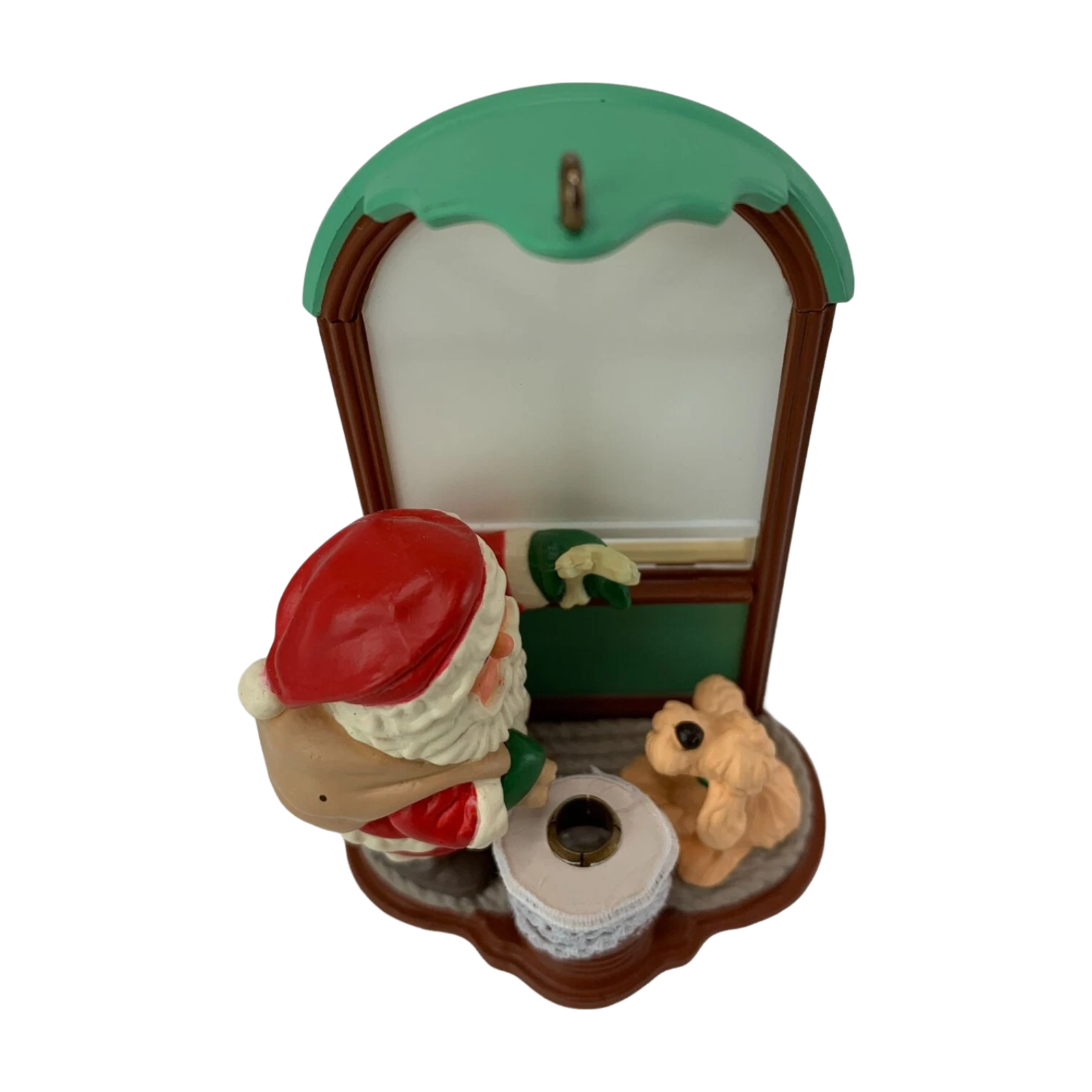 Materials: Painted resin/plastic Santa figure, molded window frame, light bulb socket, mirror-like plaque for shadow projection