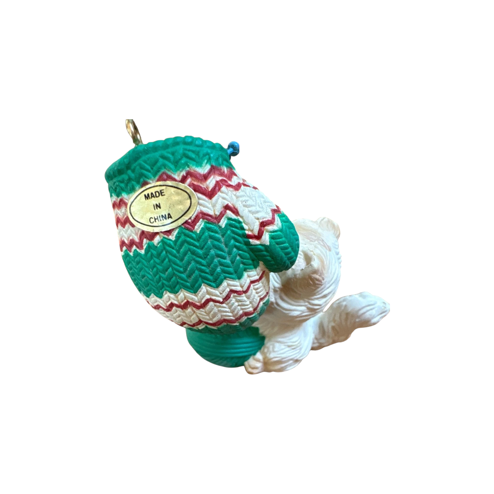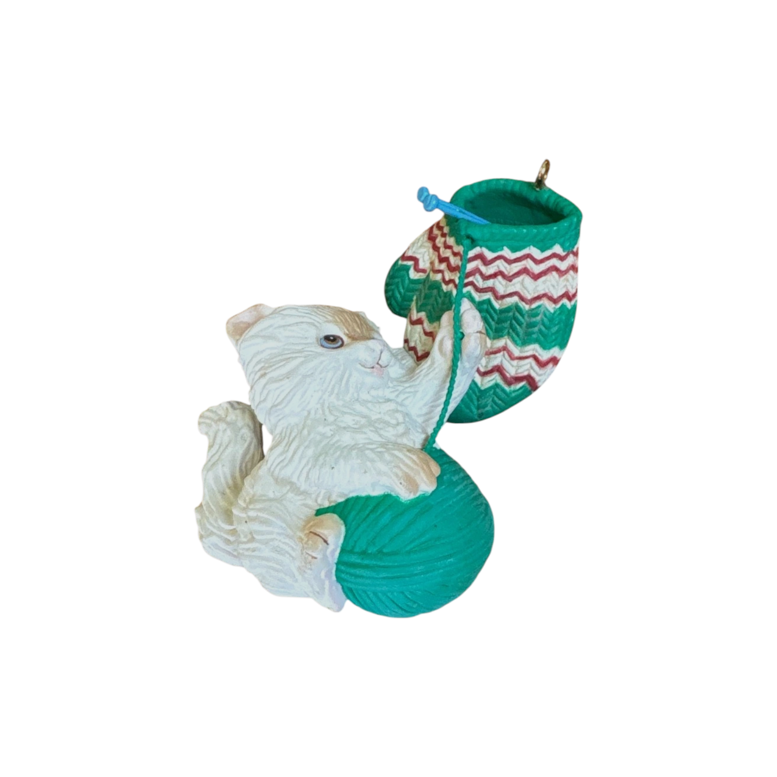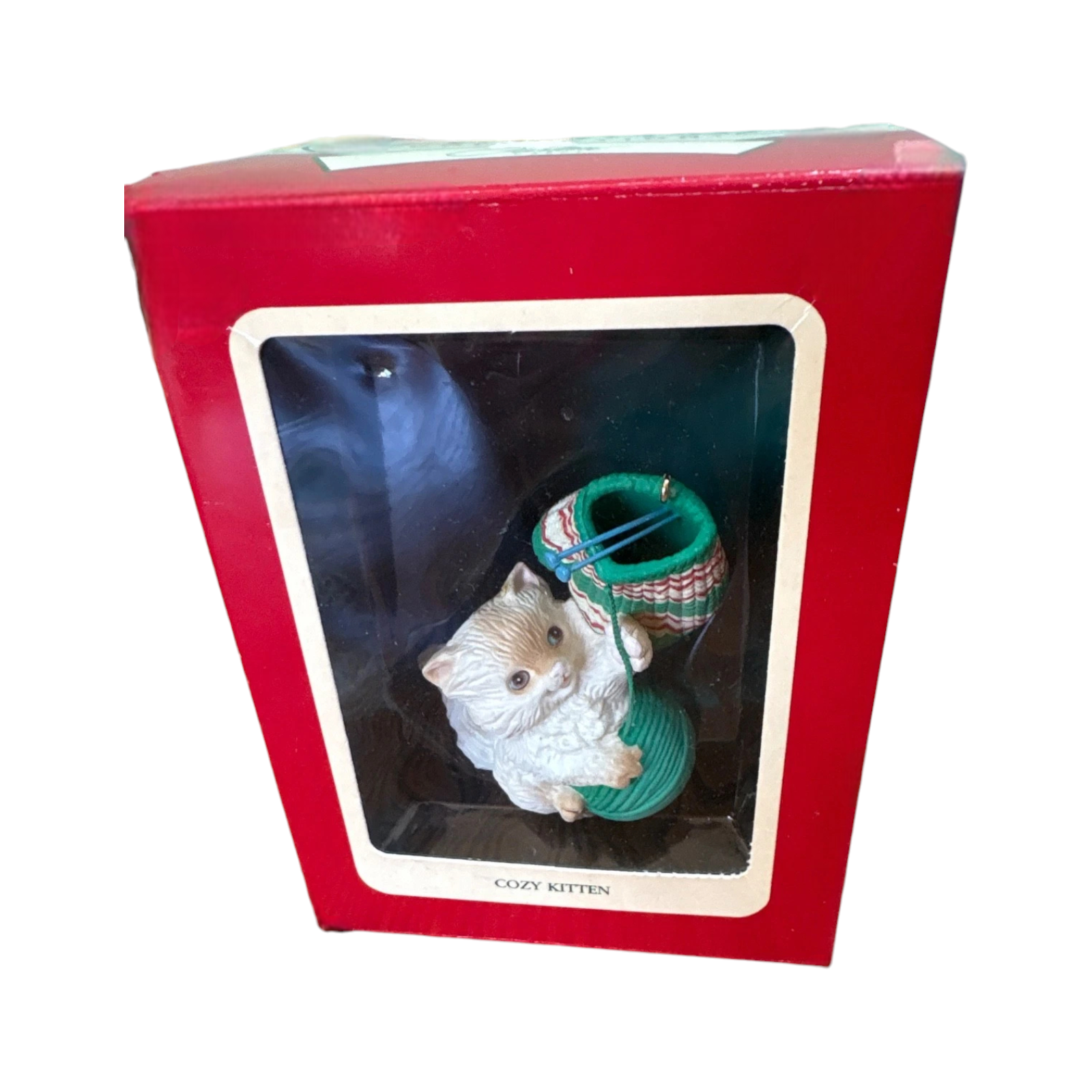 The 1988 Cozy Kitten ornament by Carlton Cards is an irresistibly sweet collectible that captures the warmth and comfort of the holiday season. This charming piece features a fluffy white kitten curled up inside a bright red Christmas stocking trimmed with white fur. The kitten’s sleepy eyes and tiny pink nose peek out adorably from the top, creating a cozy and heartwarming holiday scene. The stocking is accented with festive holly leaves and berries, showcasing Carlton’s attention to fine hand-painted detail and cheerful 1980s style. Made of durable resin, the ornament typically includes its original Carlton Cards box and hanging cord. No lights, cords, or batteries are required—just timeless Christmas charm.