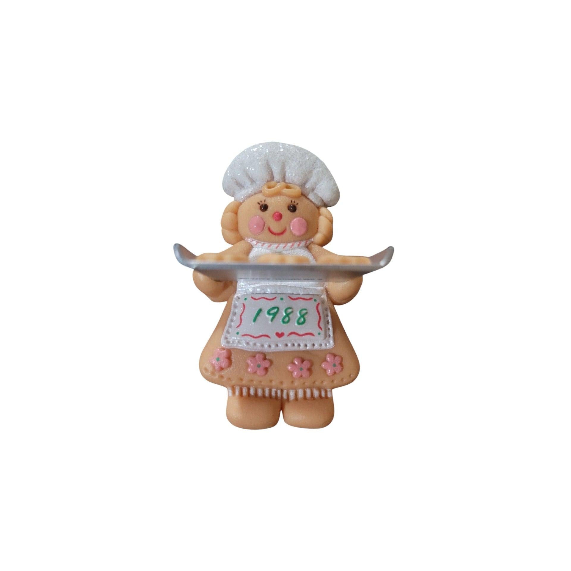 Sweeten the holidays with Daughter, a charming 1988 gingerbread baker ornament featuring a smiling gingerbread girl in a white “frosted” cap and apron, holding a cookie tray of tiny gingerbread men with “Daughter” written across it in red script. The apron is dated 1988, making it a nostalgic, year-specific keepsake that’s perfect for honoring a daughter on the tree. In new condition, it typically comes packaged in its original Hallmark box for safe storage and gifting. No batteries, cords, or light strings are required—just hang and enjoy.