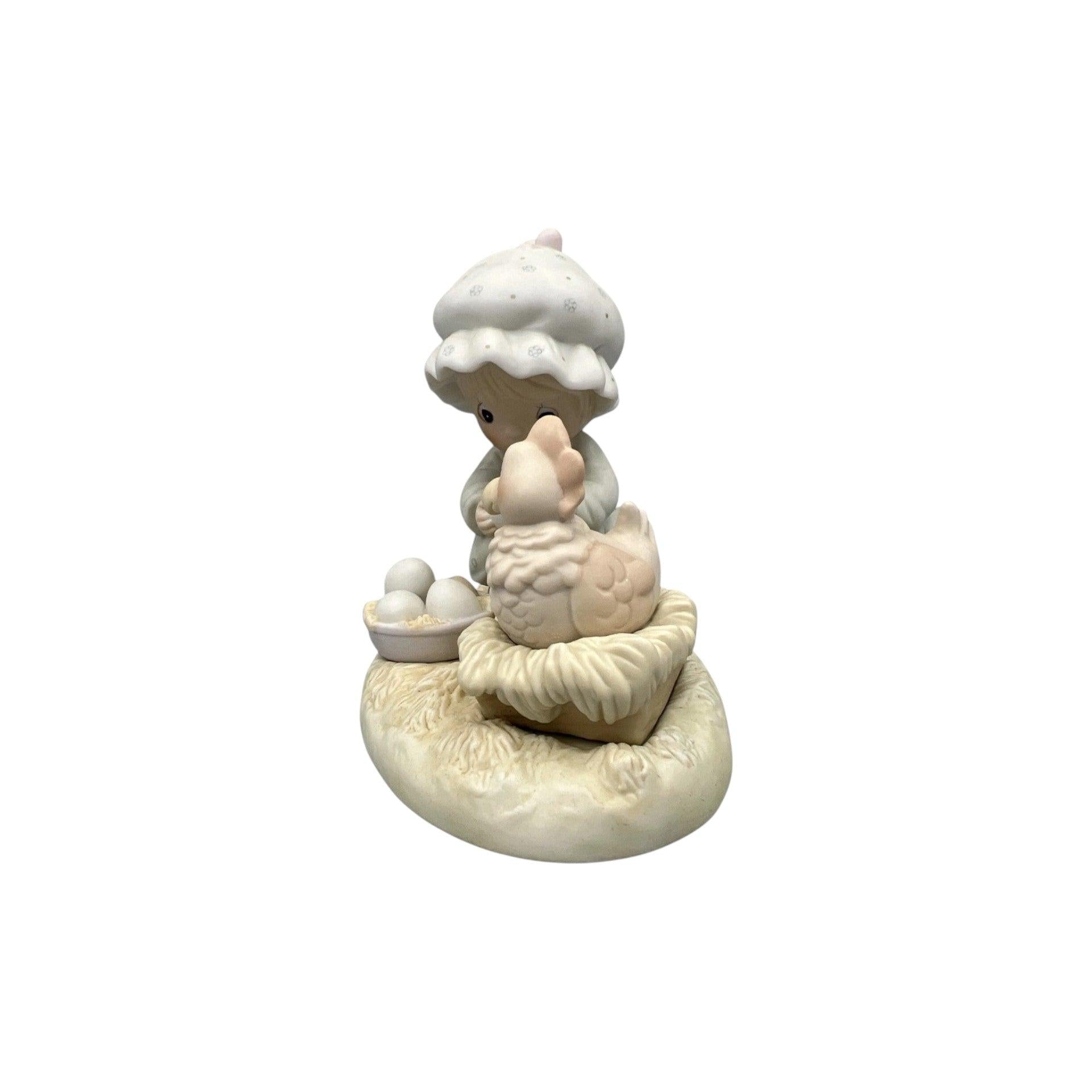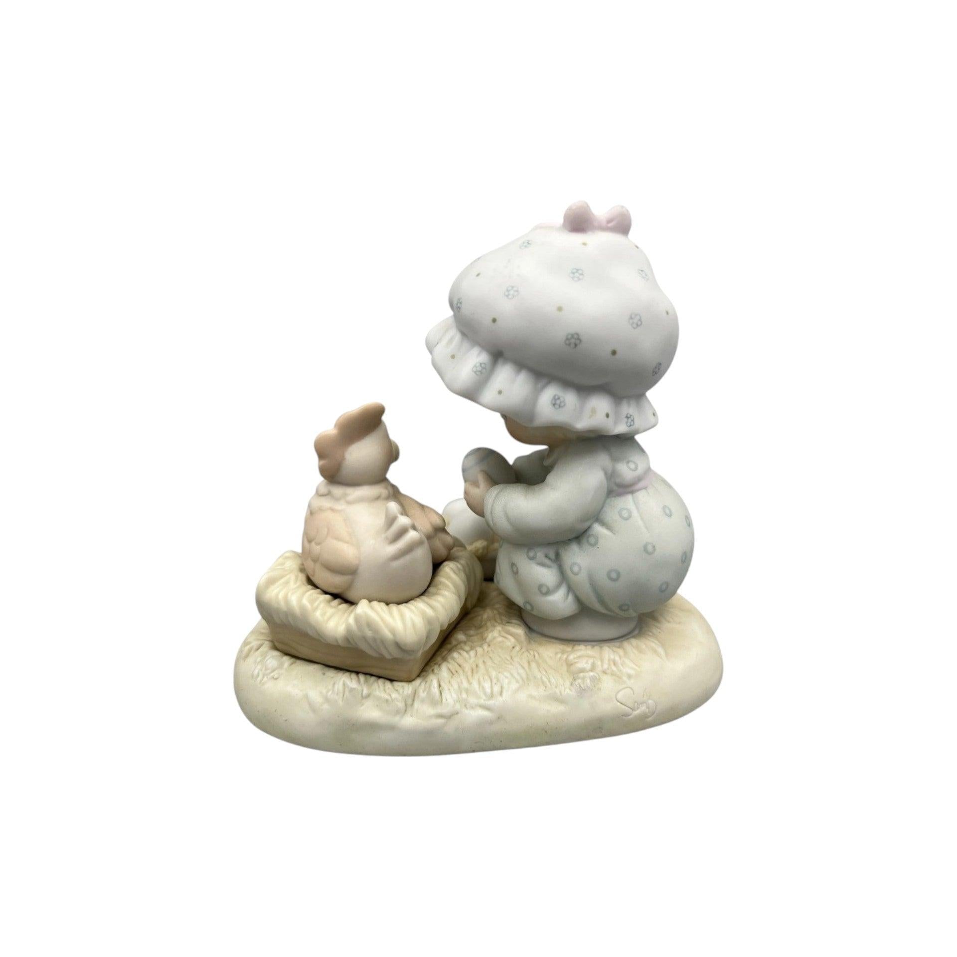 This adorable Precious Moments porcelain figurine shows a young girl delightfully presenting a colorful Easter egg to a curious little chicken beside her. Part of the Precious Editions line, the piece conveys gentle springtime charm with delicate pastel colors and the signature tender expressions that define Precious Moments collectibles. It’s a nostalgic and whimsical Easter keepsake from the late 1980s.