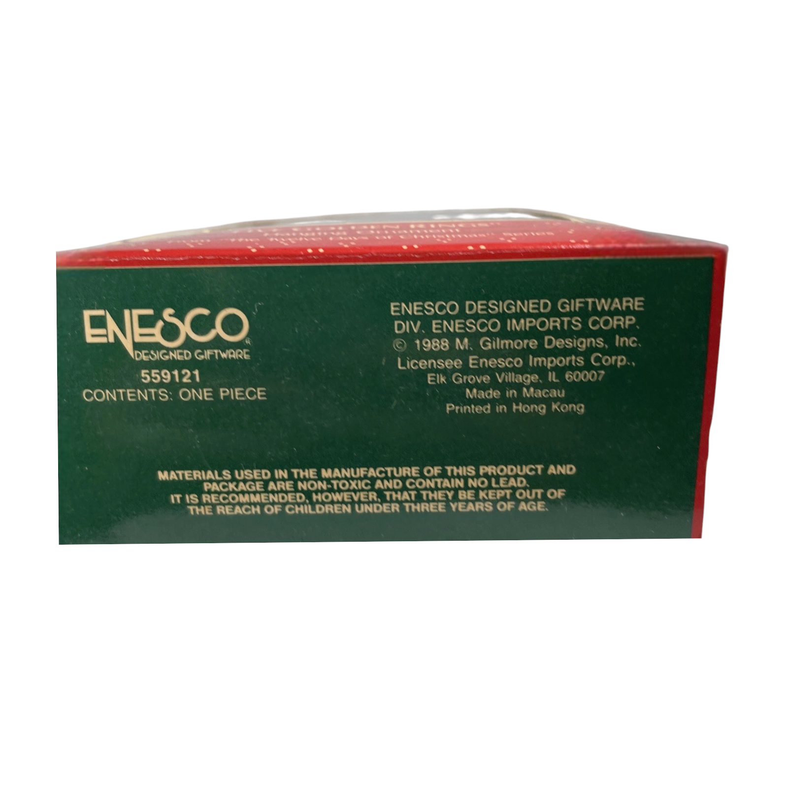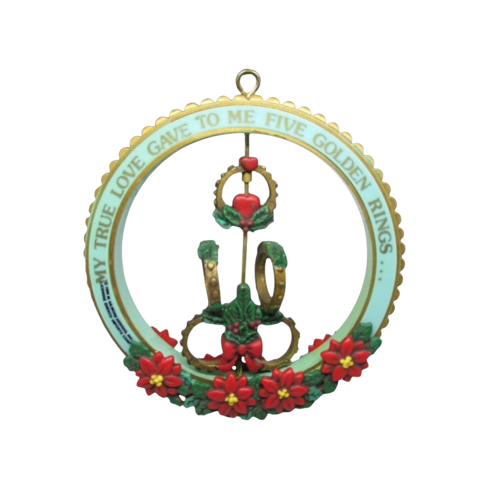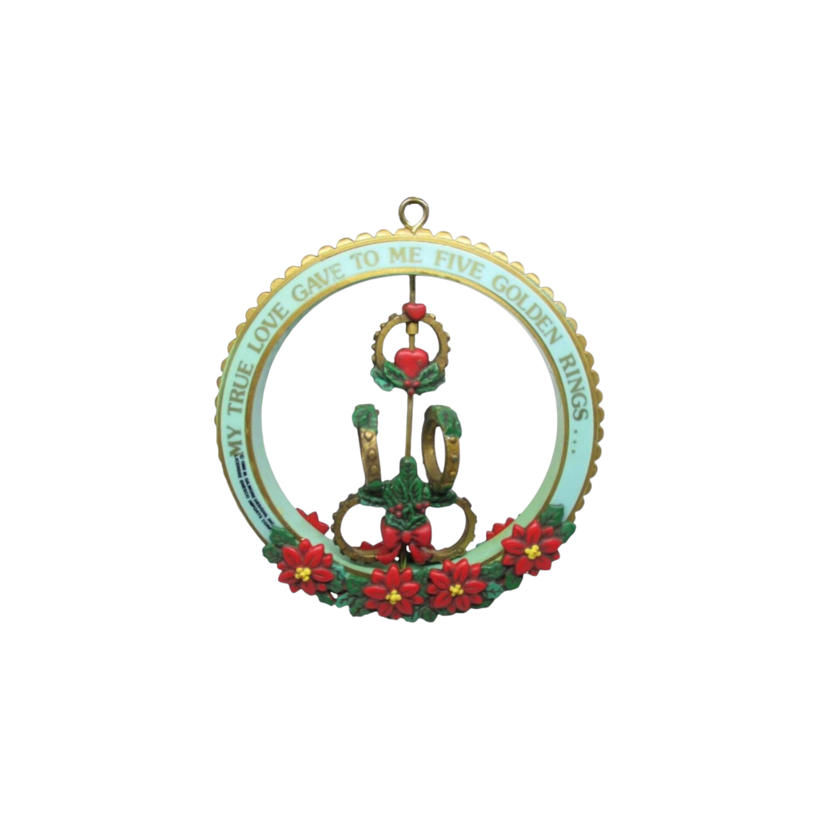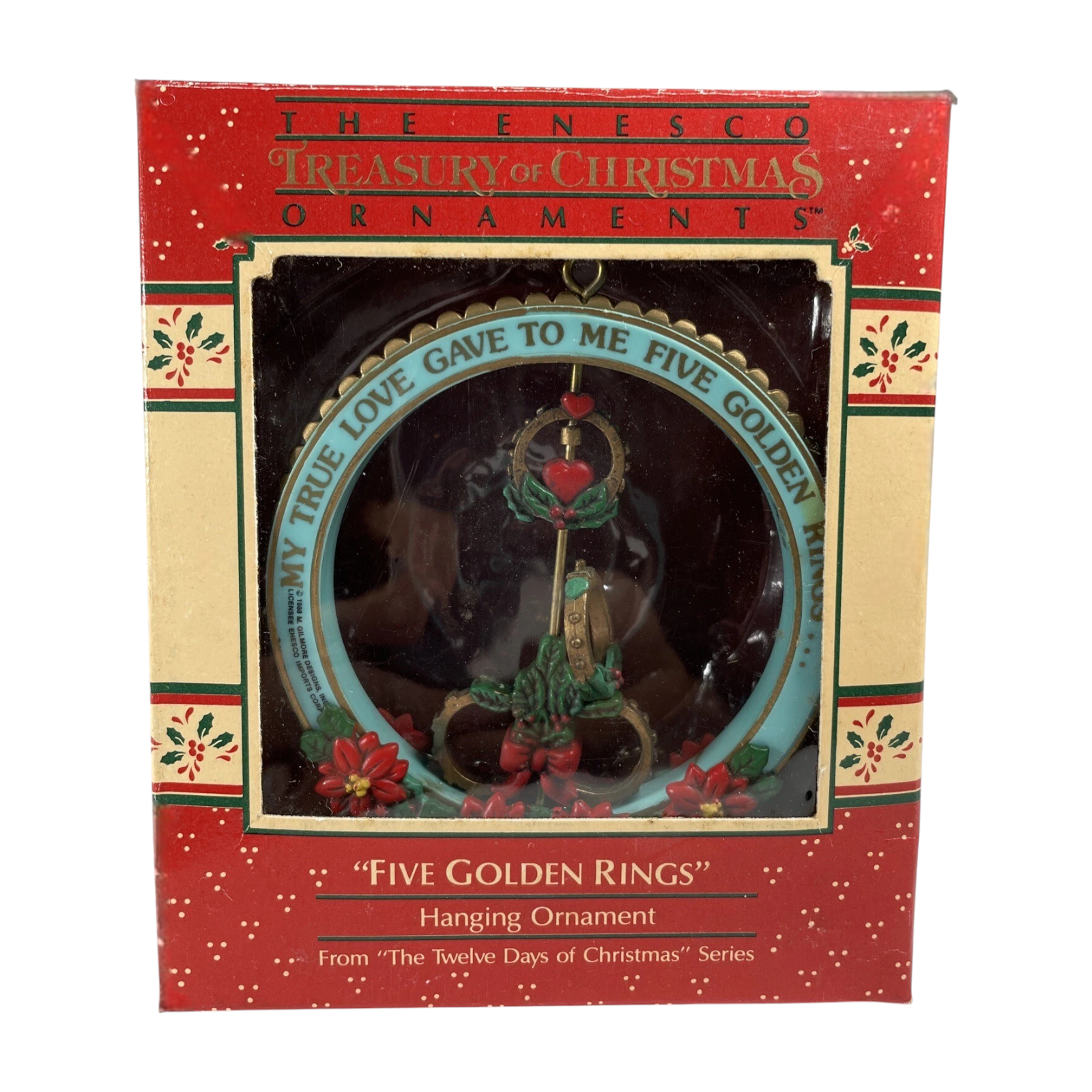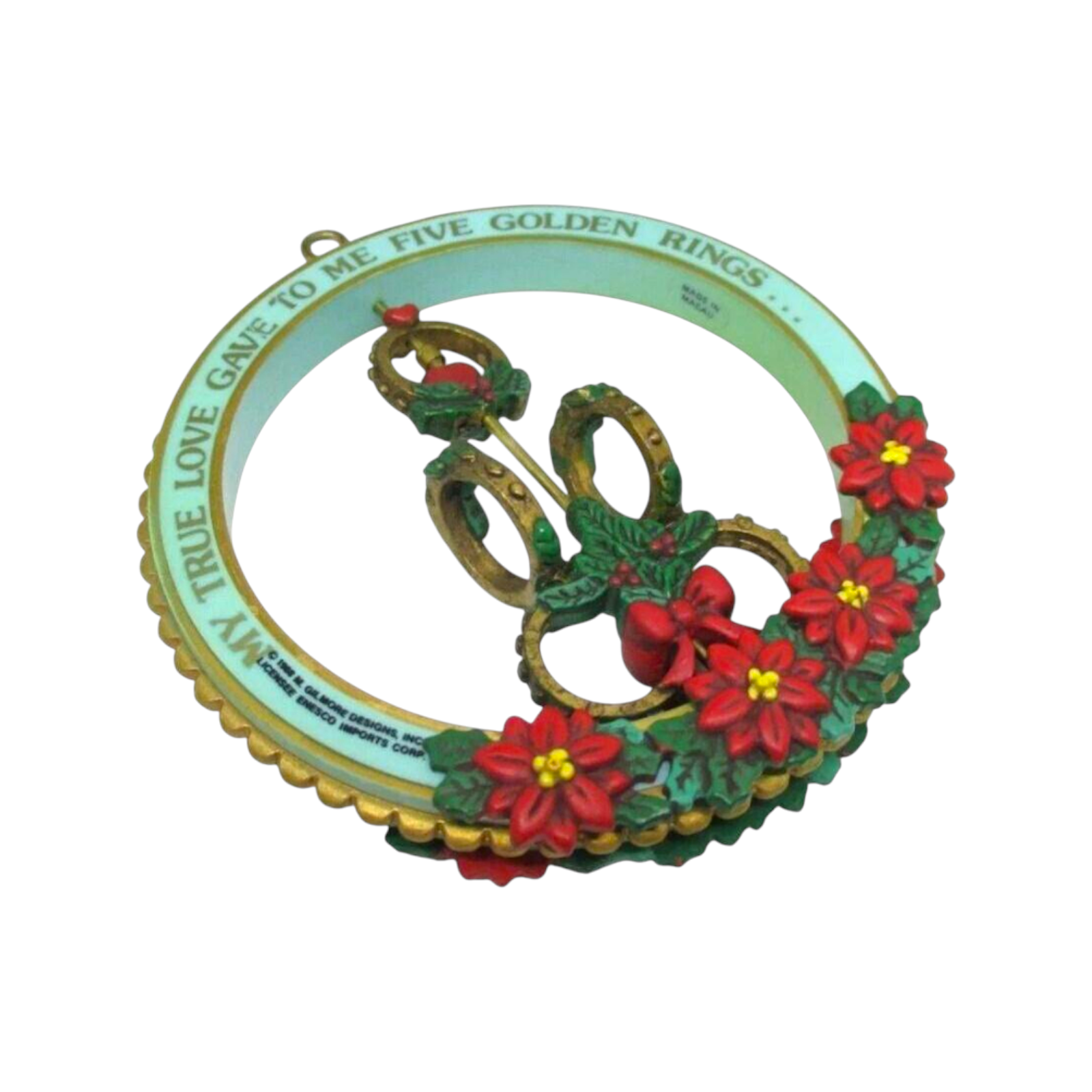 Celebrate the festive tradition with this elegant 1988 “Five Golden Rings” ornament from Enesco’s “Twelve Days of Christmas” series. The design presents five intertwined golden rings arranged in a wreath-style motif, hand-painted with shimmering metallic gold finish and accented with a classic holly & berry detail. The fine craftsmanship and thematic tie to the beloved holiday carol make it a standout piece for collectors and vintage décor enthusiasts alike. Whether displayed as part of the full 12-days set or as a standalone focal ornament, it offers both visual elegance and nostalgic appeal.