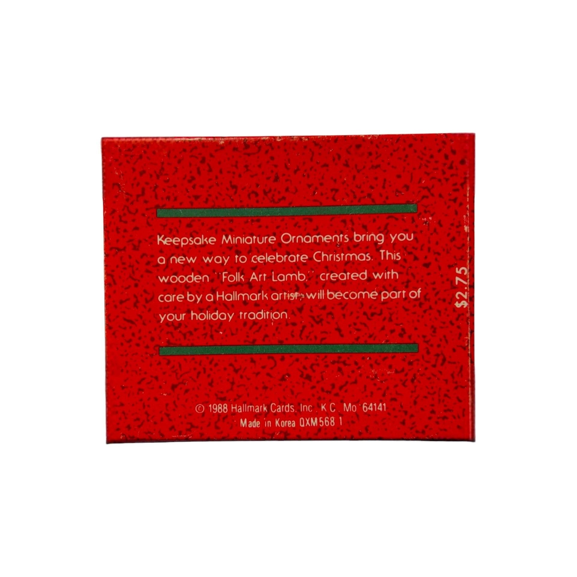 This 1988 ornament features a charming folk art–style lamb, reflecting the handcrafted, rustic aesthetic popular in Hallmark designs of the late 1980s. The lamb is typically depicted with simplified shapes, painted details, and a warm, country-inspired look that evokes traditional folk art and cozy farmhouse charm. The ornament usually comes with its original Hallmark box and is intended purely for decorative display. It does not include lights, motion, or sound features, so no batteries, cords, or light strings are required.