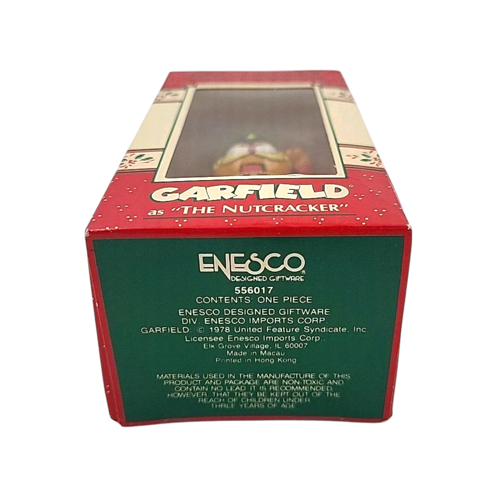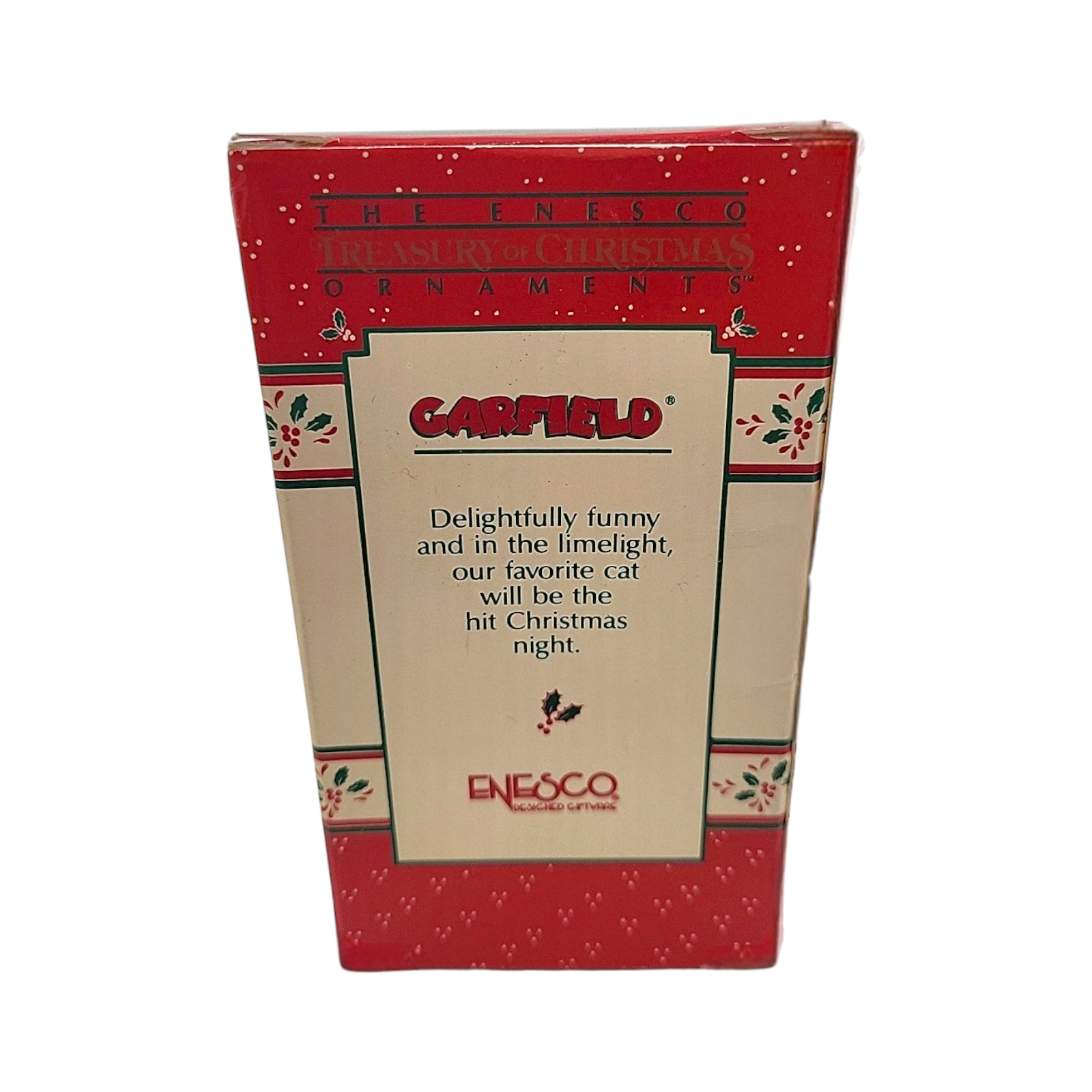 This charming 1988 (or late 1980s) ornament features the beloved comic-strip cat Garfield dressed in full Nutcracker regalia—bright red soldier’s jacket trimmed with gold braid, tall black shako hat, white pants and Garfield’s trademark grin. Produced by Enesco, the piece is molded from hand-painted plastic/resin and stands about 3.5 inches tall, making it a merry standout on any Christmas tree.