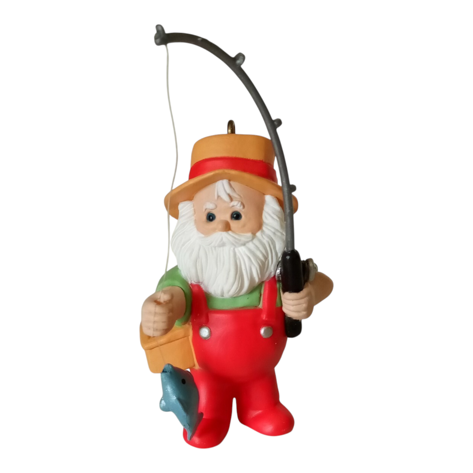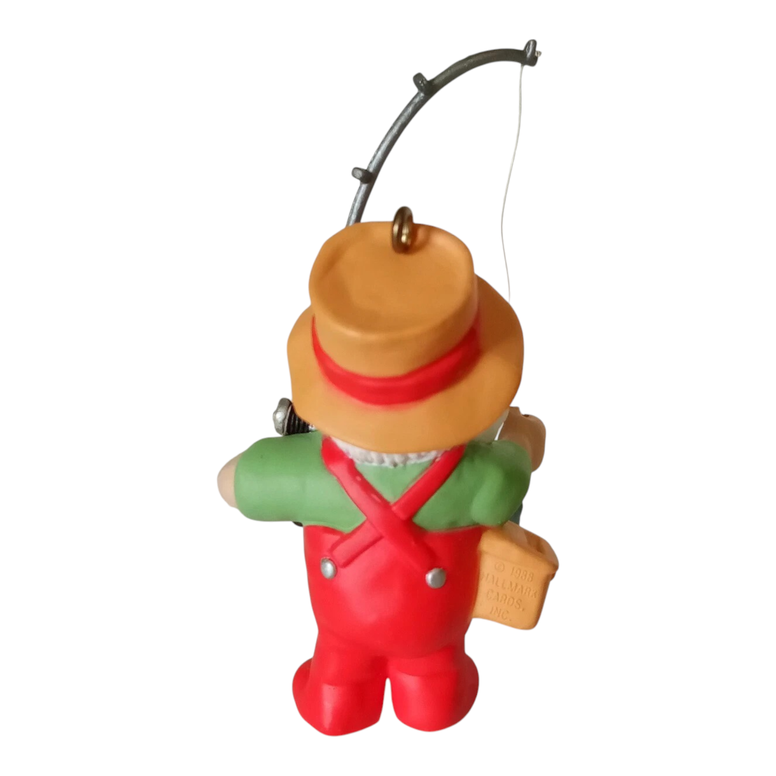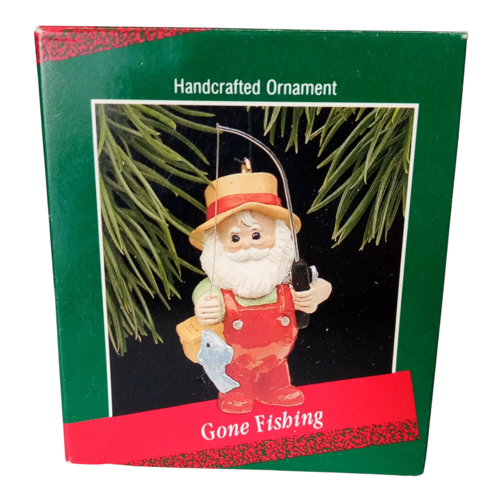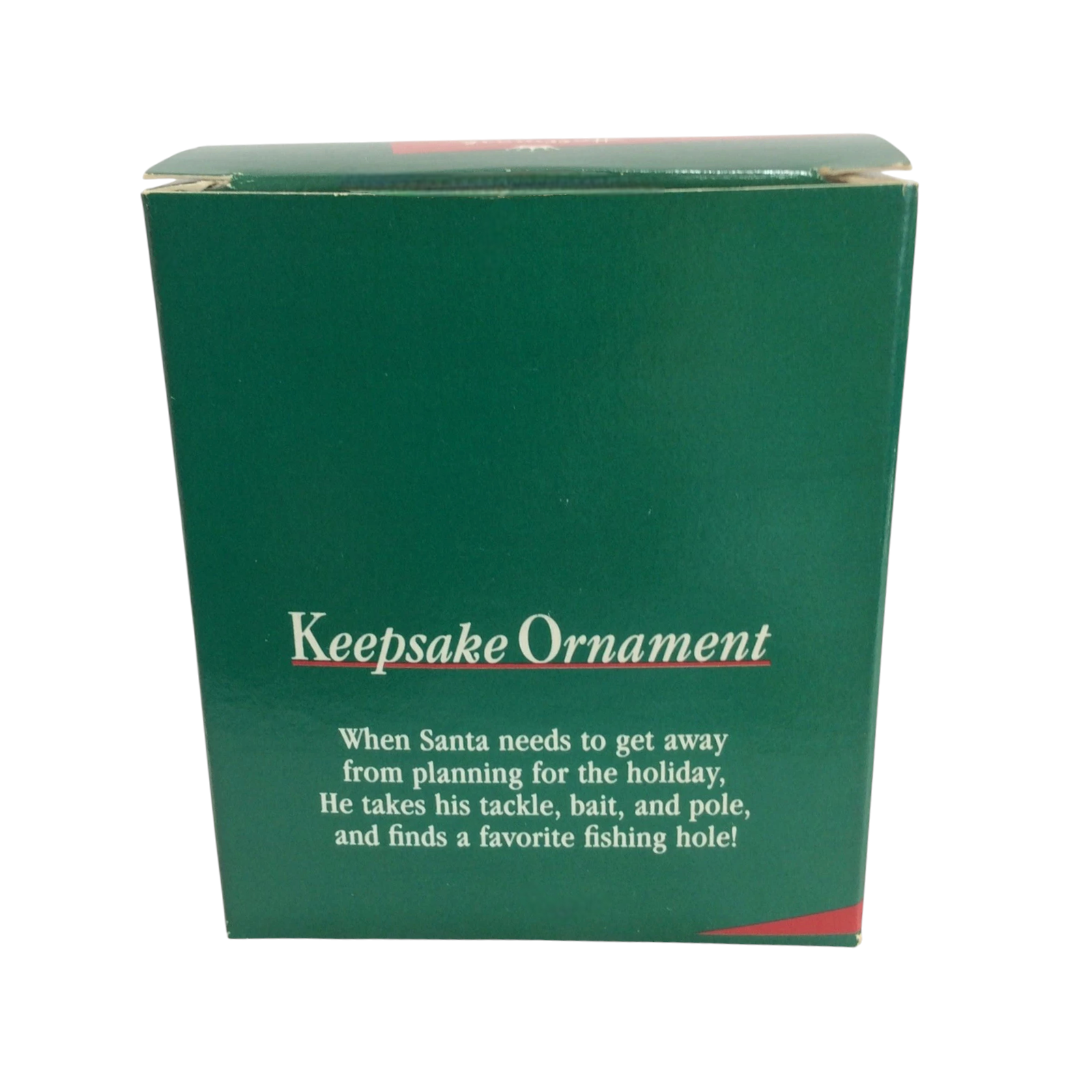 This 1988 ornament from the Hallmark Keepsake line features Santa Claus relaxing in a fishing boat with his rod in hand and a fish on the line—evoking a tranquil holiday pastime with a whimsical twist. Designed by artist Bob Siedler, the approximately 3″ high design showcases fine detail and autumnal décor tones, making it an appealing piece for collectors interested in hobbies, Santa motifs, or late-’80s Hallmark releases.