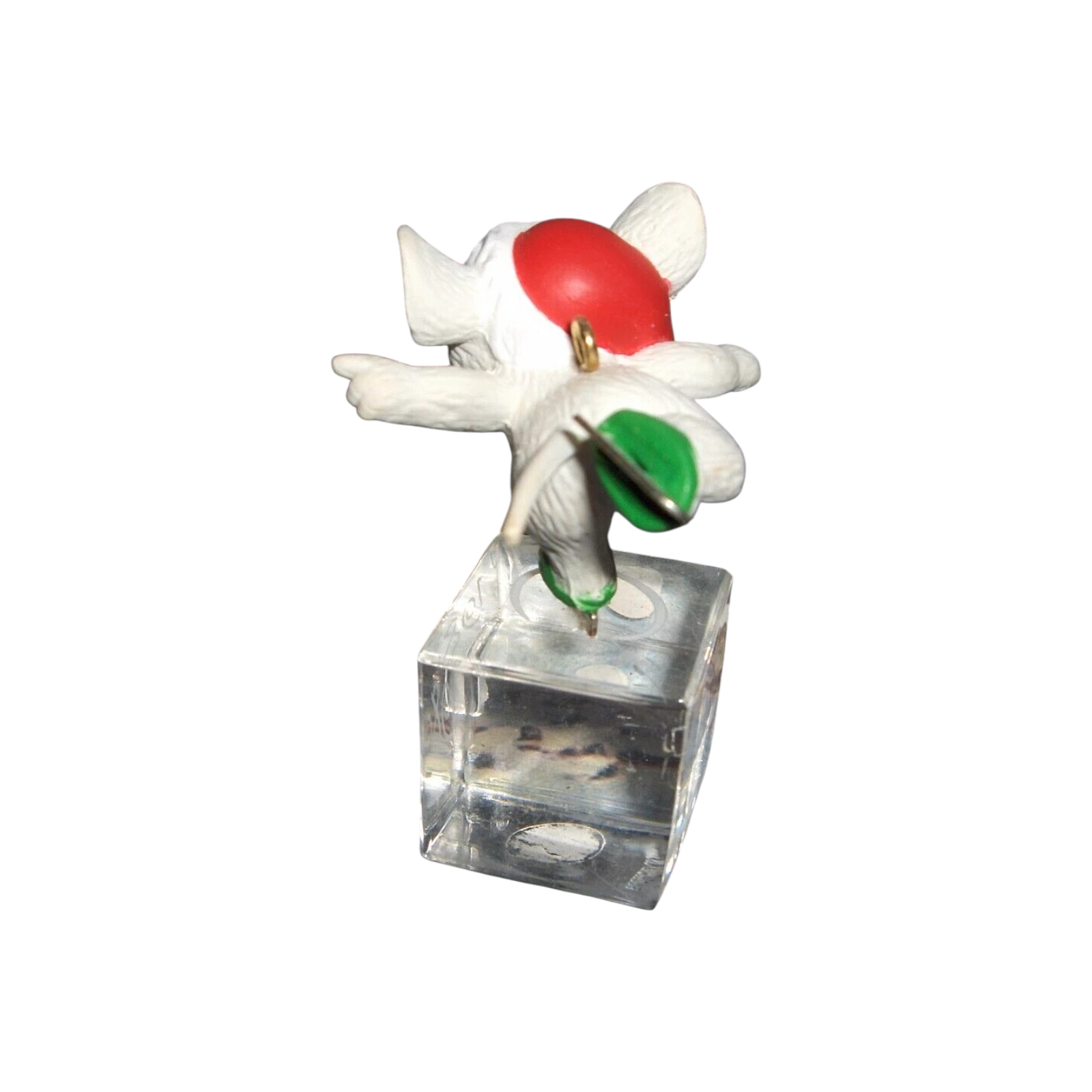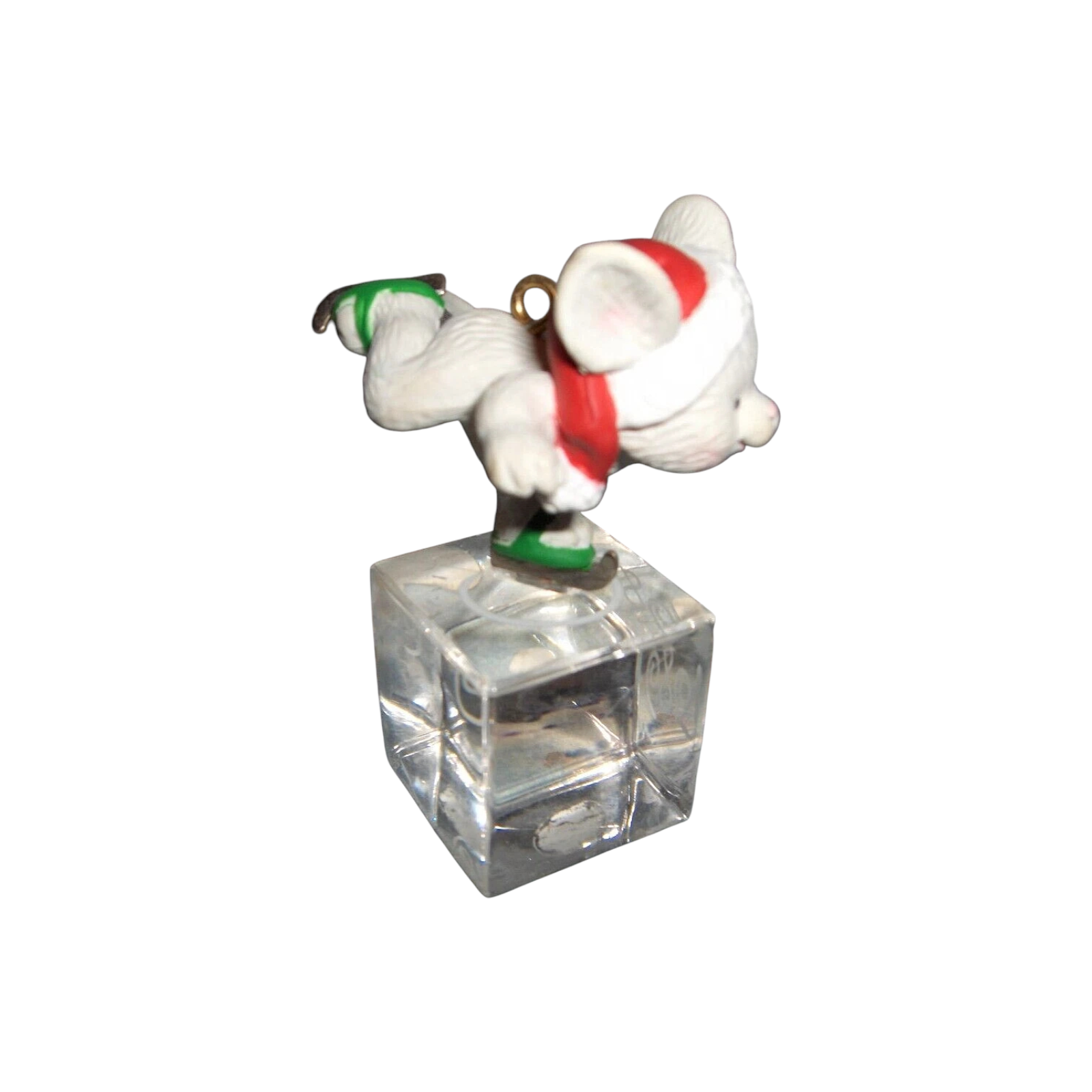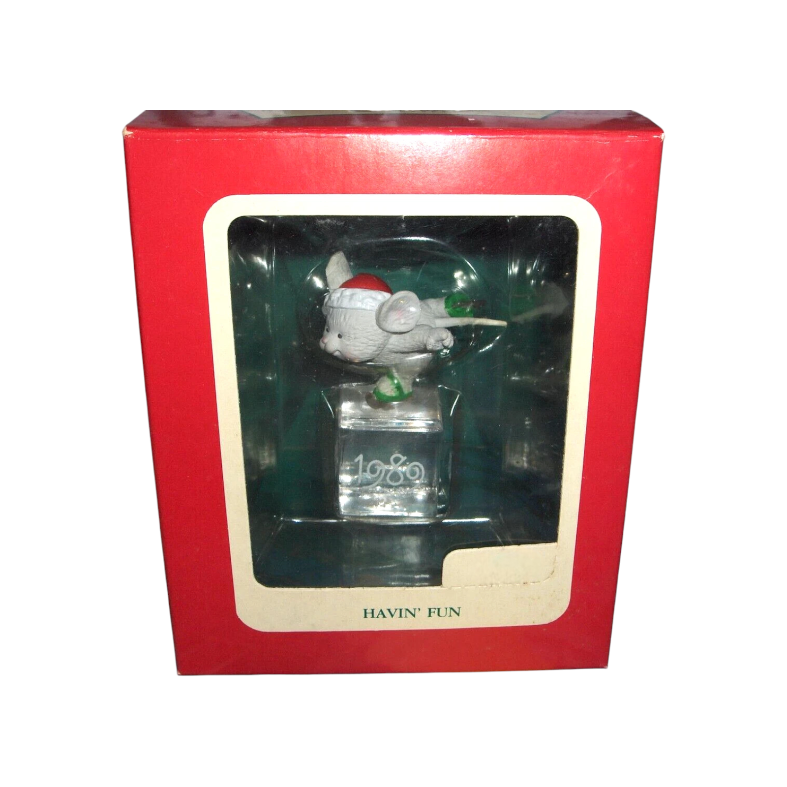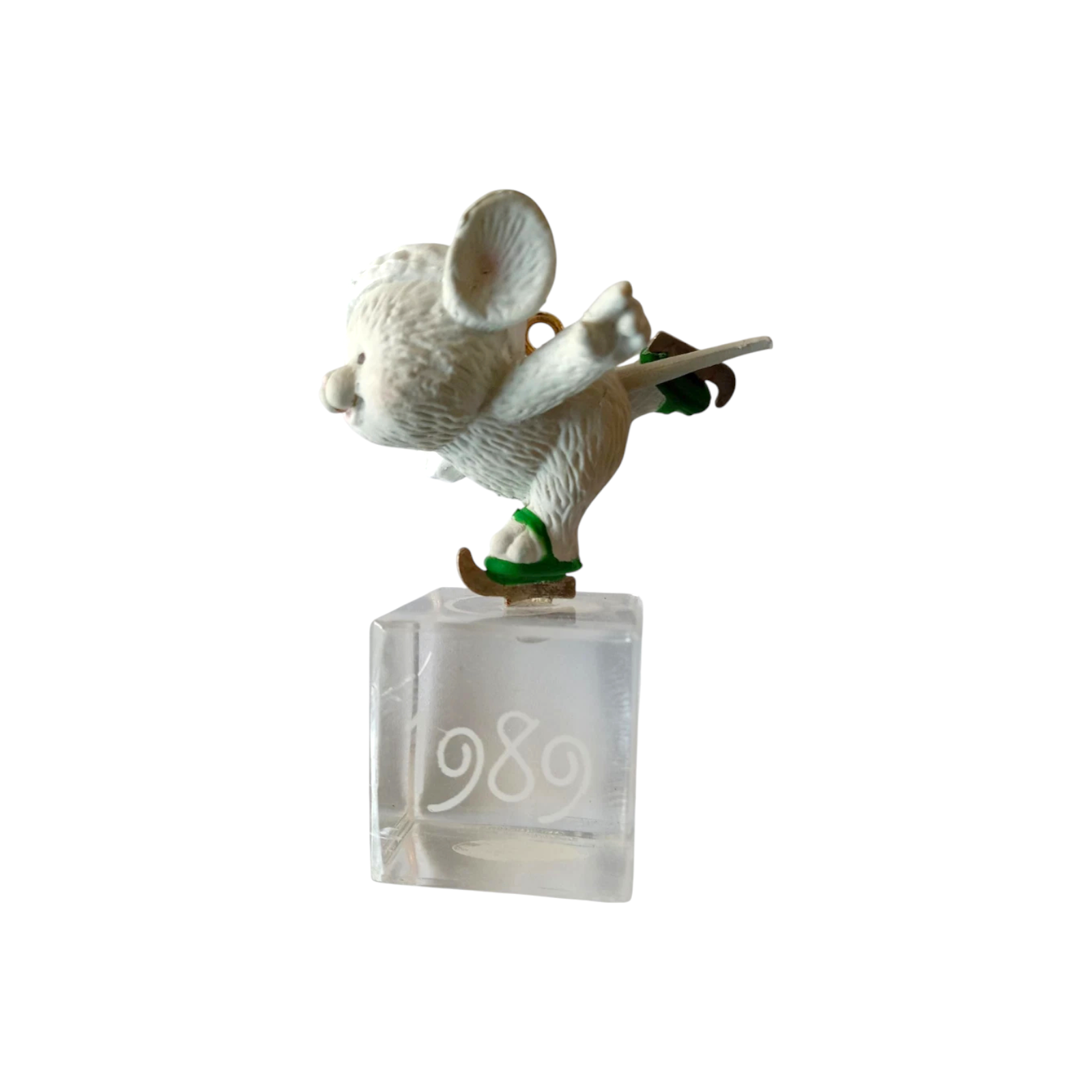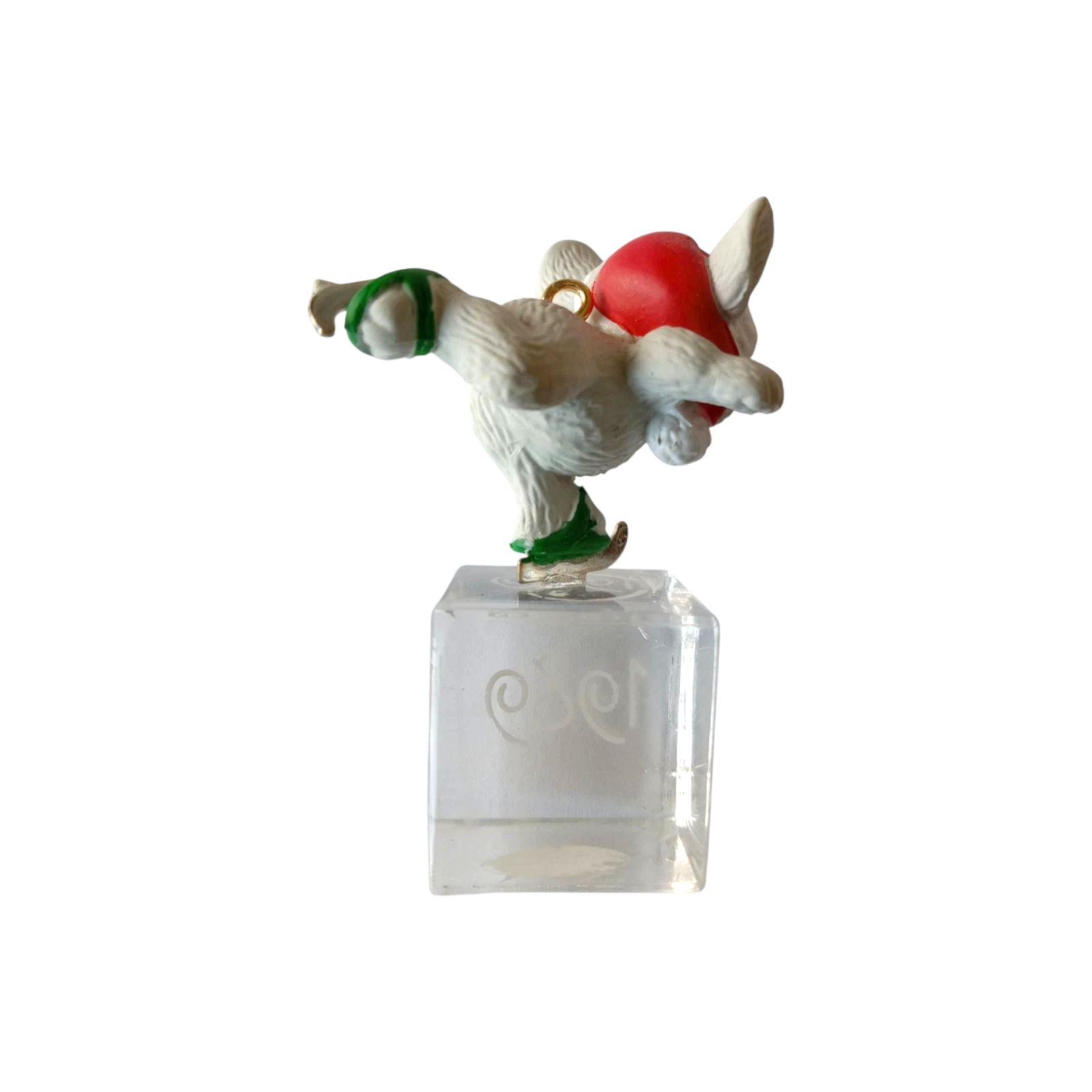 The 1988 Havin’ Fun ornament by Carlton Cards is an adorable vintage piece that captures the playful spirit of Christmas through the eyes of a cheerful little mouse. This delightful ornament features a gray mouse bundled in a bright red scarf, gleefully sledding down a snowy hill on a classic wooden sled. The mouse’s joyful expression and dynamic pose bring the scene to life, making it one of the most whimsical designs in Carlton’s 1988 holiday line. Hand-painted with soft pastel and festive colors, it showcases the detailed craftsmanship and storytelling charm that defined Carlton’s ornaments of the era. The piece is made of durable resin and typically comes with its original box and gold hanging cord.