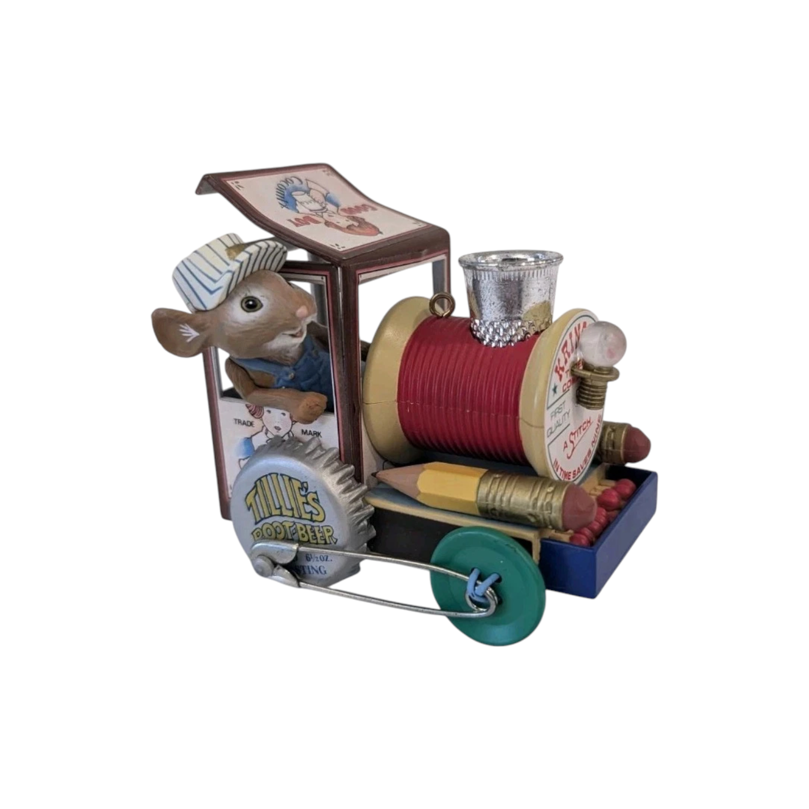The 1988 “Merry Christmas Engine” ornament showcases a whimsical mouse engineer at the helm of a miniature train composed of everyday sewing-notions: spools, thimbles, buttons and pencils form the engine’s components. The vibrant hand-painted finish and clever found-object design reflect Enesco’s “Treasury of Christmas” creativity and the signature work of designer M. Gilmore. With its vintage charm and storytelling detail, this piece makes a standout addition to holiday décor or a collector’s display, especially for enthusiasts of themed trains or craft-inspired ornaments.