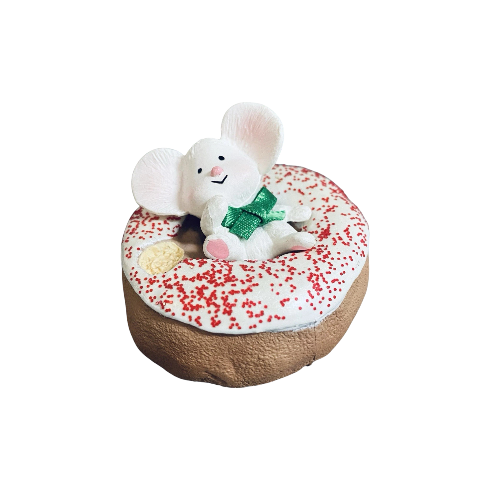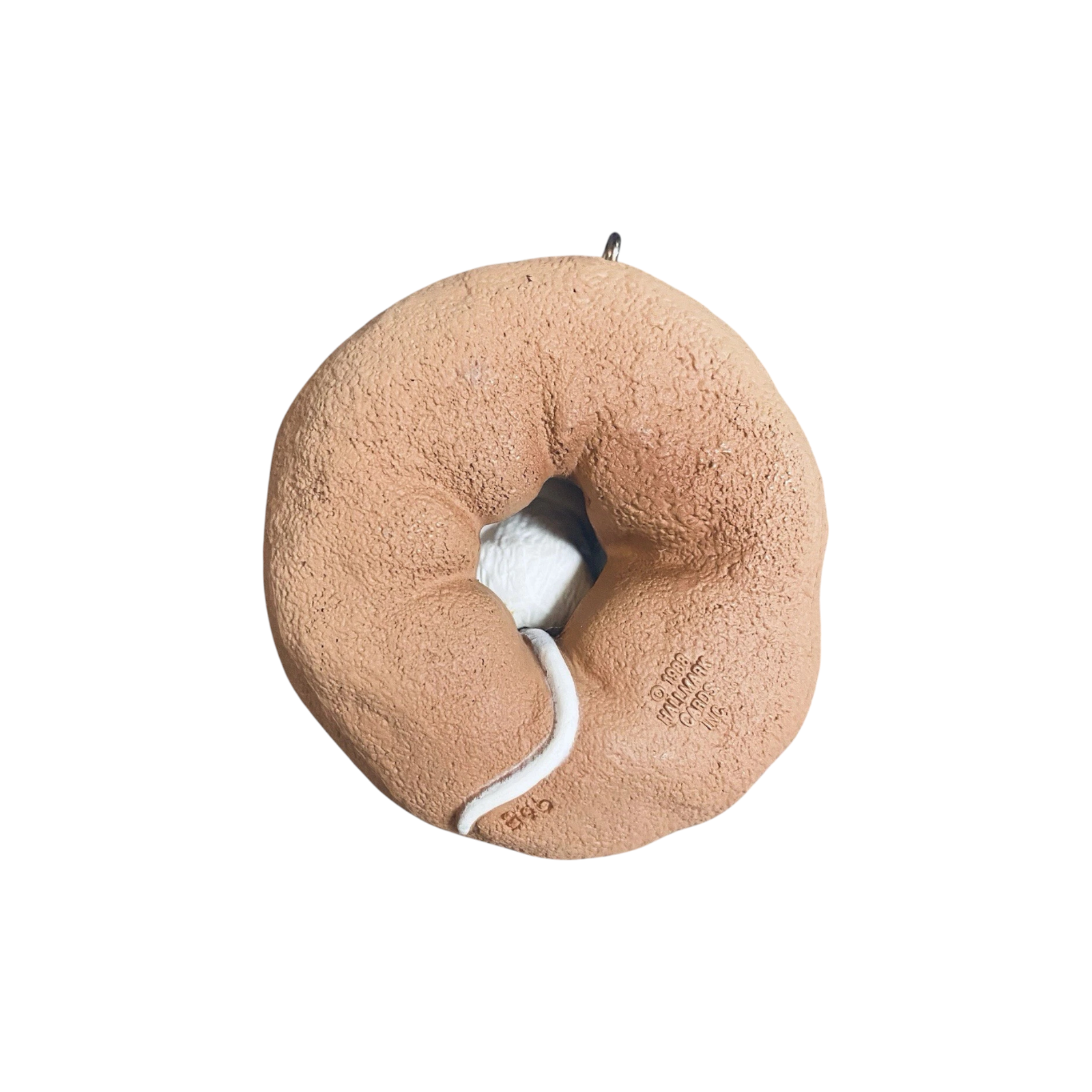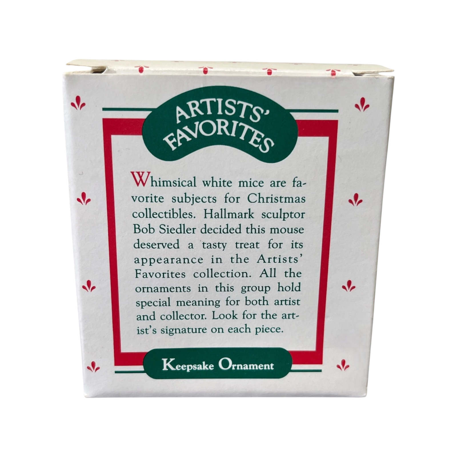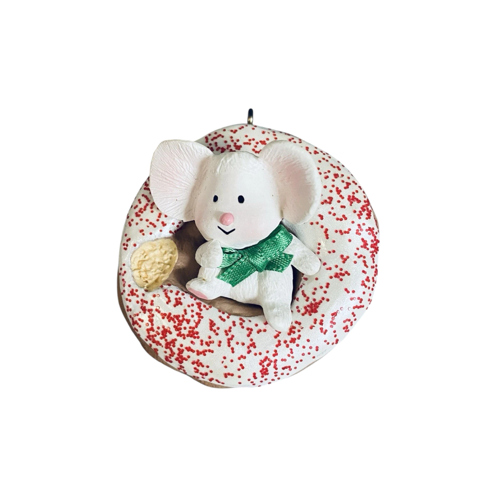 The 1988 Midnight Snack ornament is an irresistibly cute Hallmark collectible featuring a tiny gray mouse sneaking a late-night bite of Christmas goodies. The mouse is shown sitting inside a bright red refrigerator, munching on a piece of cheese with a contented smile. The fridge door is decorated with holiday magnets and a “Merry Christmas” note, adding a fun and festive touch. This clever and humorous design captures Hallmark’s signature charm and attention to detail from the 1980s era. Made of hand-painted resin, the ornament comes with its original Hallmark box and hanging cord. It’s purely decorative and does not require any lights, batteries, or cords.