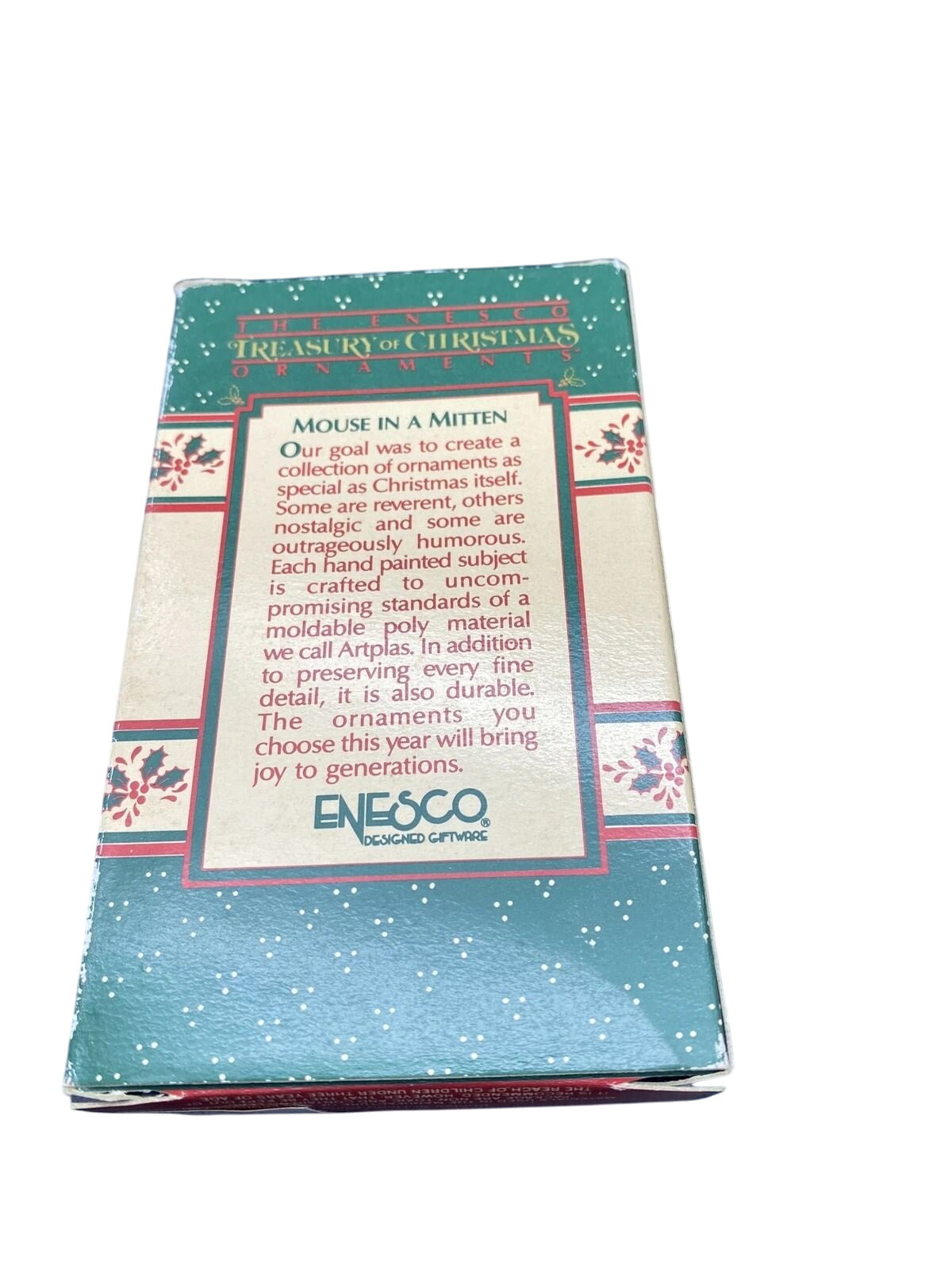 Bundle up in holiday coziness with the 1988 Enesco “Mouse in a Mitten” ornament. This adorable collectible features a tiny mouse snuggled inside a warm red mitten, peeking out with a joyful smile as snowflakes fall all around. Hand-painted with soft winter colors and detailed textures, it perfectly captures Enesco’s signature charm and craftsmanship. A heartwarming addition for vintage Enesco fans or anyone who loves cute woodland ornaments, this piece brings a touch of warmth and whimsy to your Christmas display.