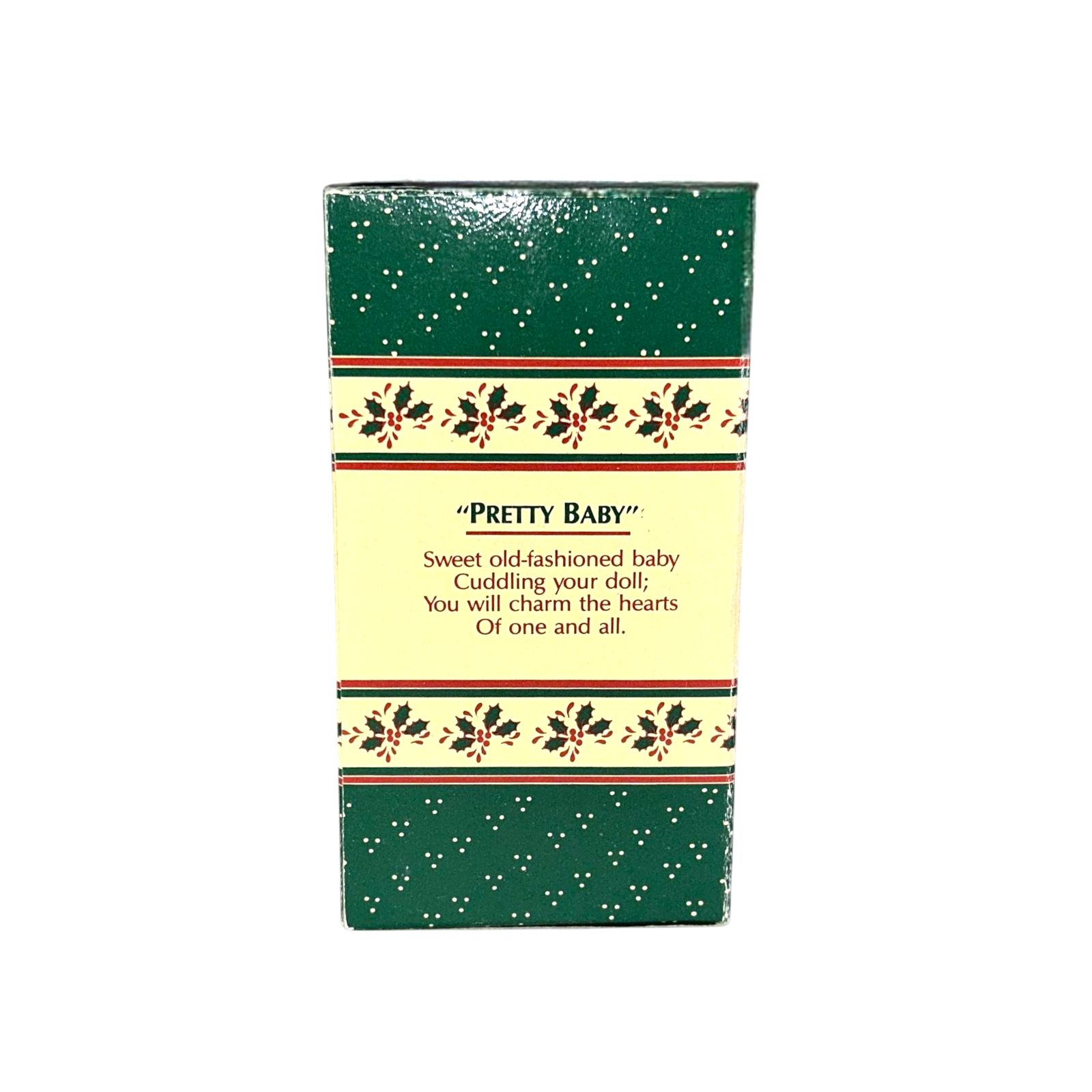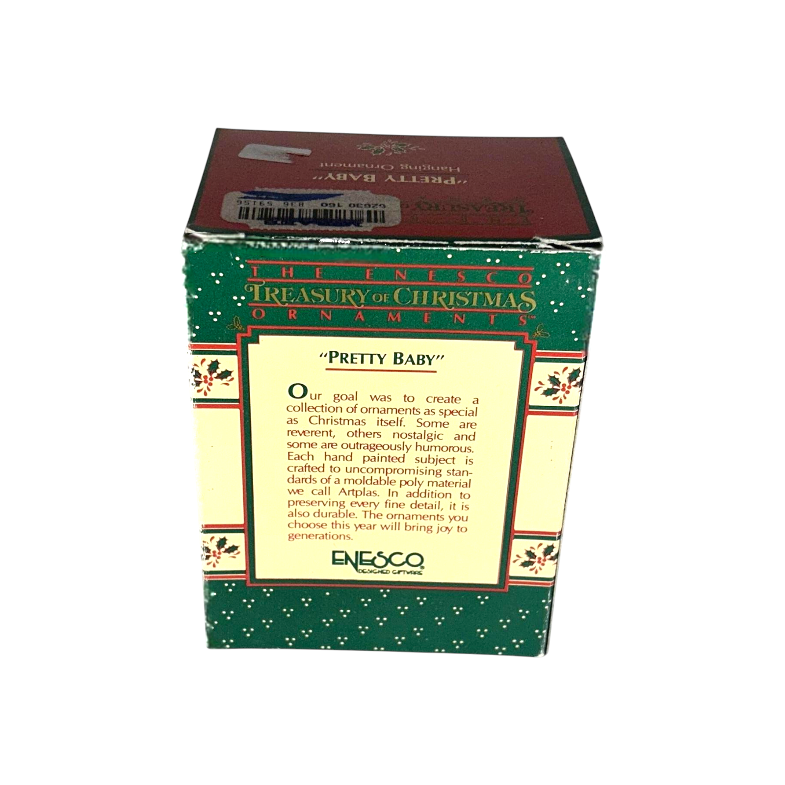 Capture the sweetness of early Christmas memories with the 1988 Enesco “Pretty Baby” ornament. This adorable collectible features a baby bear nestled in a festive bassinet, surrounded by ribbons and holly accents that evoke the warmth of a classic holiday nursery. Hand-painted in soft pastel tones and delicate detail, it beautifully reflects Enesco’s craftsmanship and charm. A perfect keepsake for celebrating baby’s first Christmas or adding vintage cuteness to your tree, “Pretty Baby” is a timeless treasure for collectors and families alike.