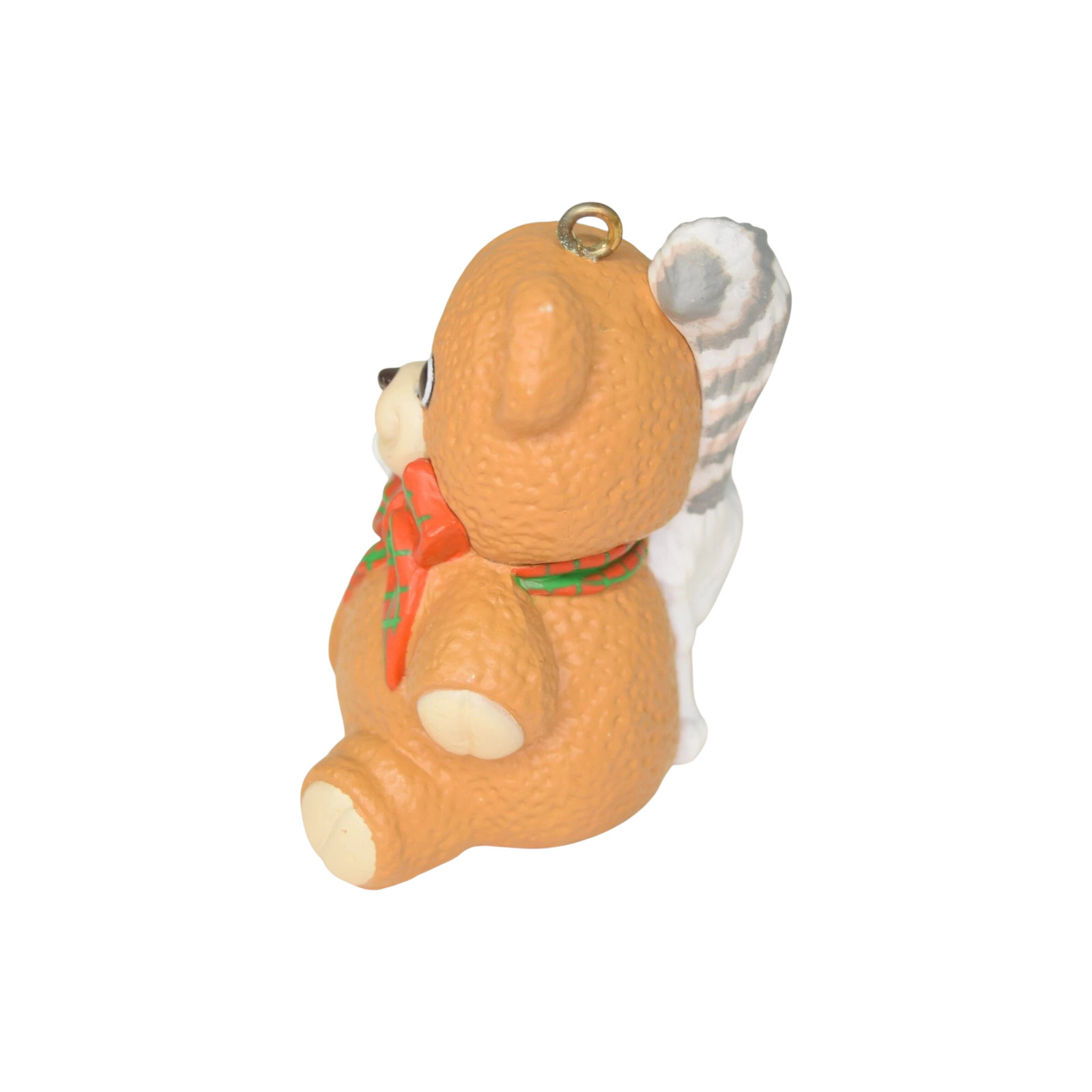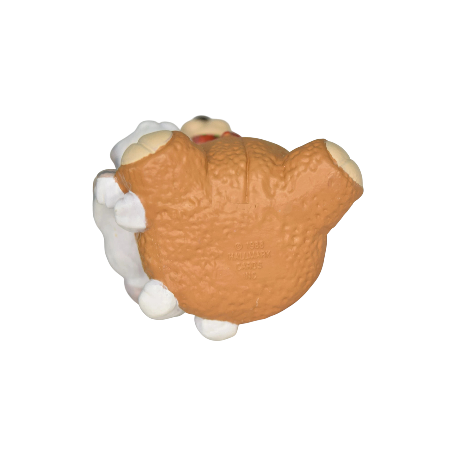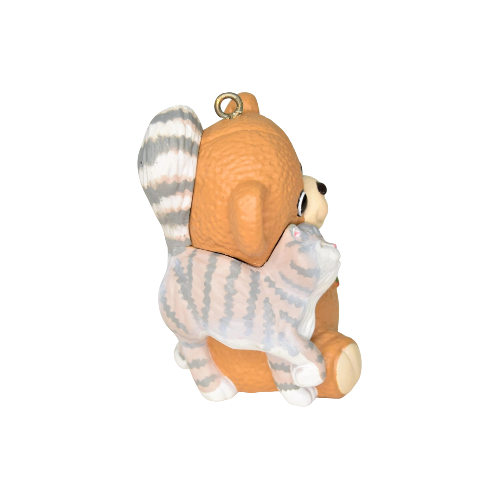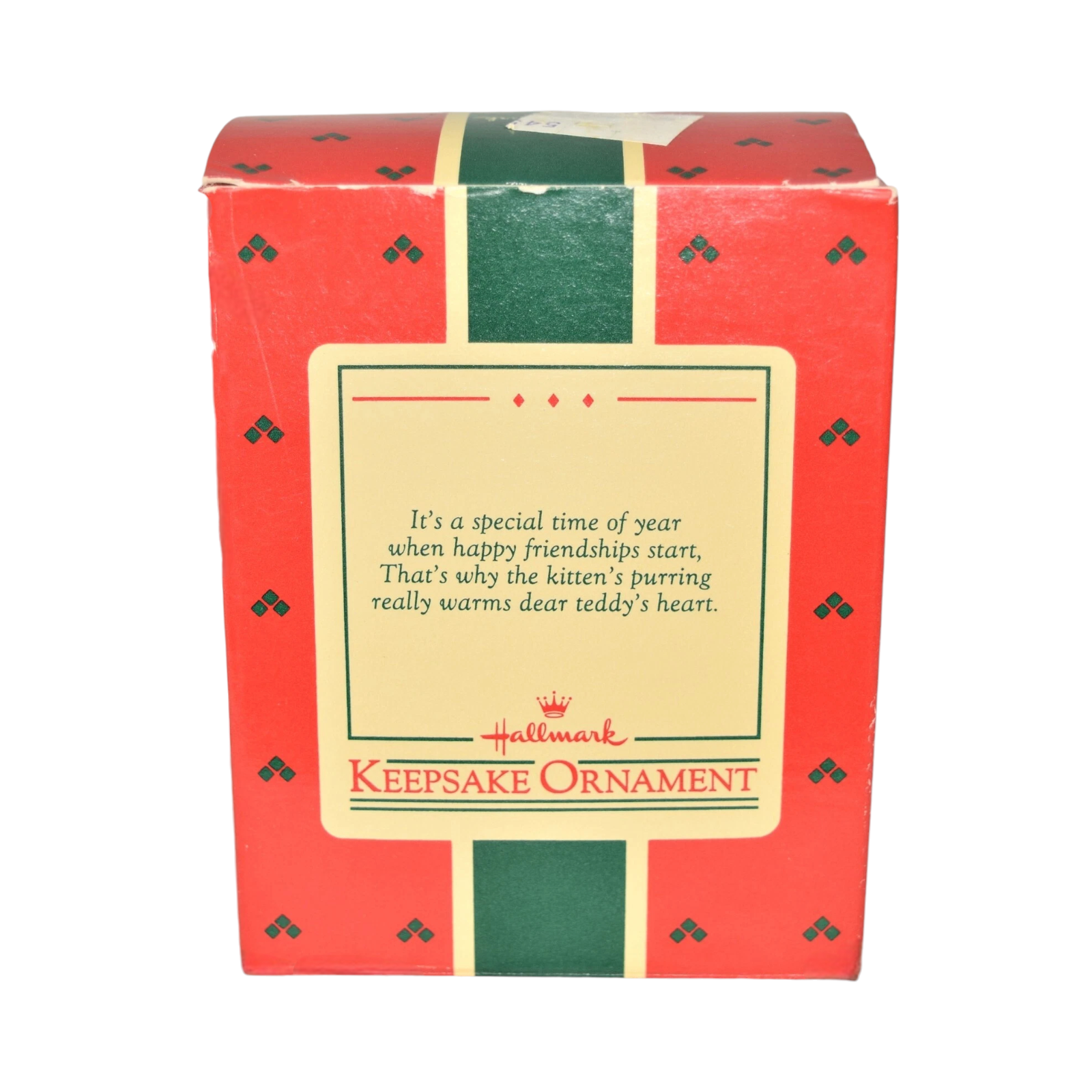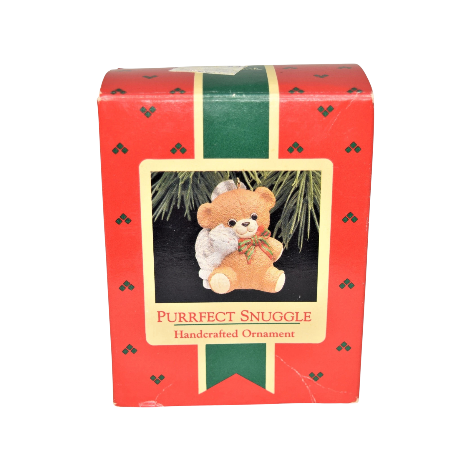 The 1988 Purrfect Snuggle ornament is a heartwarming Hallmark collectible featuring a cozy teddy bear cuddled up with a playful kitten. The bear, wearing a red scarf, smiles warmly as the kitten snuggles in its arms, capturing the essence of love and friendship during the holiday season. The design’s soft color palette and sculpted texture evoke Hallmark’s classic late-1980s style. Crafted from hand-painted resin, this ornament typically comes with its original Hallmark box and hanging cord. It does not require batteries, cords, or lighting—just a sweet reminder of Christmas warmth and companionship.