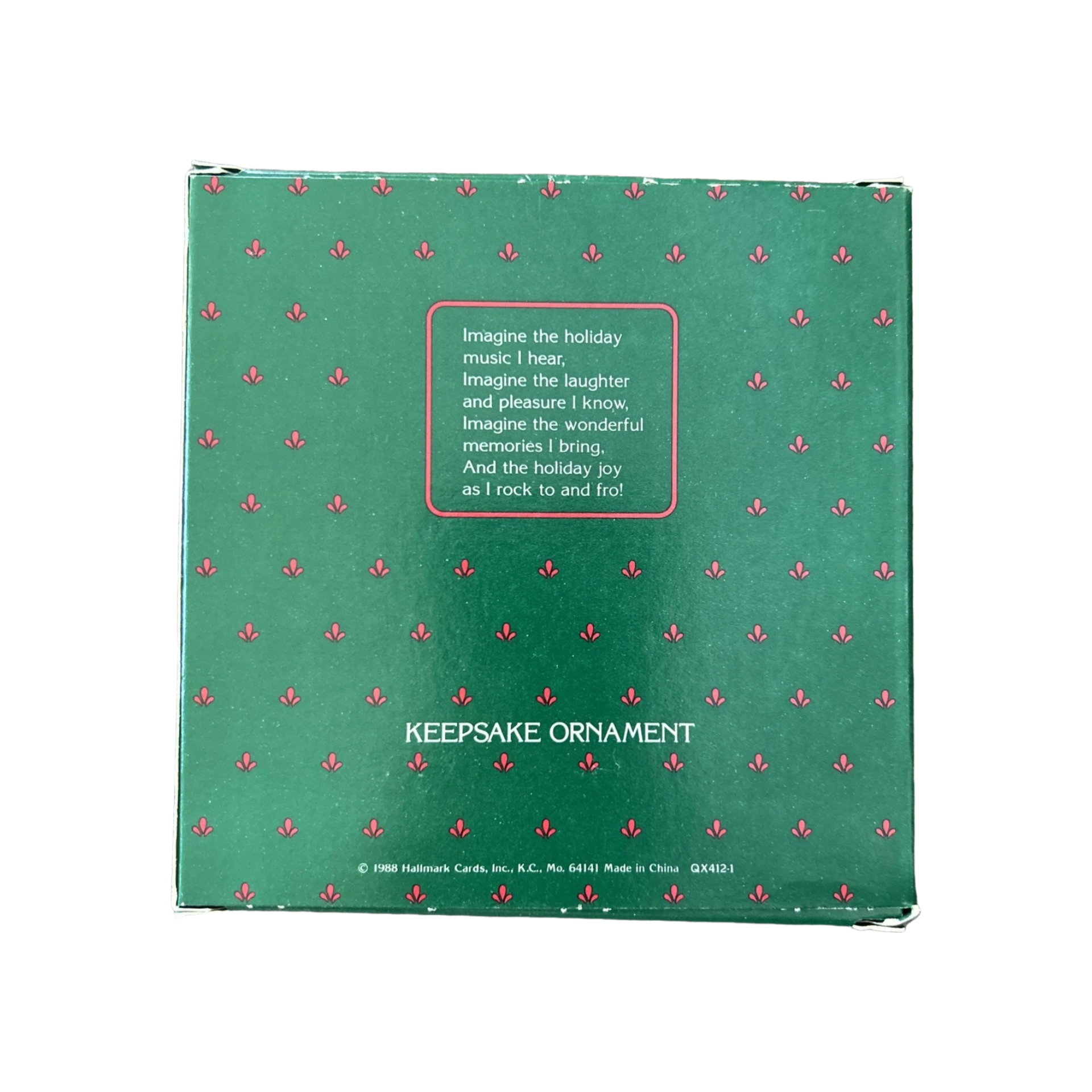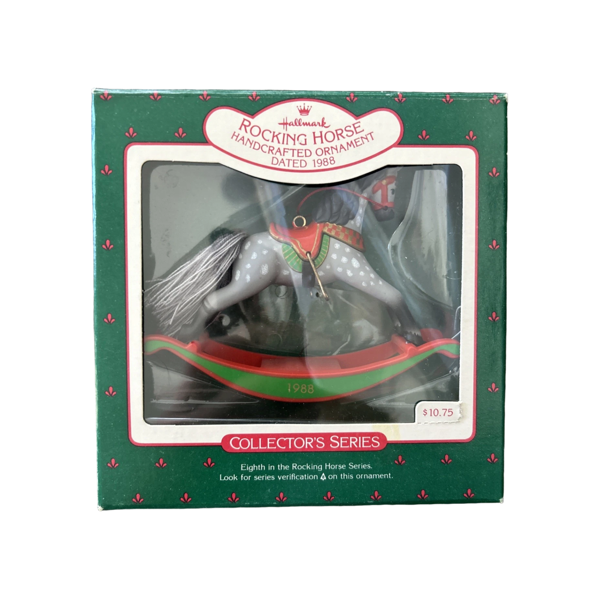 The 1988 Rocking Horse ornament features a gray dappled horse with a red and green saddle, gold accents, and a yarn tail. The horse sits on a red and green rocker base dated 1988, capturing the nostalgic look of classic children’s toys. This ornament is part of Hallmark’s long-running Rocking Horse Series and is made to hang easily on a Christmas tree using the attached loop. When originally sold, it came packaged in a Hallmark box, though many vintage pieces are now found without packaging. This ornament requires no batteries, cords, or lighting — it is strictly decorative.