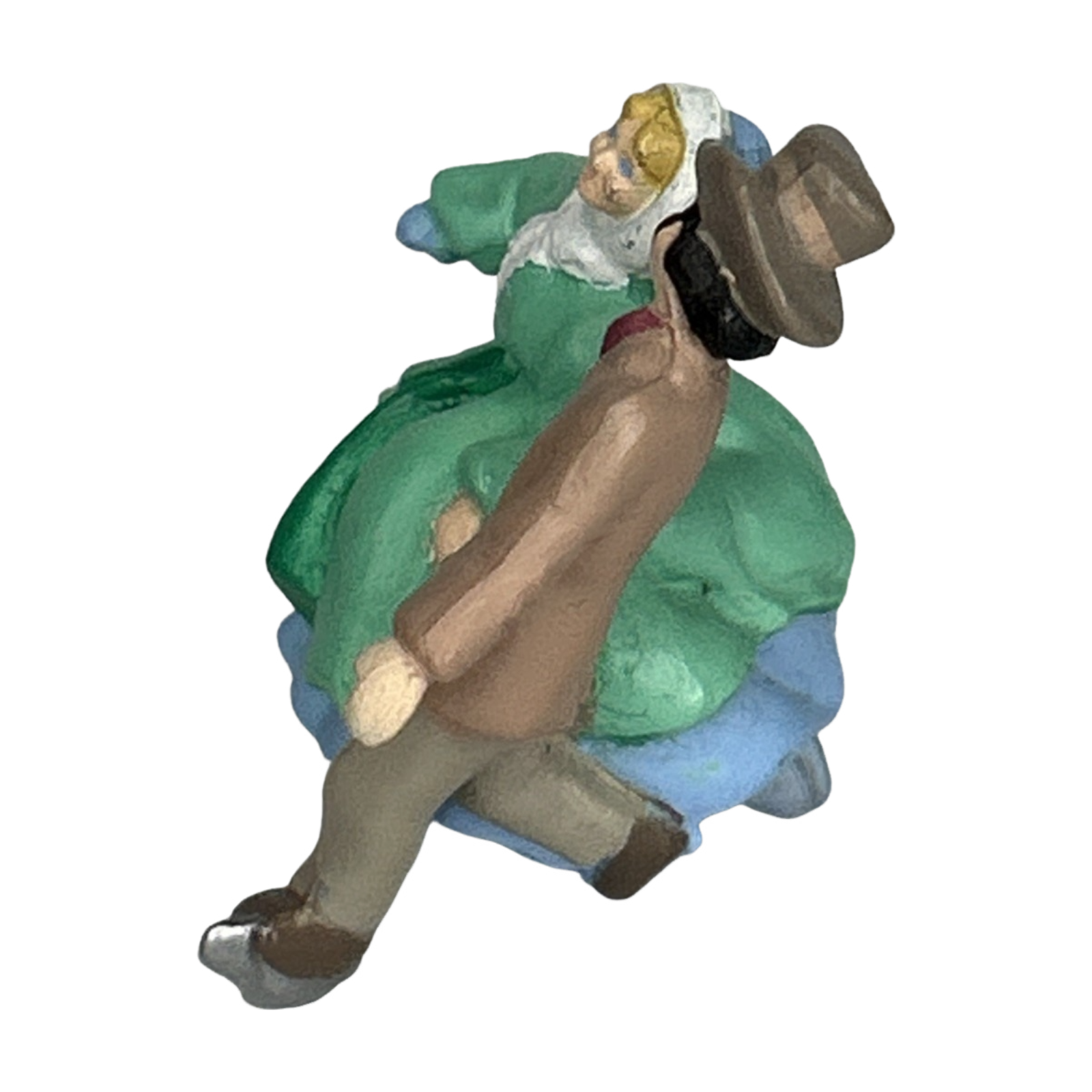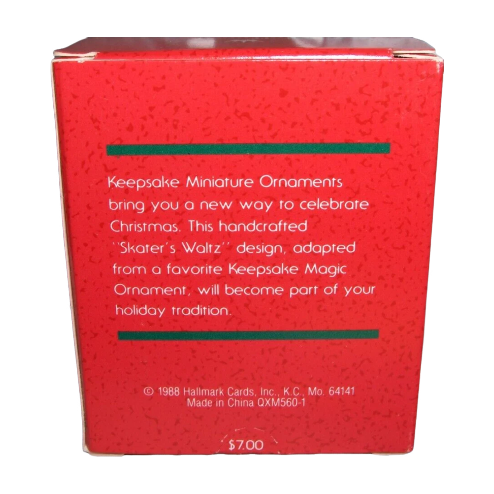Glide into vintage holiday charm with the 1988 “Skater’s Waltz” miniature ornament, a sweet tabletop-tree version of Hallmark’s skating scene. The design depicts a Victorian couple ice skating hand-in-hand: the lady wears a teal coat over a blue skirt with a white bonnet scarf, while her partner skates beside her in a tan coat and dark cap, capturing a serene winter waltz in tiny handcrafted detail. This miniature comes in the original red Hallmark Keepsake Miniature box and typically includes the insert/tag when new in box. It has no motion, sound, or lighting features, so it needs no batteries, cords, or light strings.
