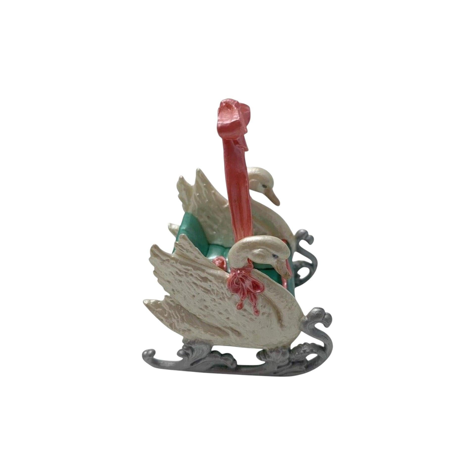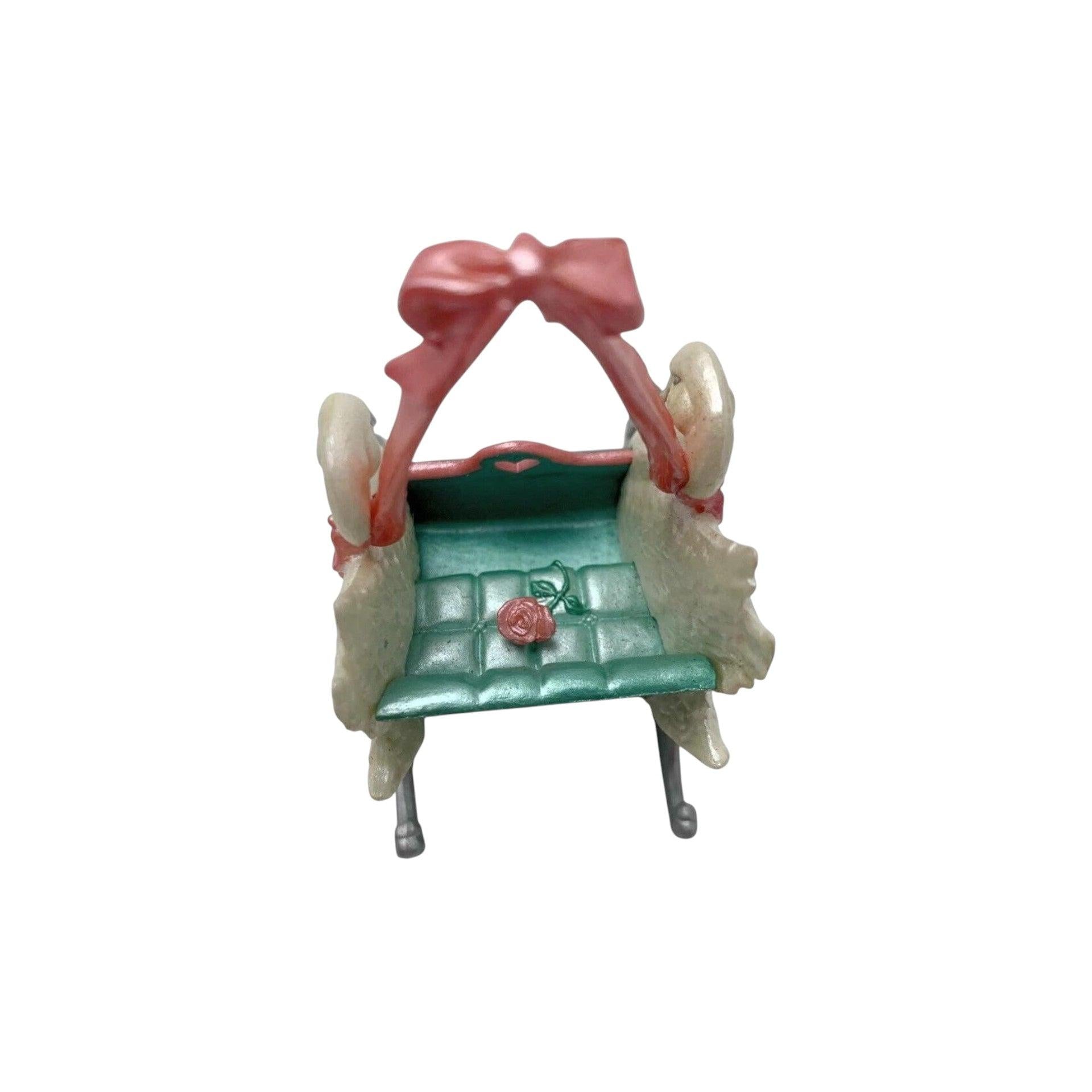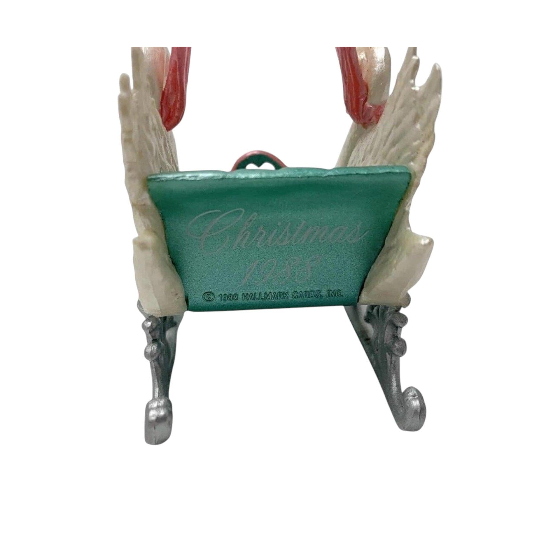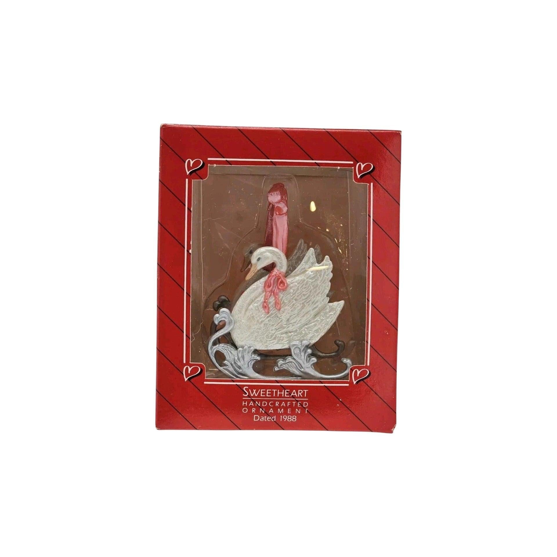 Drift into romantic holiday charm with the 1988 Sweetheart (Swan) ornament (QX4901). This elegant keepsake features twin swans gracefully forming a sleigh, their curved necks kissing above a verdant seat emblazoned with the word “Sweetheart.” Crafted by Duane Unruh in 1988, the ornament includes a ribbon bow and a decorative sleigh runner. Mint-in-box versions usually include the original collector’s box and even personalization space on the bottom (“For ____, Love ____”). Fully decorative—no batteries or cords required, just hang and enjoy the sentiment.