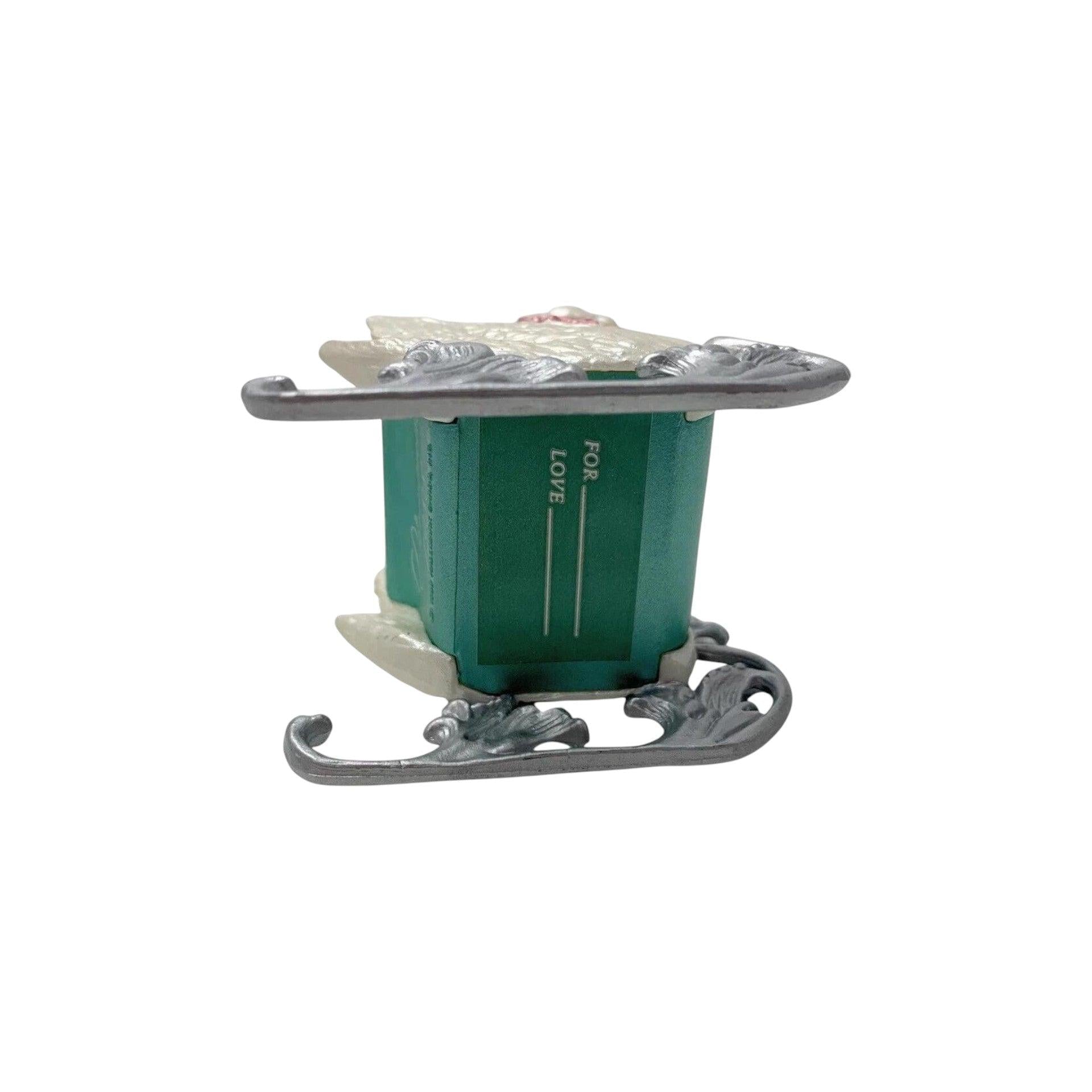 Materials: Painted resin/plastic sleigh with decorative ribbons and metal runners