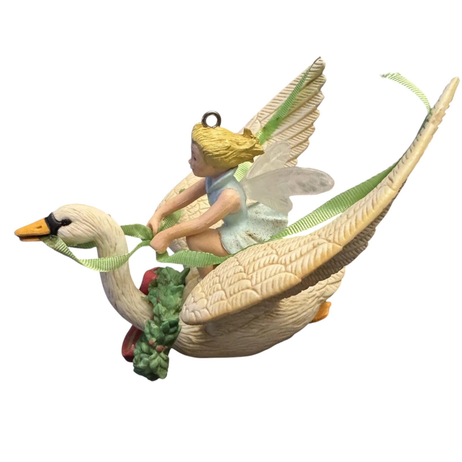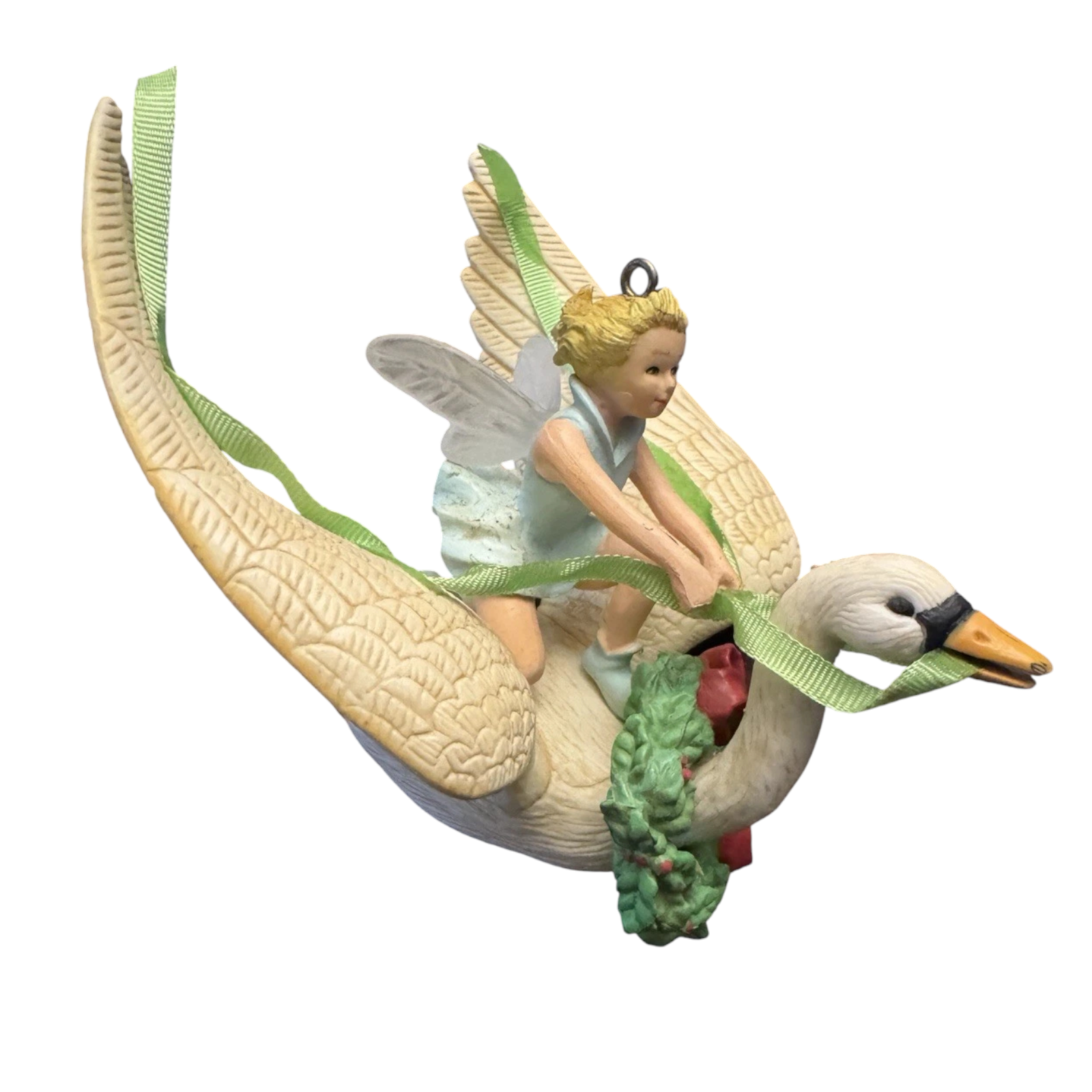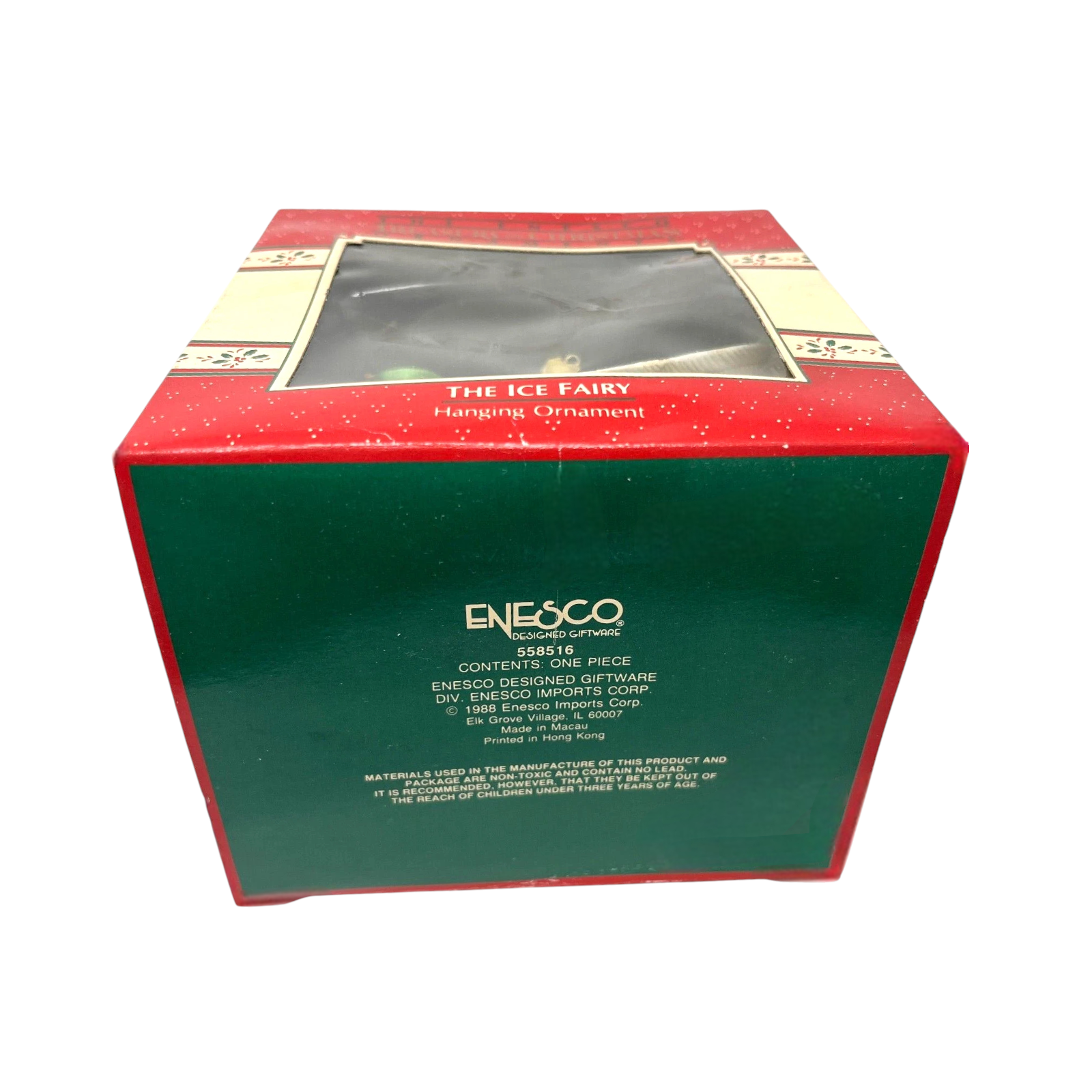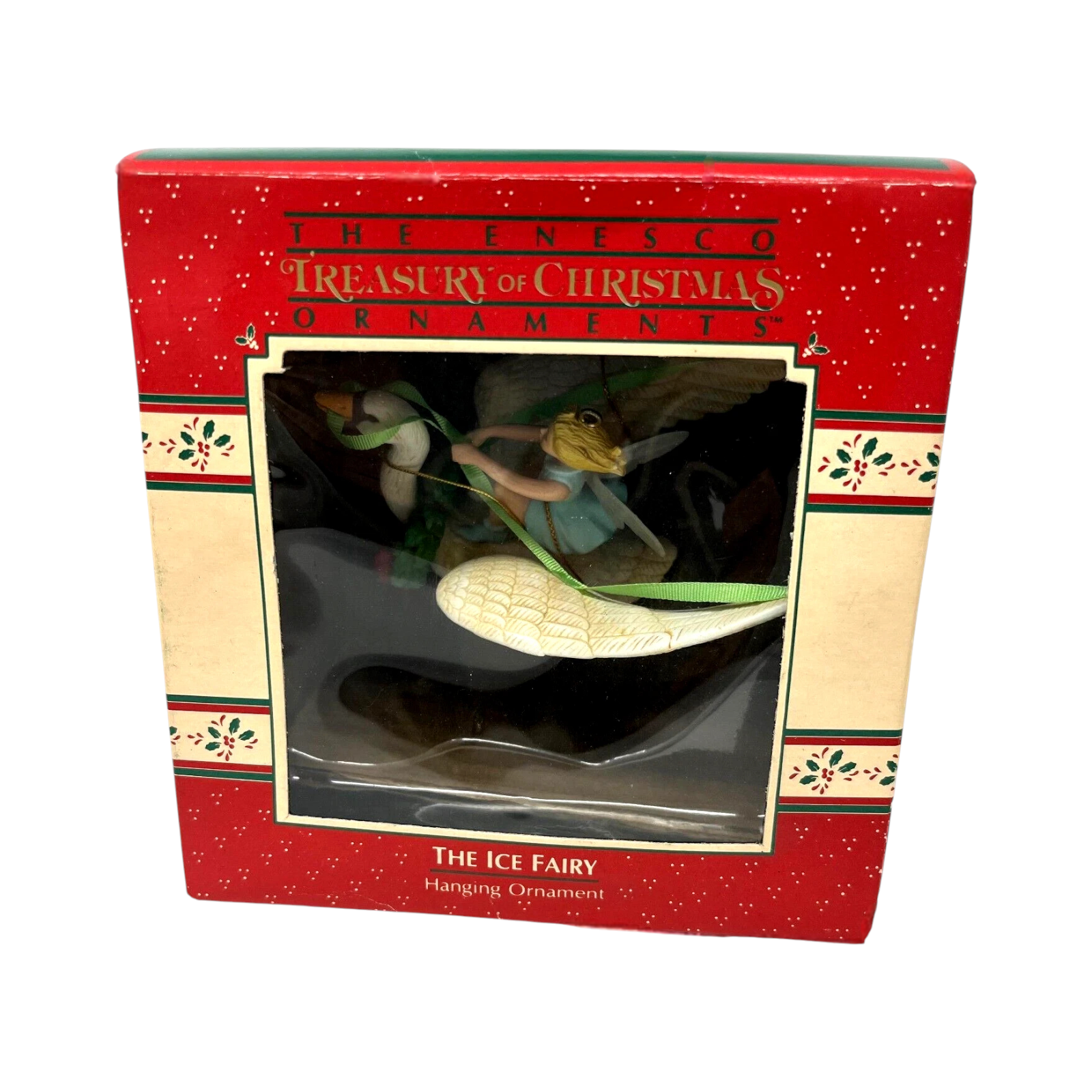 This 1988 “The Ice Fairy” ornament captures the ethereal beauty of a wintry fairy soaring atop or poised with icy elements—hand-painted in shimmering tones of frosted white, pale blue and silver, with delicate wings and sculptural detailing that evoke frozen elegance. The piece is part of Enesco’s “Treasury of Christmas” series, featuring fine craftsmanship in molded resin or poly material with shimmering finishes that reflect light beautifully. For collectors, it stands out for its magical theme, graceful lines and evocative winter-fantasy styling. Whether displayed on the tree or as part of a seasonal collection, this ornament adds a timeless, enchanting accent to holiday décor.
