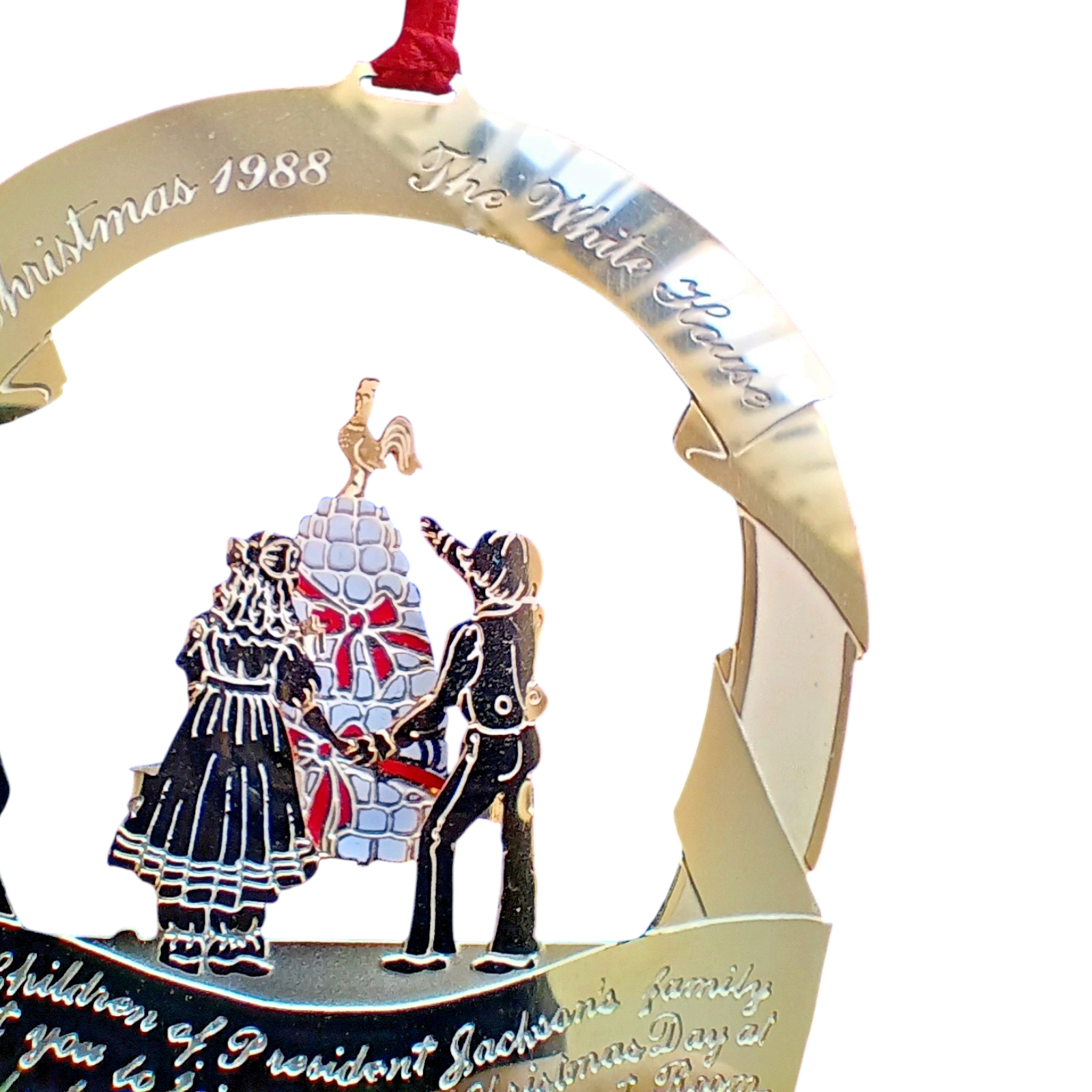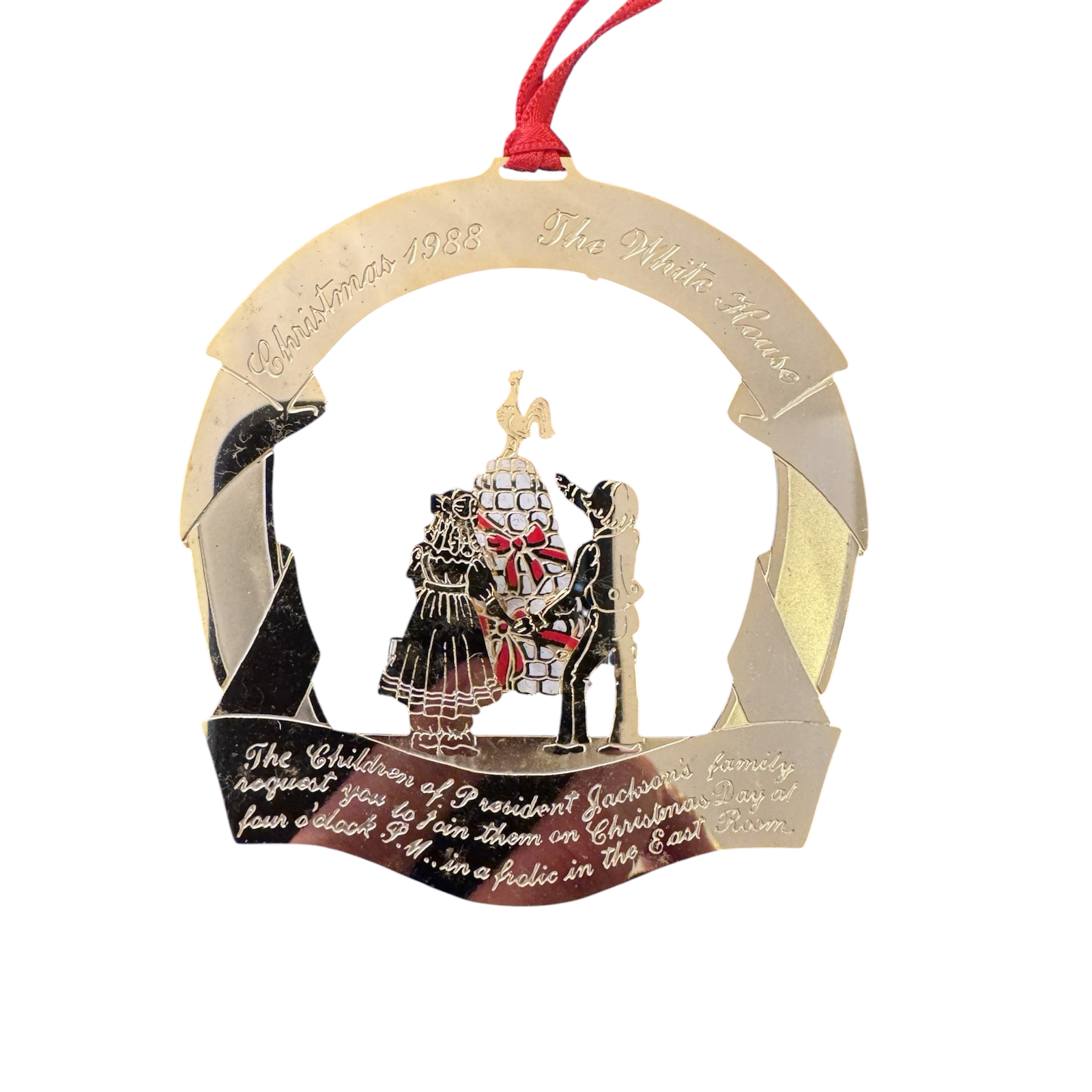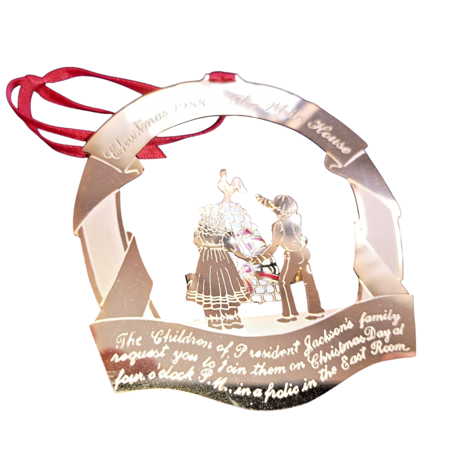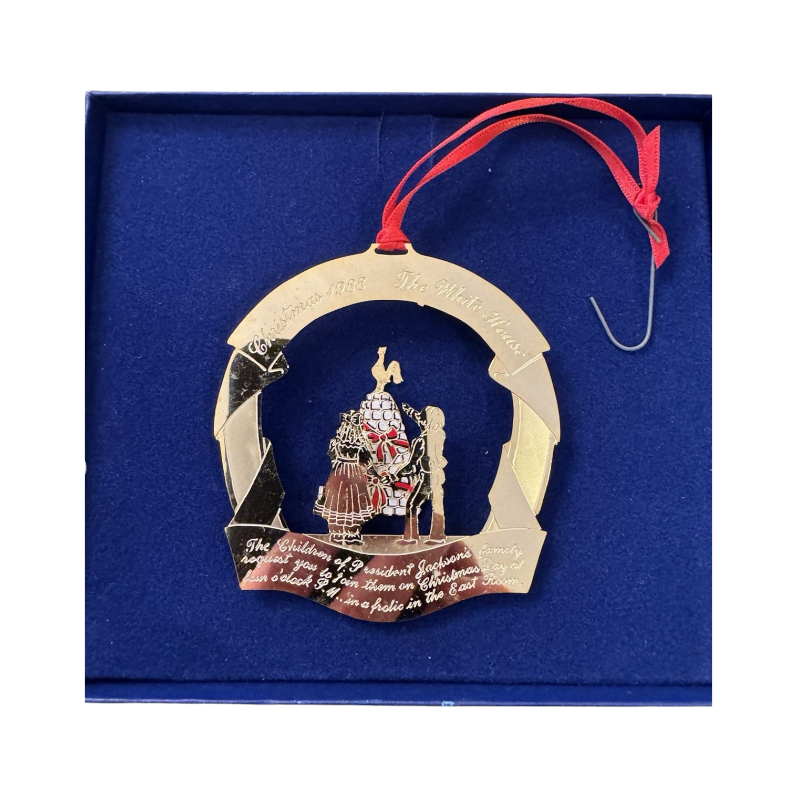 Celebrate a piece of presidential history with this distinguished ornament from the White House Historical Association, issued in 1988. Crafted in the U.S.A. of 24-karat gold-finished brass, the design honors Andrew Jackson and the “President’s Children” motif that reflects Jackson’s family at the White House. The package includes the ornament in its original collector box plus the informational brochure that traces the story behind the design and the era. A prime choice for collectors of presidential memorabilia and fans of White House décor.