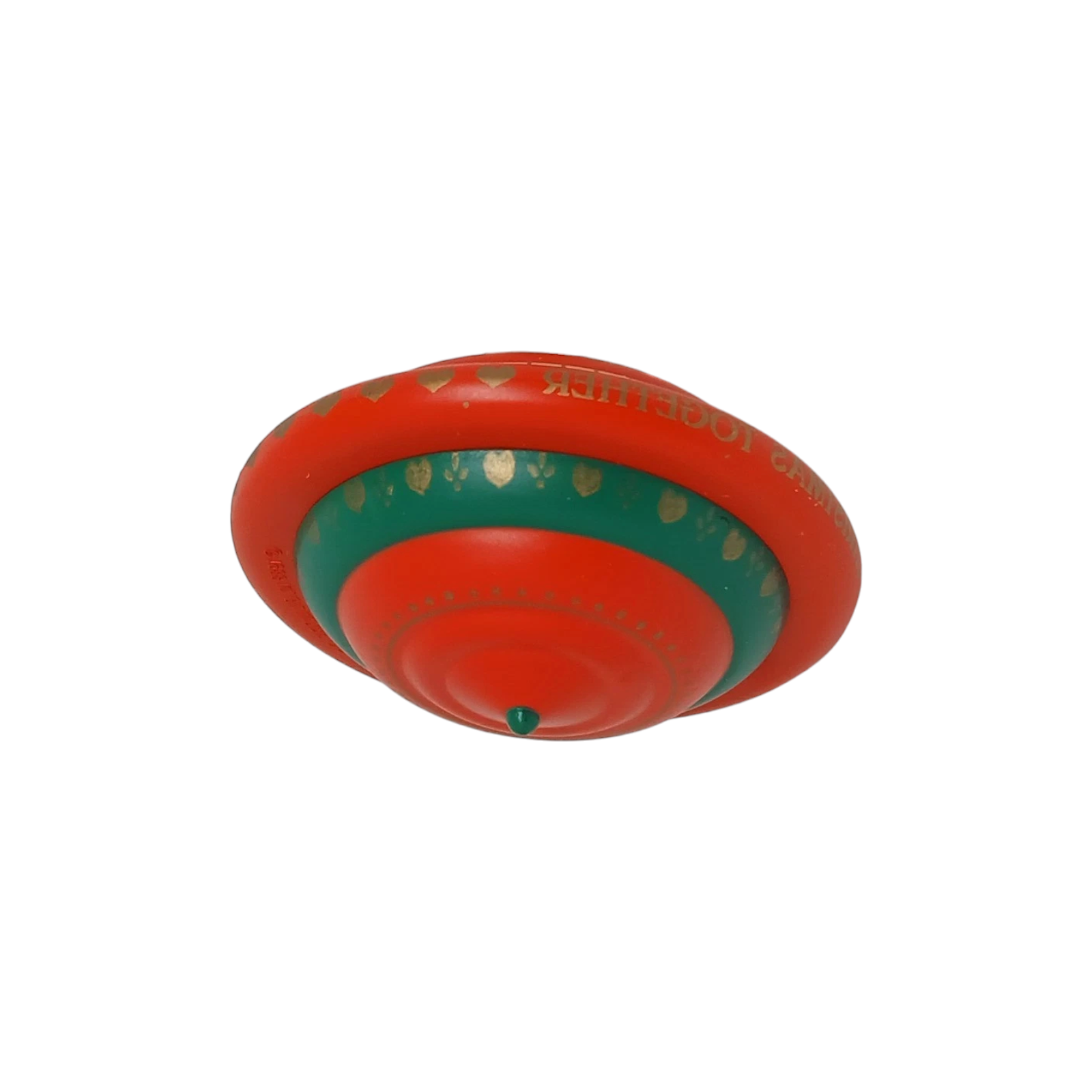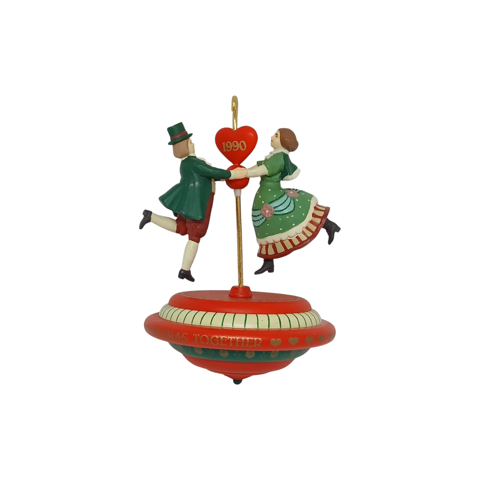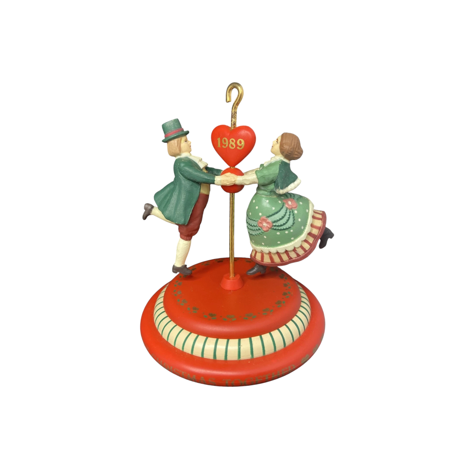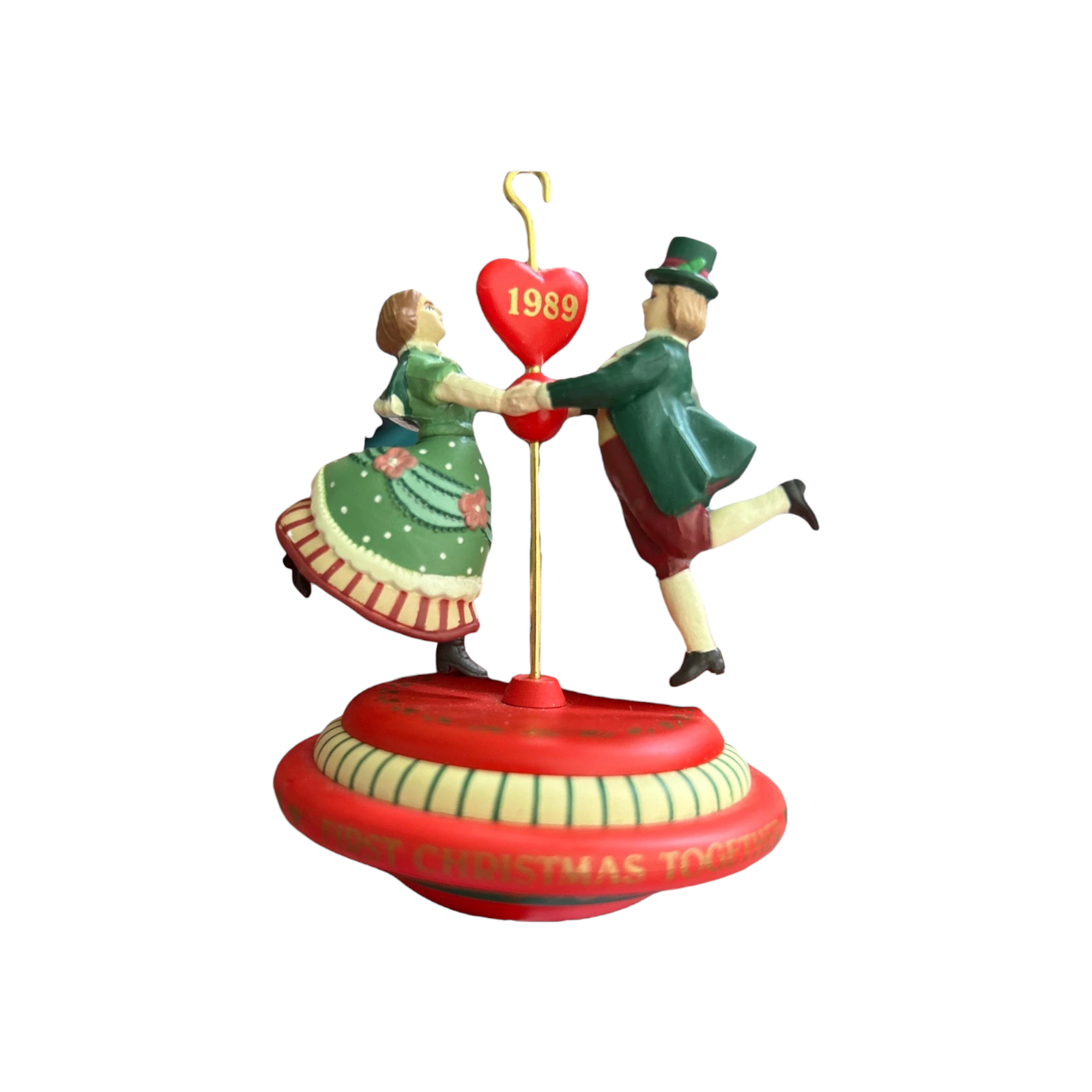 The 1988 Wonderland Waltz (Our First Christmas) ornament by Carlton Cards is a beautifully romantic piece celebrating a couple’s first holiday season together. The design features a loving pair of snowpeople—a snowman and snowwoman—dressed in festive winter attire, dancing gracefully together in the snow. The snowman wears a black top hat and green scarf, while the snowwoman twirls in a red muff and bonnet, holding his mittened hand as they glide across a glittery white base. A small heart detail and the inscription “Our First Christmas 1988” make this piece both sentimental and elegant. The ornament is crafted from hand-painted resin with shimmering accents and comes with its original Carlton Cards box and hanging cord.