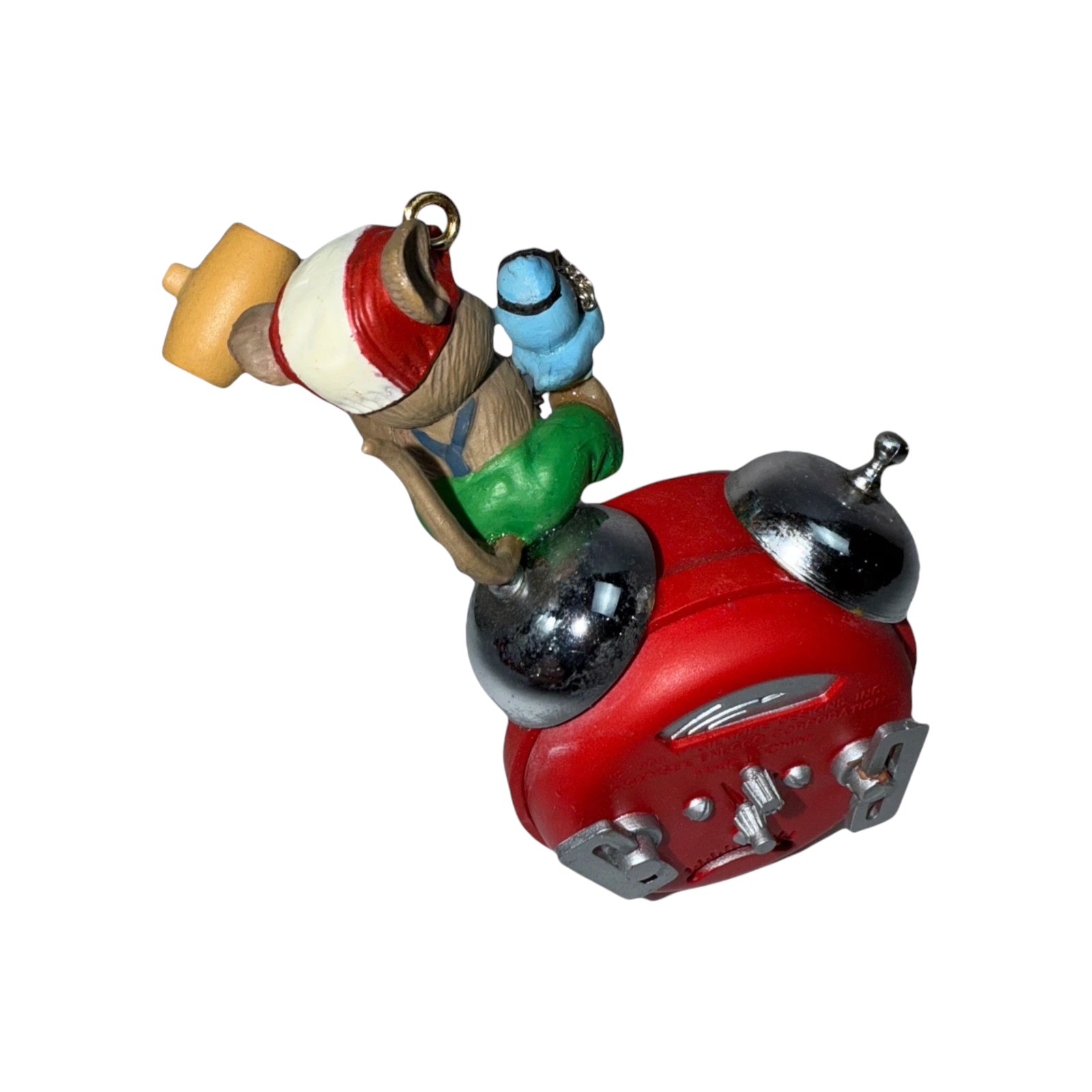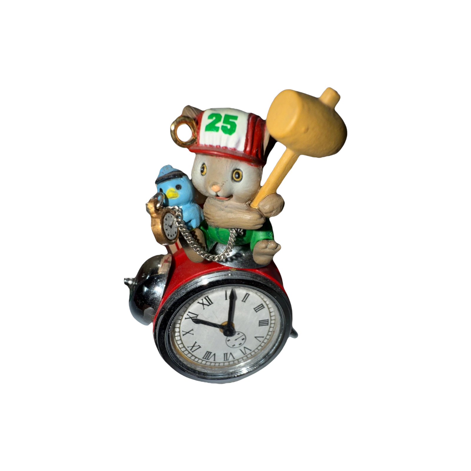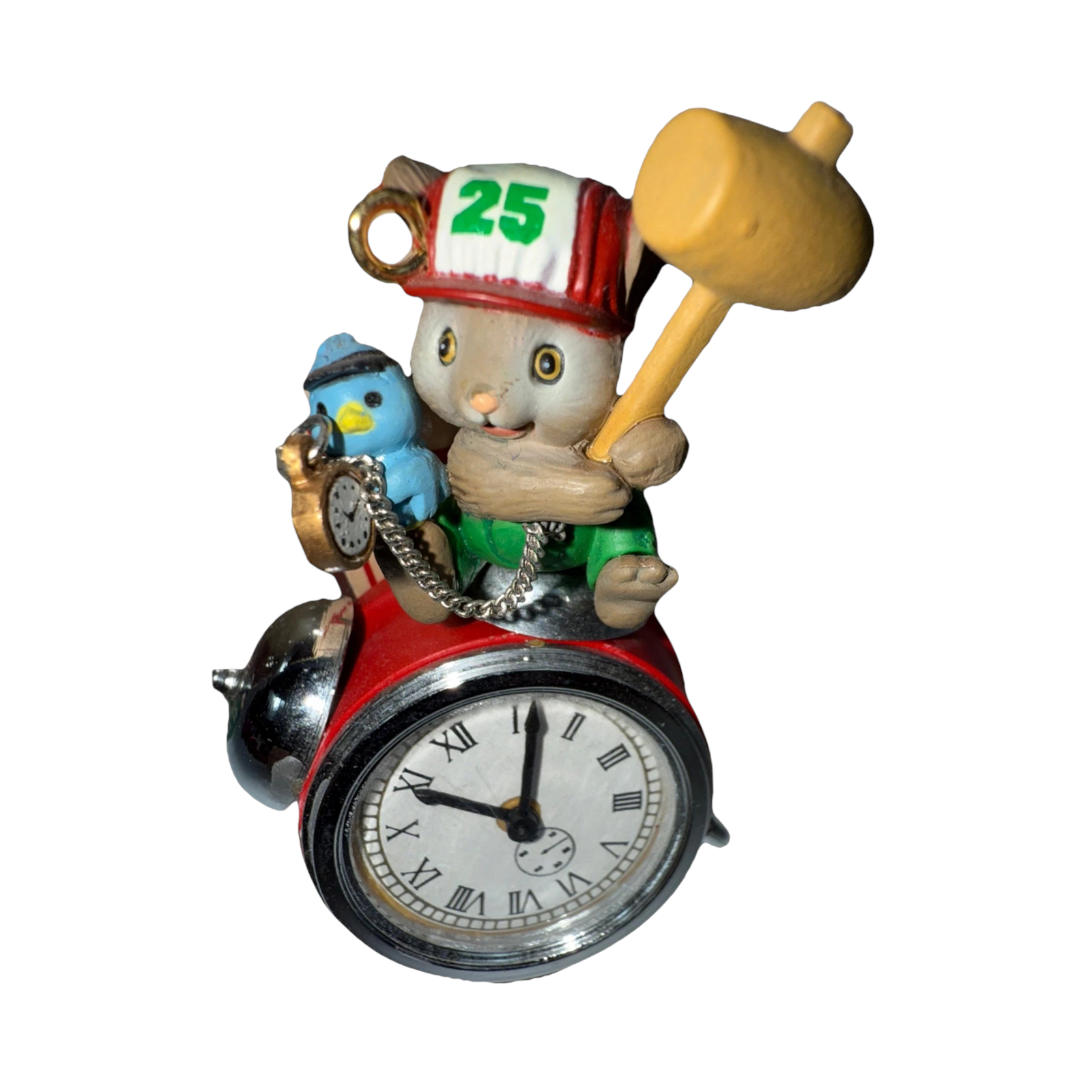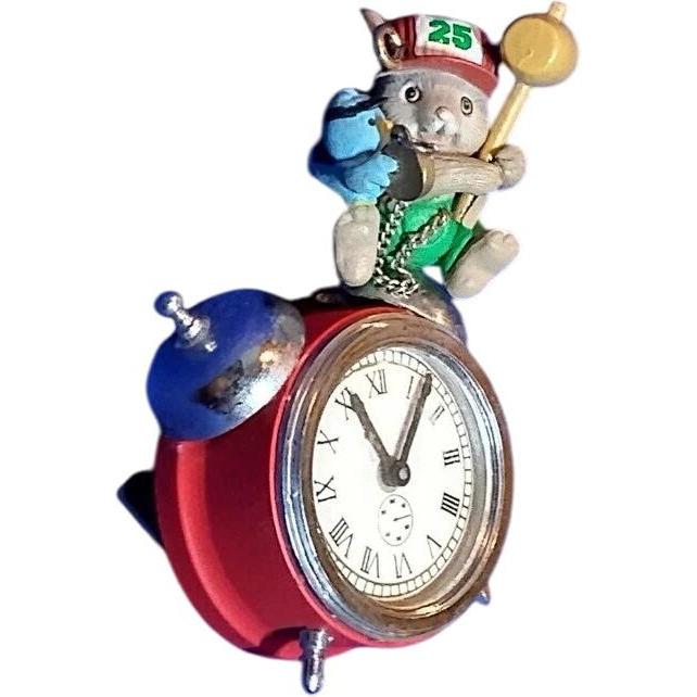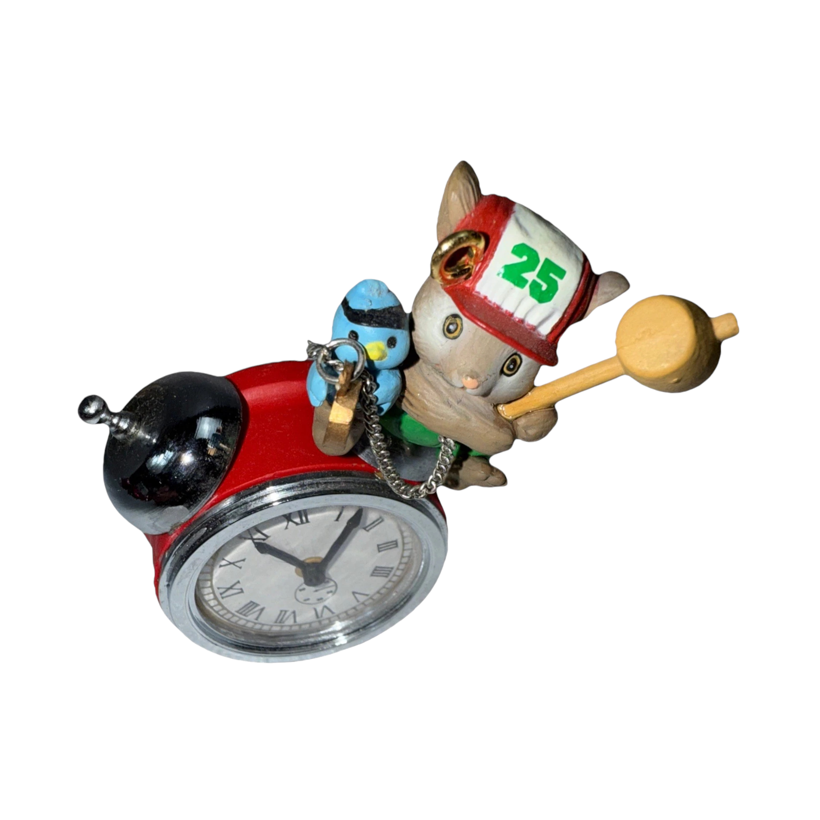 This whimsical ornament features a playful little mouse perched atop a detailed alarm clock, complete with a tiny bluebird companion on the clock face — a charming nod to the timely delivery of Santa’s holiday cheer. Crafted in hand-painted Artplas (a durable molded resin/plastic) with fine attention to detail, the piece captures the fun and miniaturized theme of the “Made-to-Measure” series. As the third issue in this series from 1989, it holds strong appeal to collectors who chase series-completion or novelty character designs. With its compact size, detailed sculpting, and festive motif, it’s a delightful addition to any tree or holiday display.