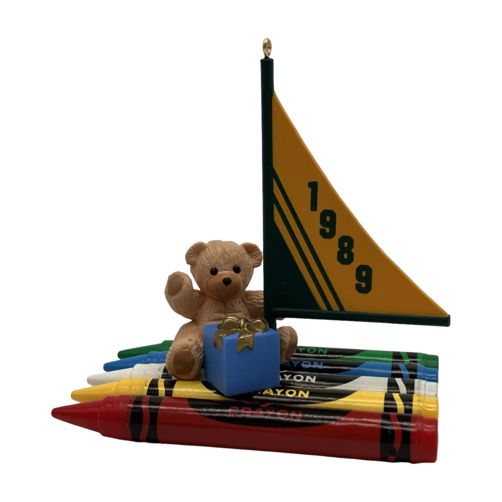 Introduce a burst of childhood whimsy to your holiday décor with this nostalgic ornament. The design features a brown teddy bear clutching a wrapped gift while sailing on a raft crafted from five vibrant Crayola crayons, complete with a yellow sail marked "1989." Included is the original collector’s box and tag. This handcrafted ornament requires No Power—no batteries, cords, or light strings—just hang it and enjoy.