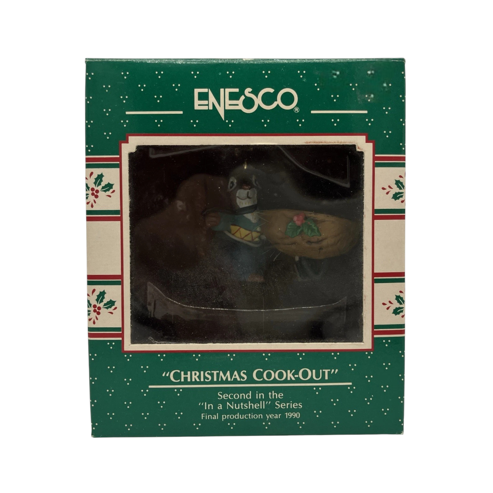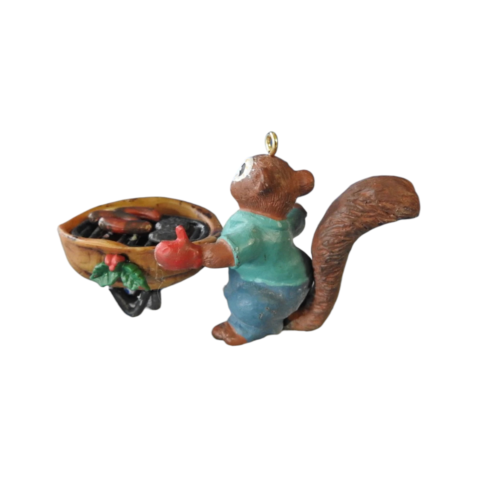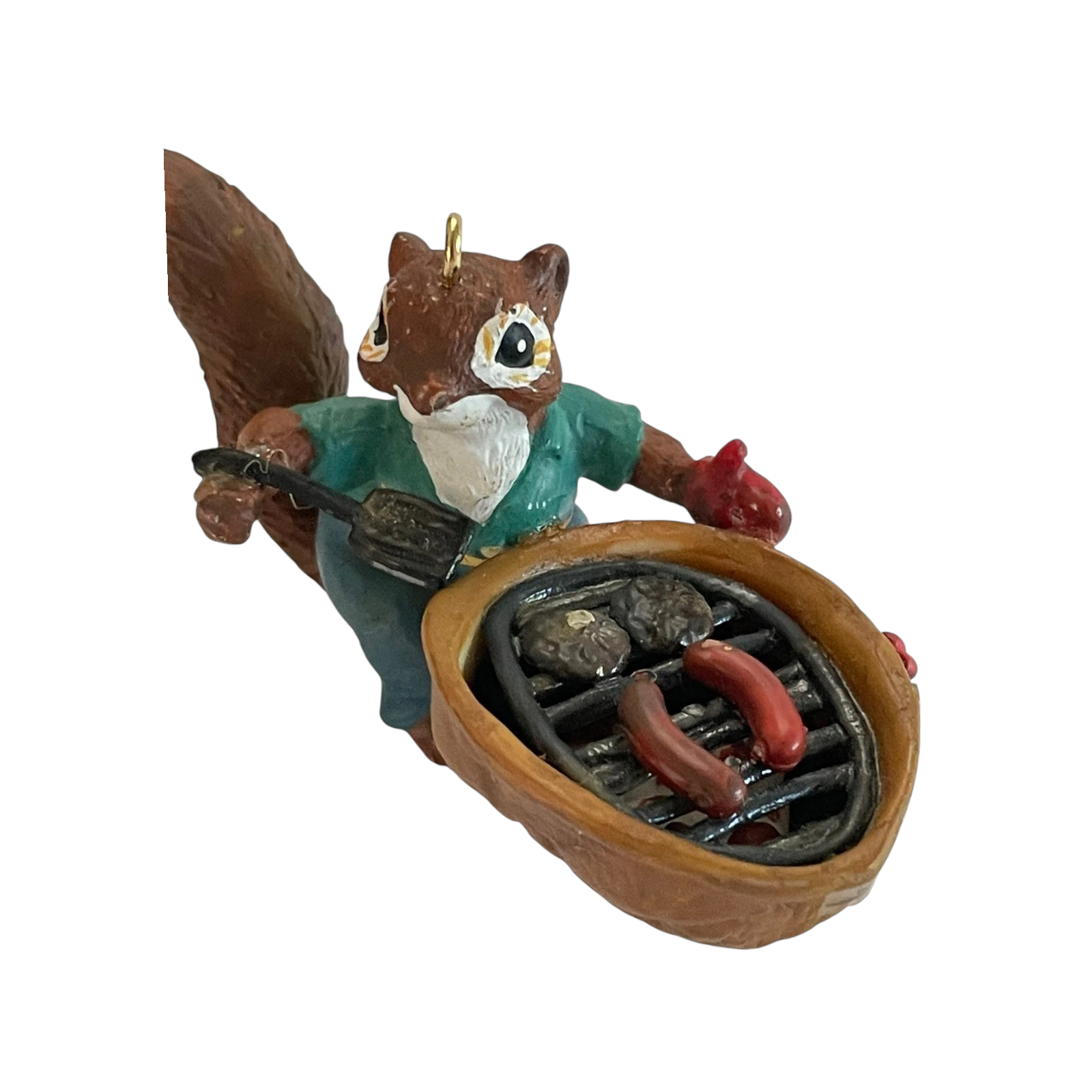 This playful ornament captures a cheerful squirrel happily grilling inside a nutshell shell — complete with little tongs, a barbecue grill and festive holiday detailing. The meticulously hand-painted miniscule scene showcases Enesco’s fondness for novelty and charm, all in a compact format. As the second issue in the “In a Nutshell” series, this piece stands out for collectors looking for series continuity and fun animal-themed holiday décor. With its whimsical design and vintage 1989 release, it makes a quirky yet collectible addition to any tree or ornament collection.