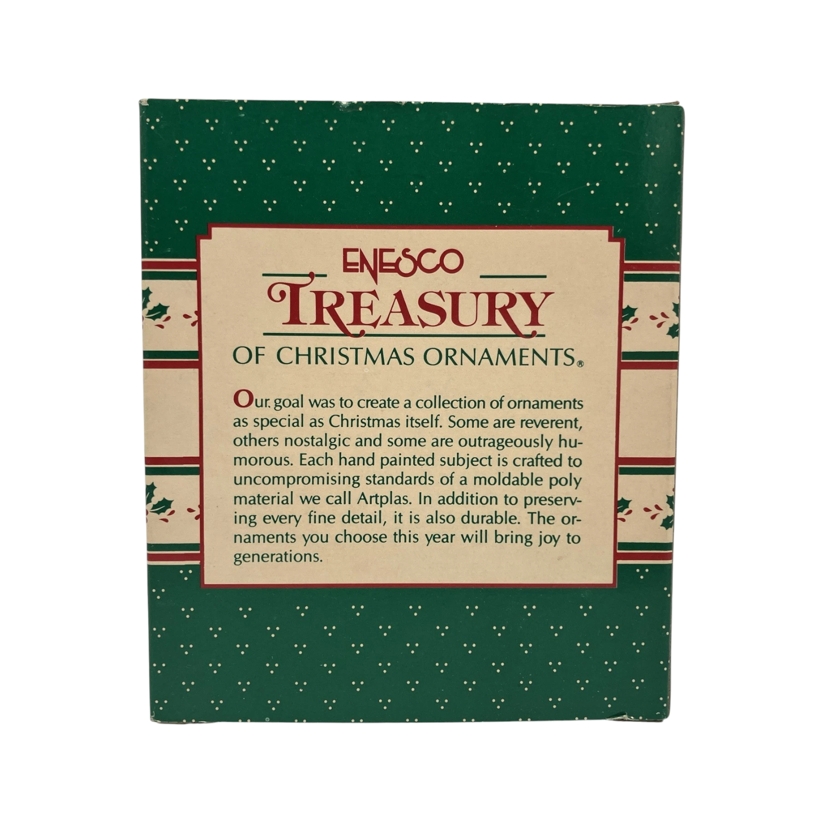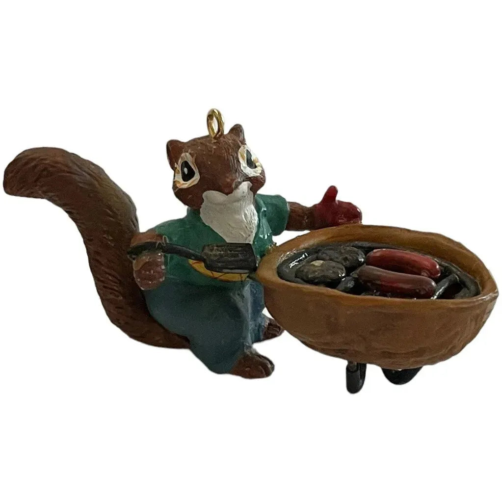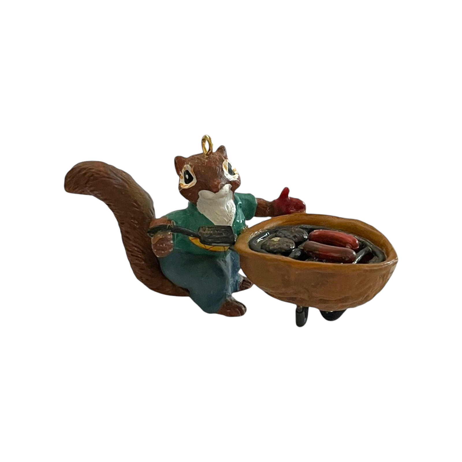 This playful ornament captures a cheerful squirrel happily grilling inside a nutshell shell — complete with little tongs, a barbecue grill and festive holiday detailing. The meticulously hand-painted miniscule scene showcases Enesco’s fondness for novelty and charm, all in a compact format. As the second issue in the “In a Nutshell” series, this piece stands out for collectors looking for series continuity and fun animal-themed holiday décor. With its whimsical design and vintage 1989 release, it makes a quirky yet collectible addition to any tree or ornament collection.