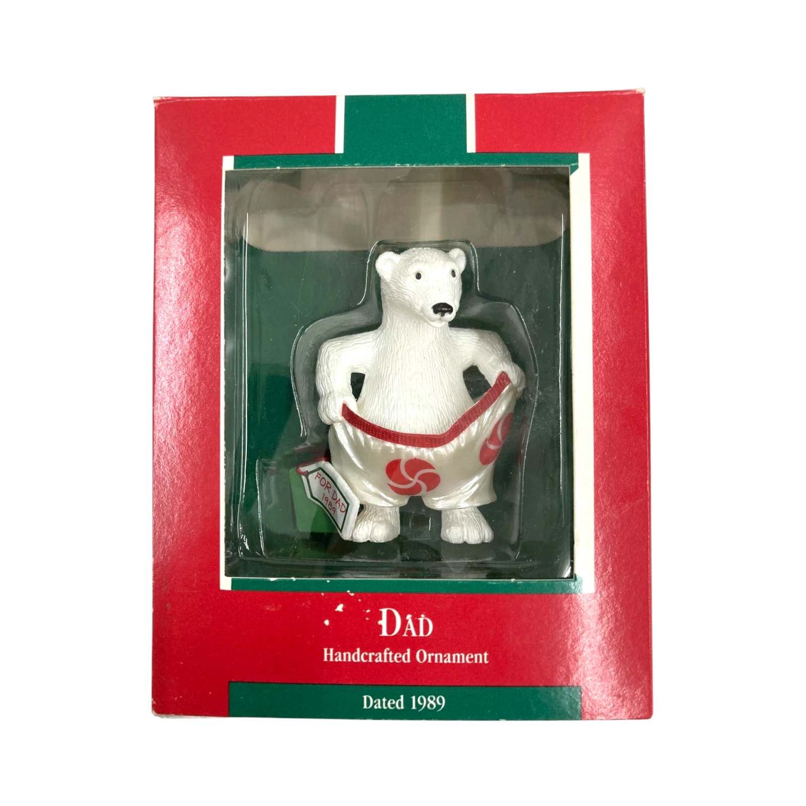 Celebrate fatherhood with the 1989 “Dad (Polar Bear)” Keepsake Ornament from Hallmark. This charming piece features a smiling polar bear wearing a green and red scarf and holding a gift marked “Dad,” bringing both festive cheer and heartfelt sentiment to your holiday décor. Designed by Julia Lee, the ornament is part of Hallmark’s collectible line and resonates with families seeking a meaningful decoration for Dad or family-themed displays. With its vintage 1989 release and nostalgic appeal, this piece is a warm addition for both tree festivities and collector shelves.