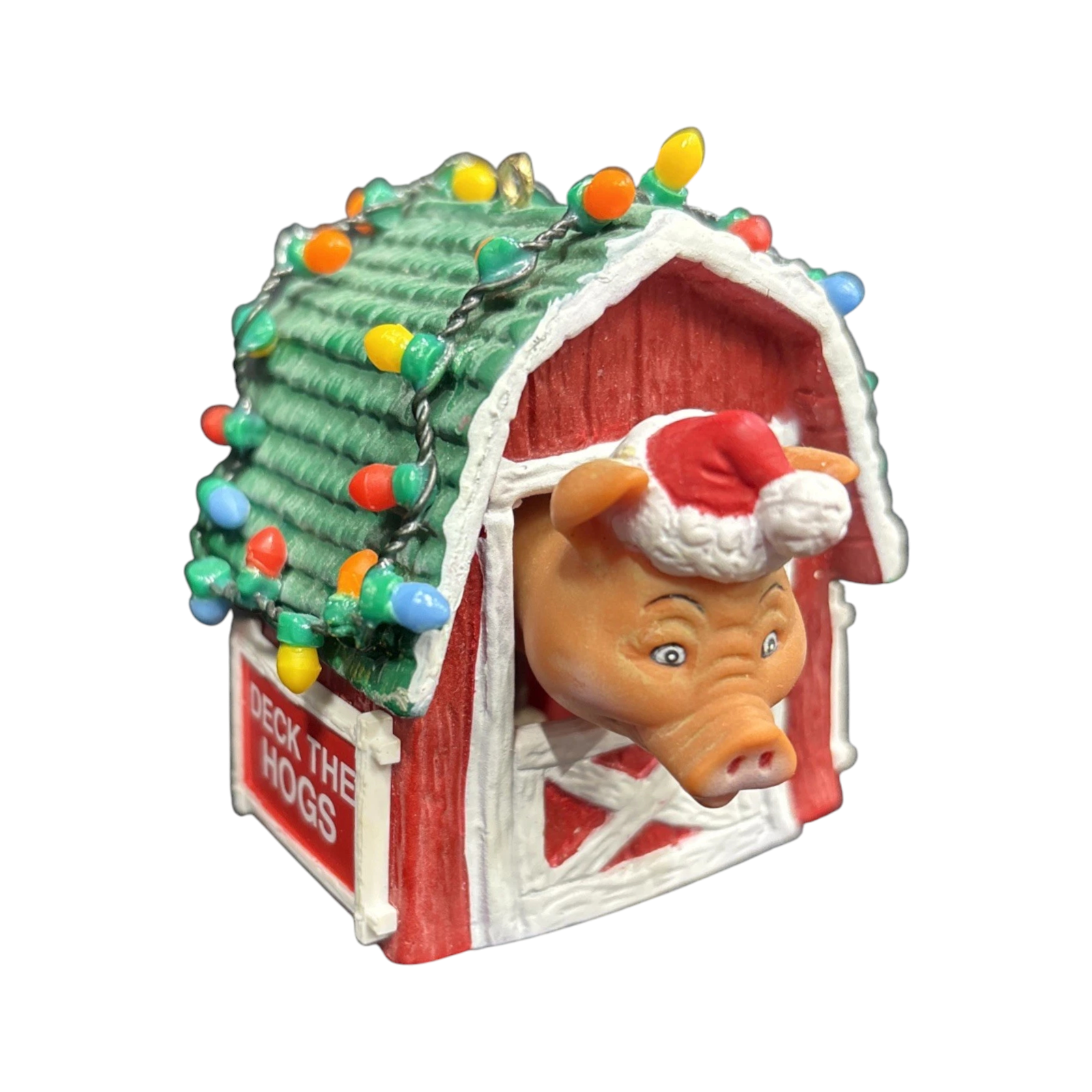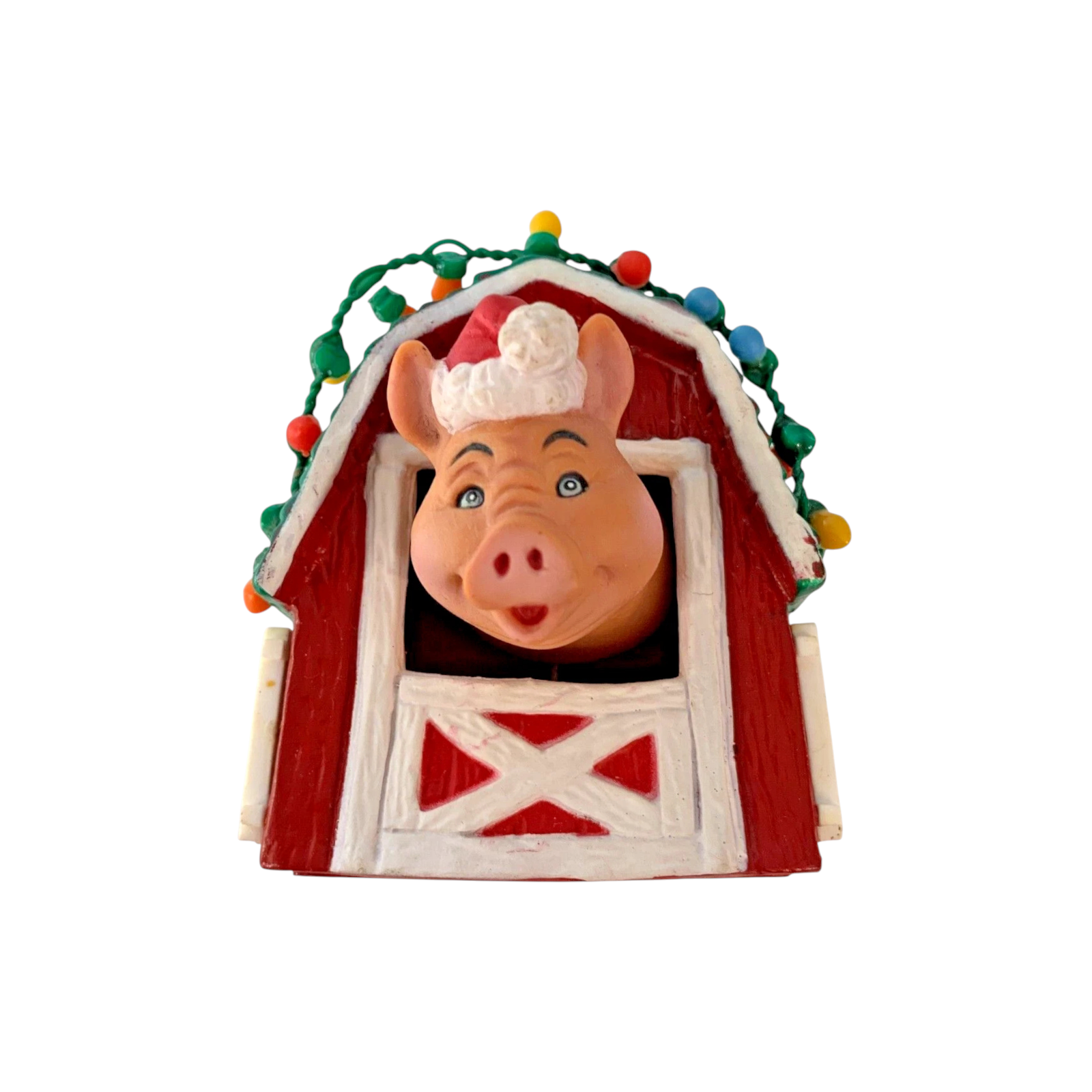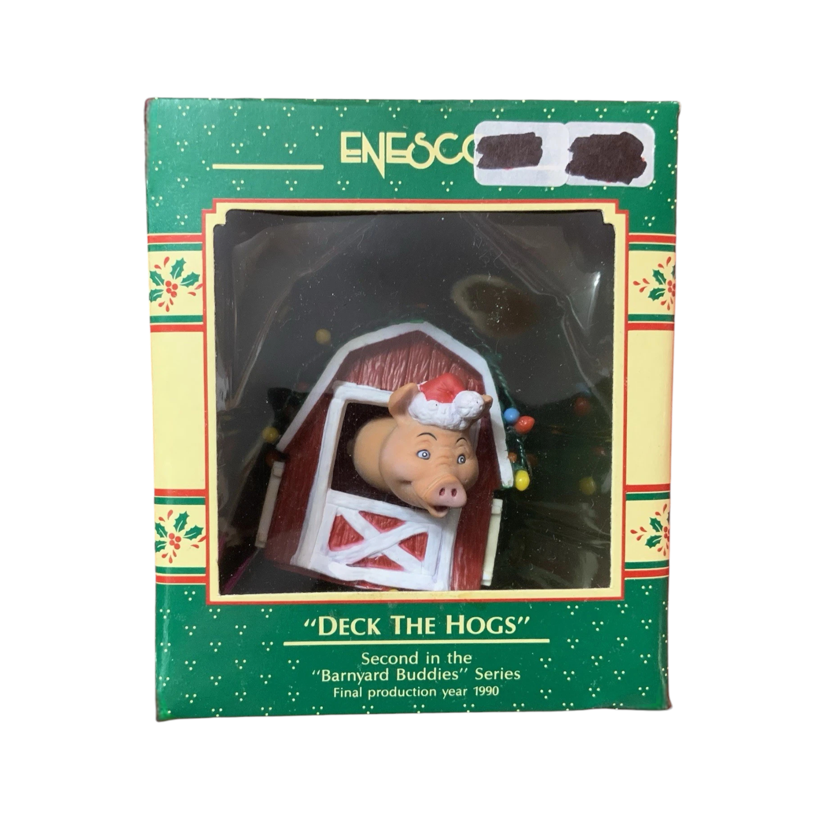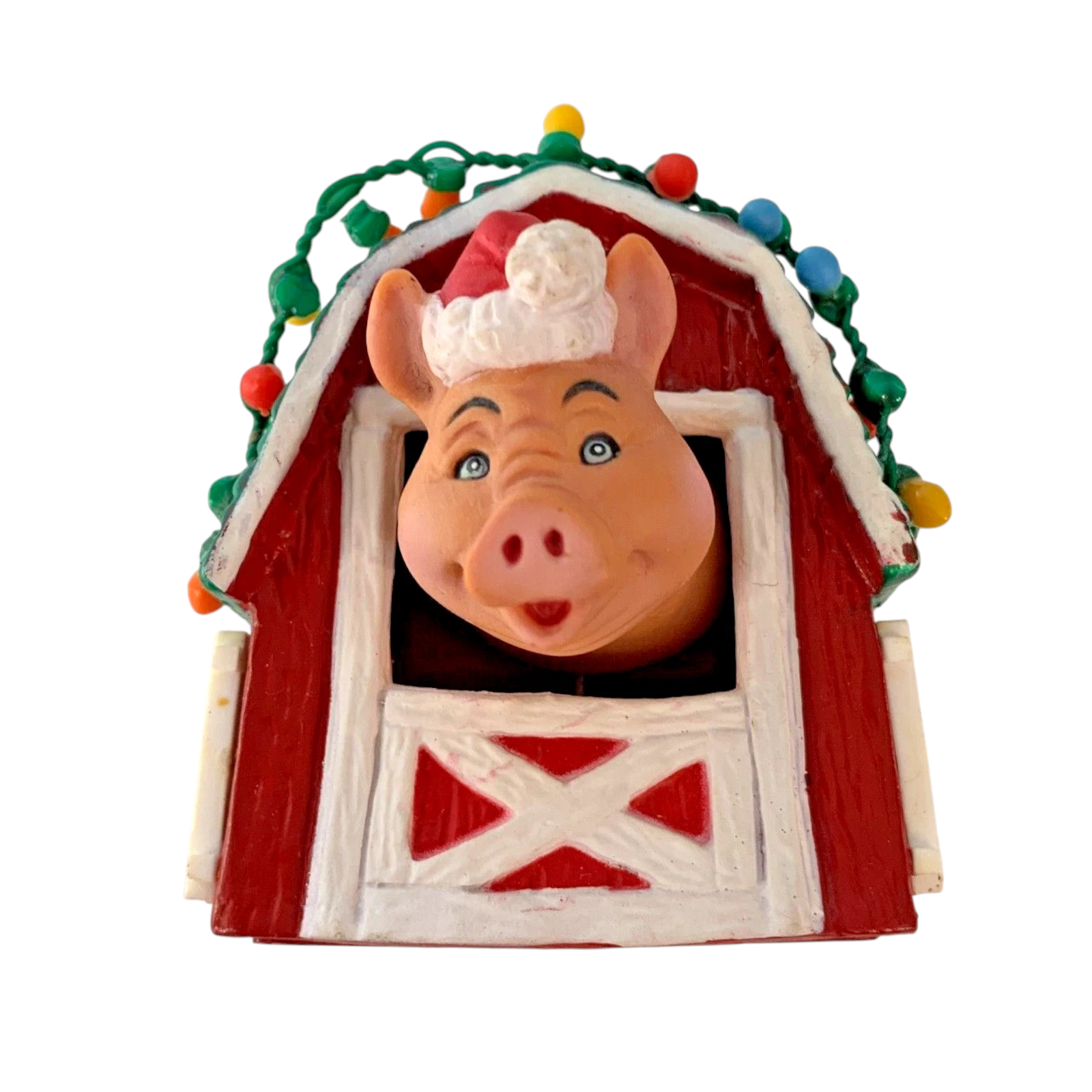 This whimsical holiday ornament captures a merry farm-scene featuring a cheerful pig peeking out of a decorated red barn door—festooned with garland and lights—to celebrate the season with rustic charm. Crafted by Enesco in their beloved “Barnyard Buddies” series, the piece uses Artplas-style molded plastic with detailed hand-painted finishing to bring the mini barn and pig character to life. As the second issue in this series, this 1989 release holds extra collector appeal for those seeking series continuity or novelty animal-themed ornaments. Perfect for lovers of farm-house décor or vintage holiday accents, it adds both humor and charm to any tree or collection.