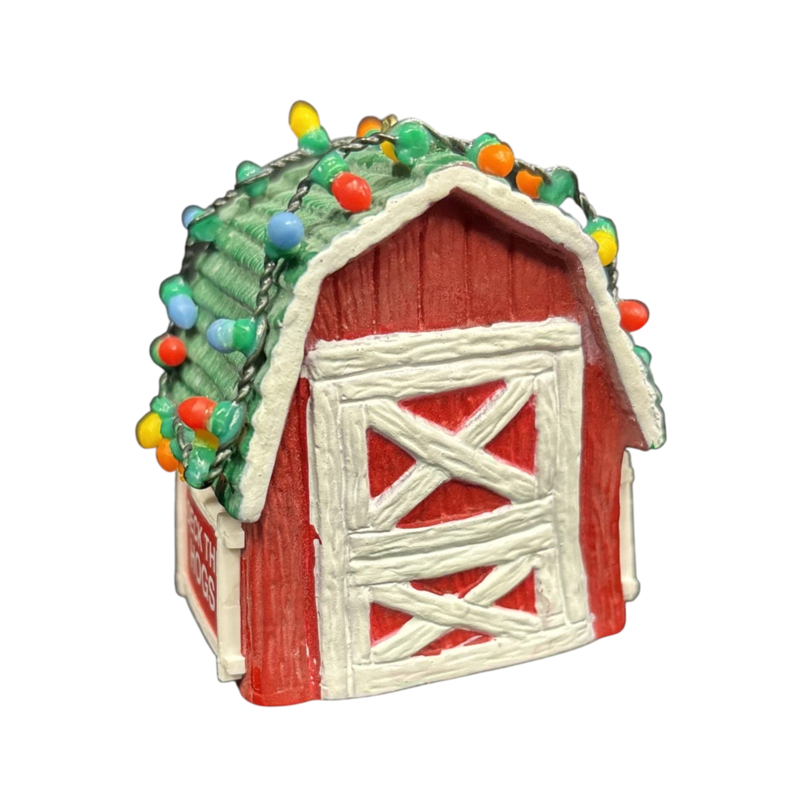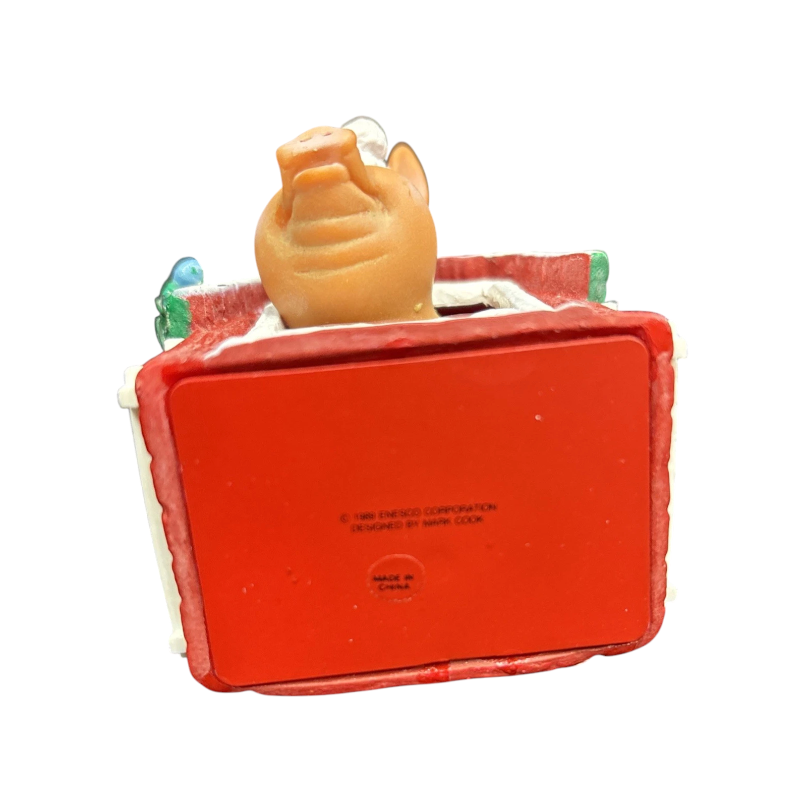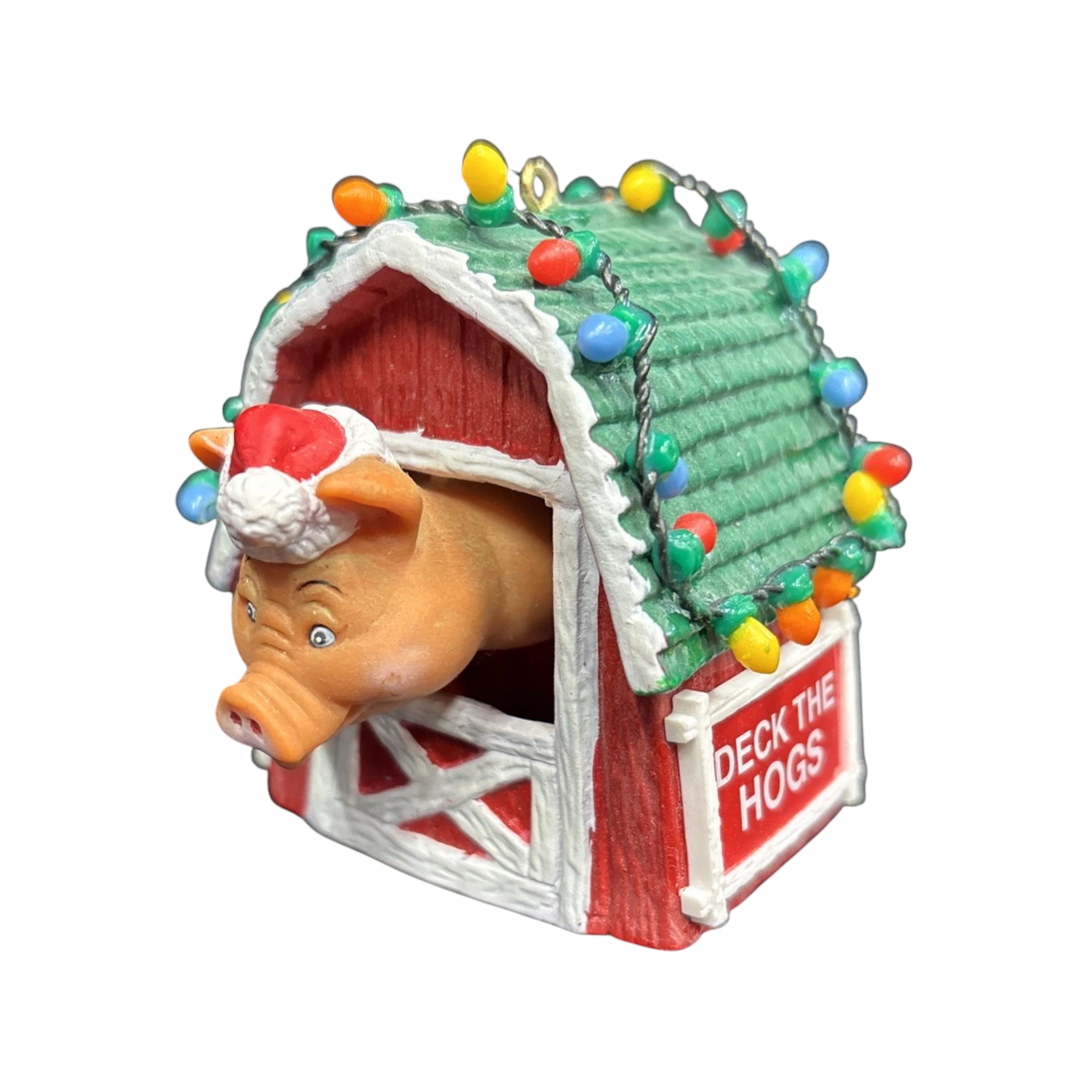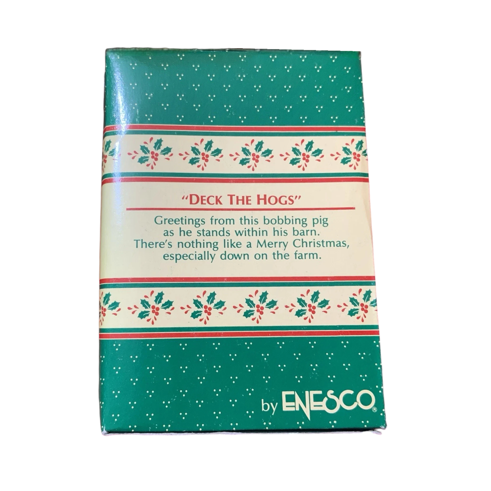 This whimsical holiday ornament captures a merry farm-scene featuring a cheerful pig peeking out of a decorated red barn door—festooned with garland and lights—to celebrate the season with rustic charm. Crafted by Enesco in their beloved “Barnyard Buddies” series, the piece uses Artplas-style molded plastic with detailed hand-painted finishing to bring the mini barn and pig character to life. As the second issue in this series, this 1989 release holds extra collector appeal for those seeking series continuity or novelty animal-themed ornaments. Perfect for lovers of farm-house décor or vintage holiday accents, it adds both humor and charm to any tree or collection.