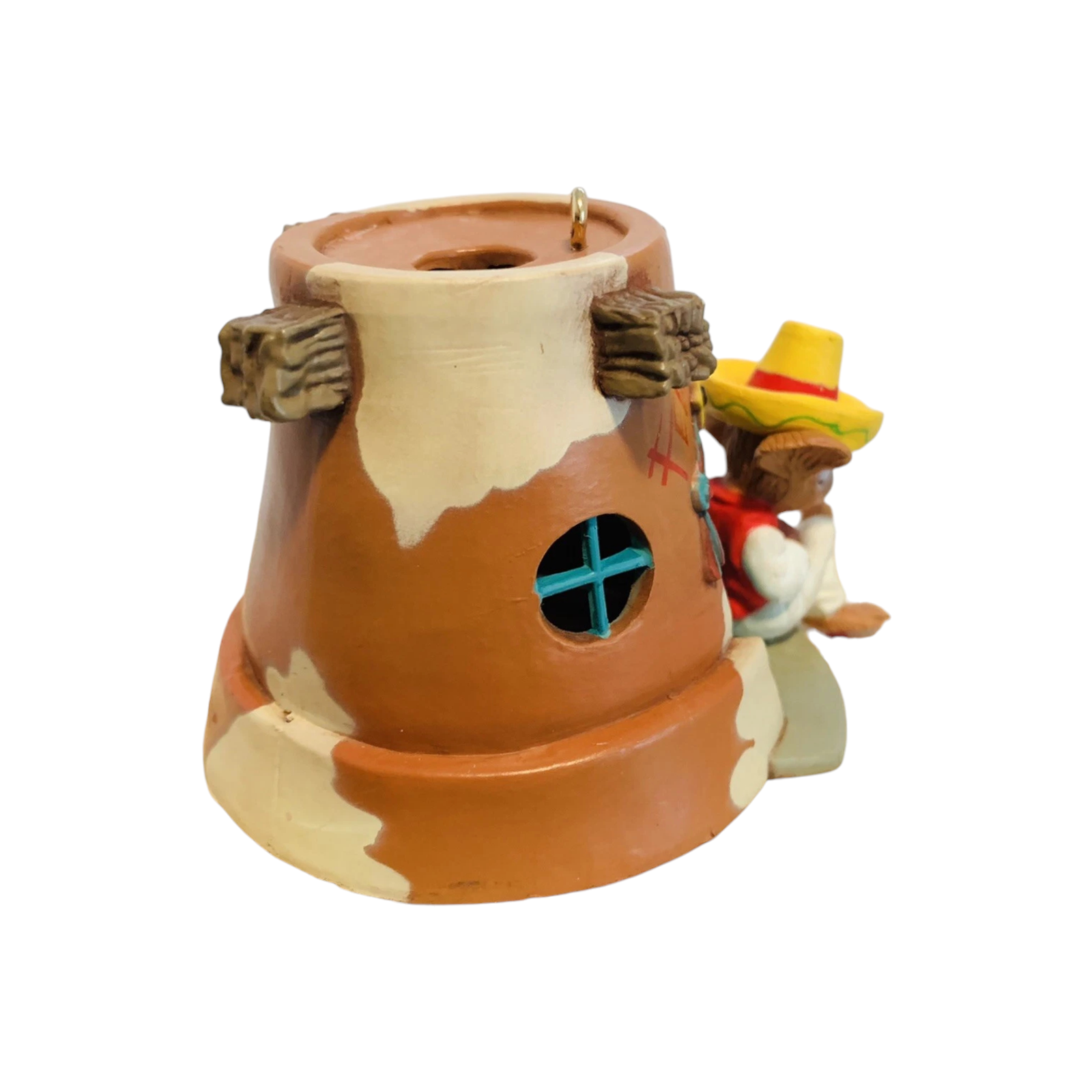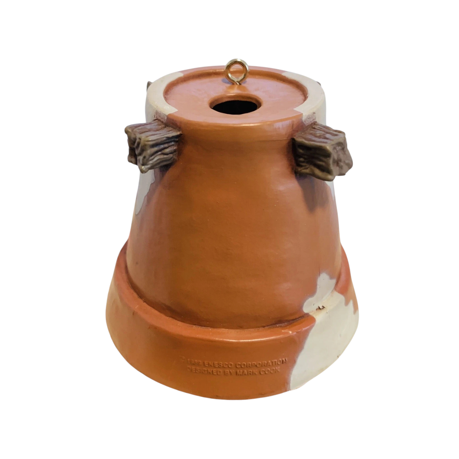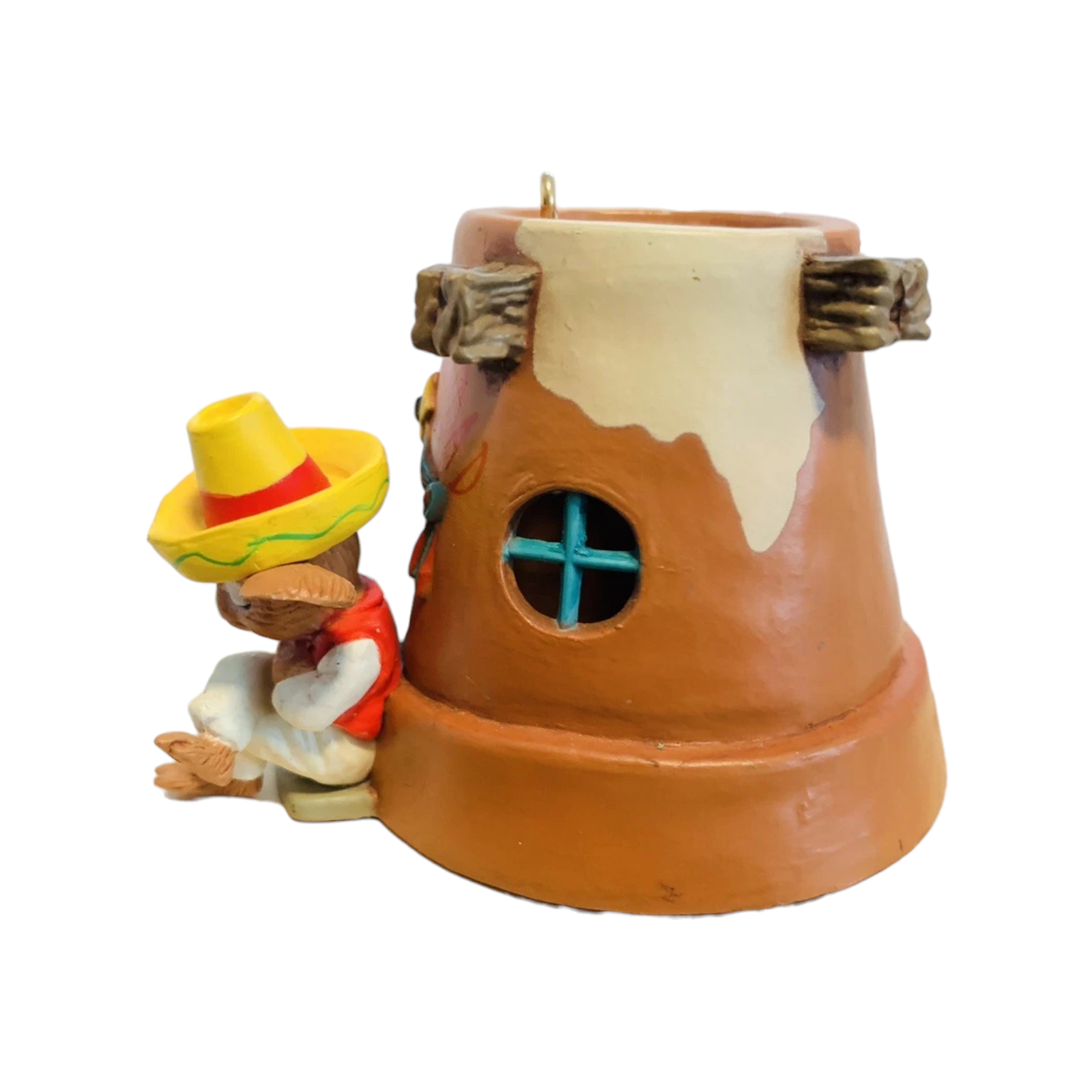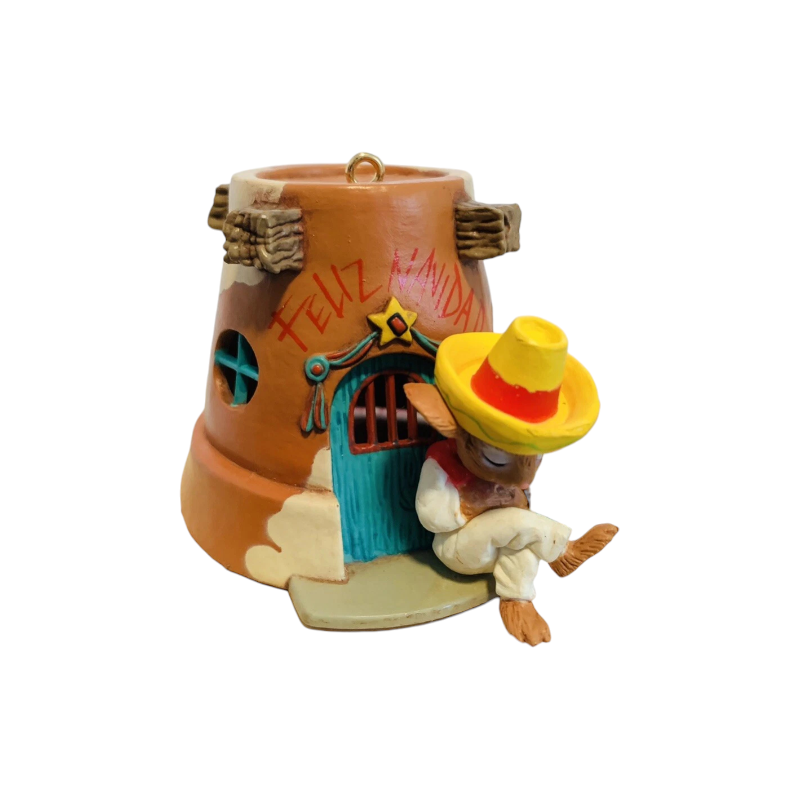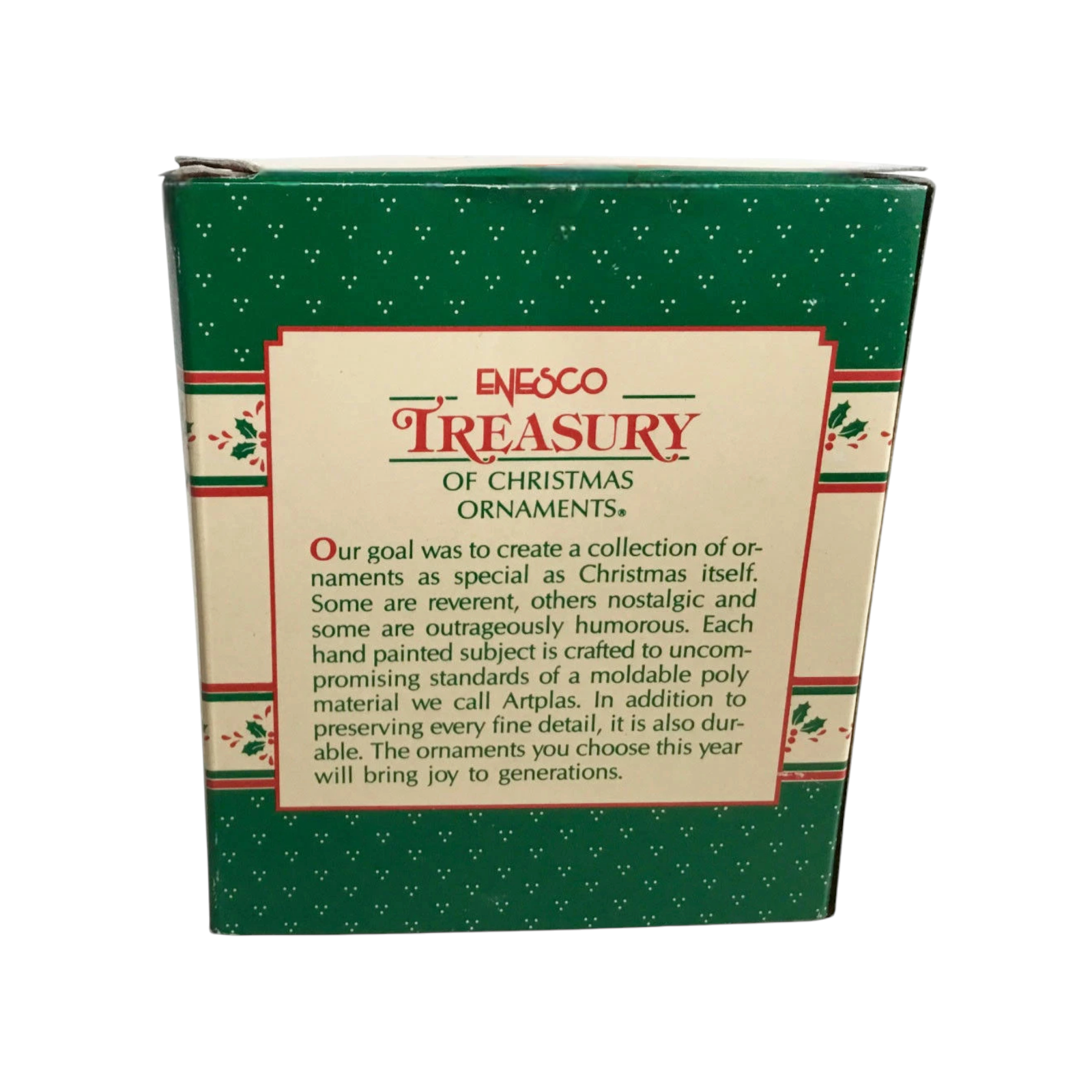 This festive ornament features an adorable mouse wearing a colorful sombrero and relaxing in a holiday scene emblazoned with “Feliz Navidad,” evoking cheerful warmth and seasonal charm. The design is rendered in mixed materials with an art-pottery hand-painted finish, characteristic of Enesco’s collectible holiday line. As the first issue of the “Home for the Holidays” series, this 1989 release holds special appeal for collectors of vintage holiday décor and fans of whimsical character-themed ornaments. With its playful motif and vivid detailing, it’s a standout piece for anyone seeking a fun twist on classic Christmas ornaments.