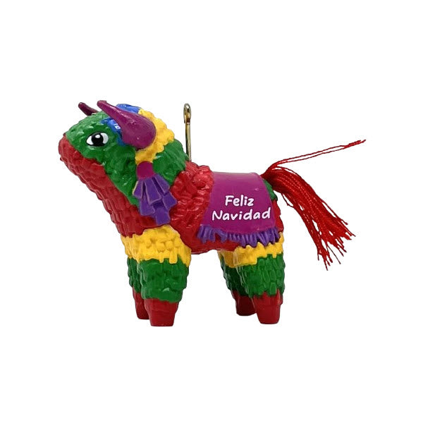 Share festive cheer with the 1989 Feliz Navidad (Feliz Navidad Series) ornament: a colorful bull-shaped pinata hand-painted in bright reds, greens, yellows, and purples, complete with a pink blanket embroidered “Feliz Navidad” and a red yarn tail. Designed by Michele Pyda‑Sevcik, this 2½″ H keepsake arrives in its original collector’s box with tag. Requires No Power—just hang and let its vibrant presence warm your holiday display.