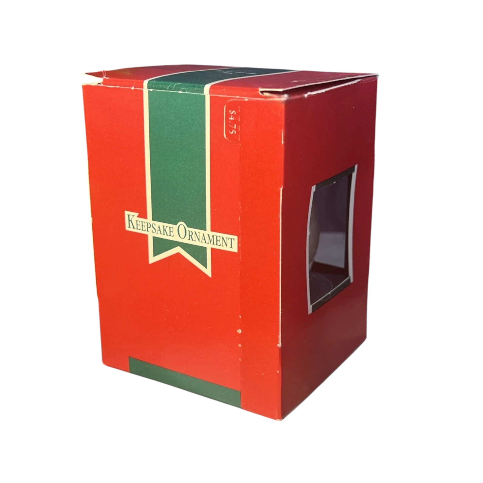 This elegant 1989 ornament from the Hallmark Keepsake collection is a glass ball designed to commemorate a couple’s first Christmas together. The ornament features a soft pearlescent white background, accented with gold-tone lettering reading “Our First Christmas Together” on one side and “’Tis the season to be cuddly” on the other. The design includes a pair of white polar-bear figures nestled amid holly leaves and mistletoe, beautifully symbolizing togetherness and holiday warmth. It’s an ideal keepsake for newlyweds or couples celebrating their inaugural holiday season together.