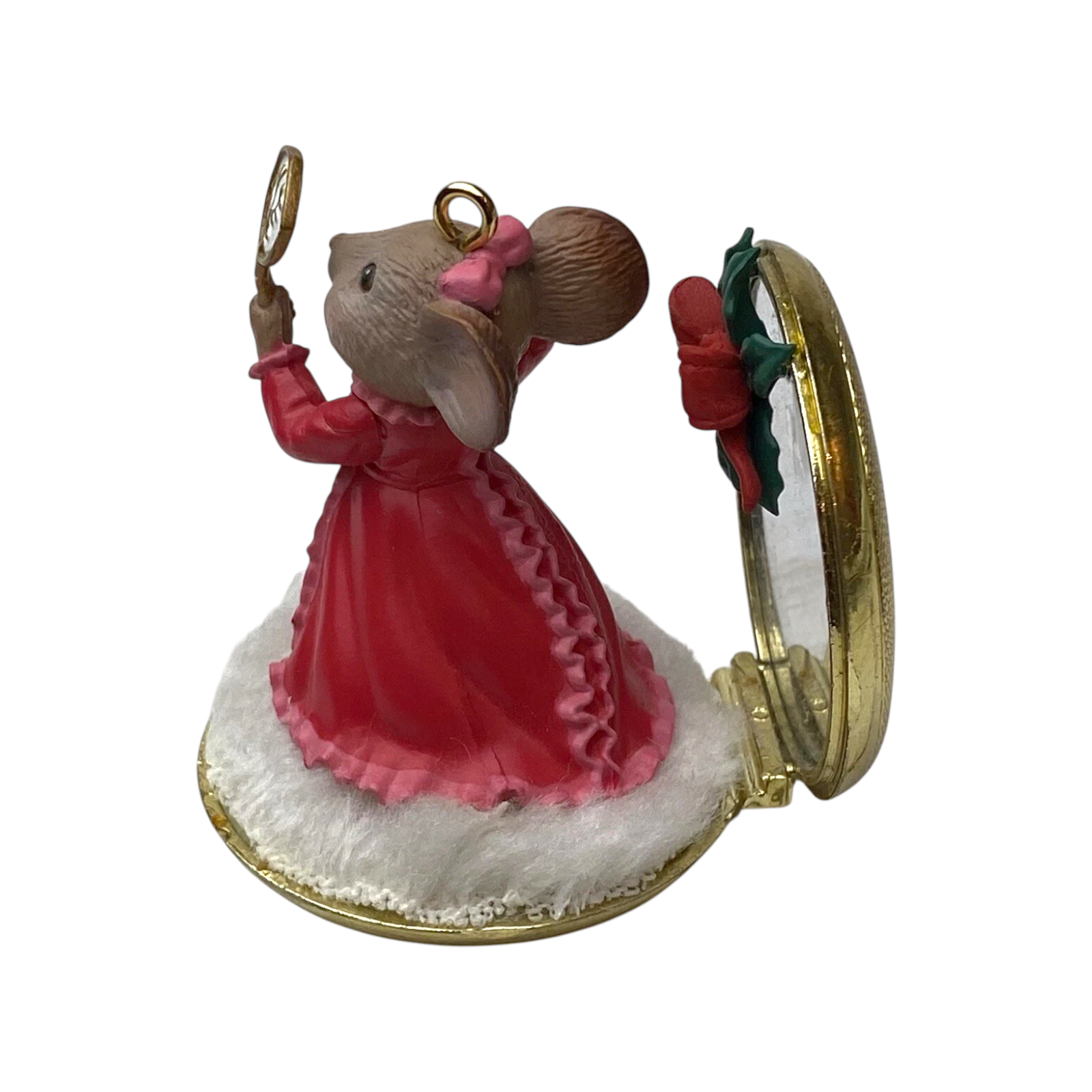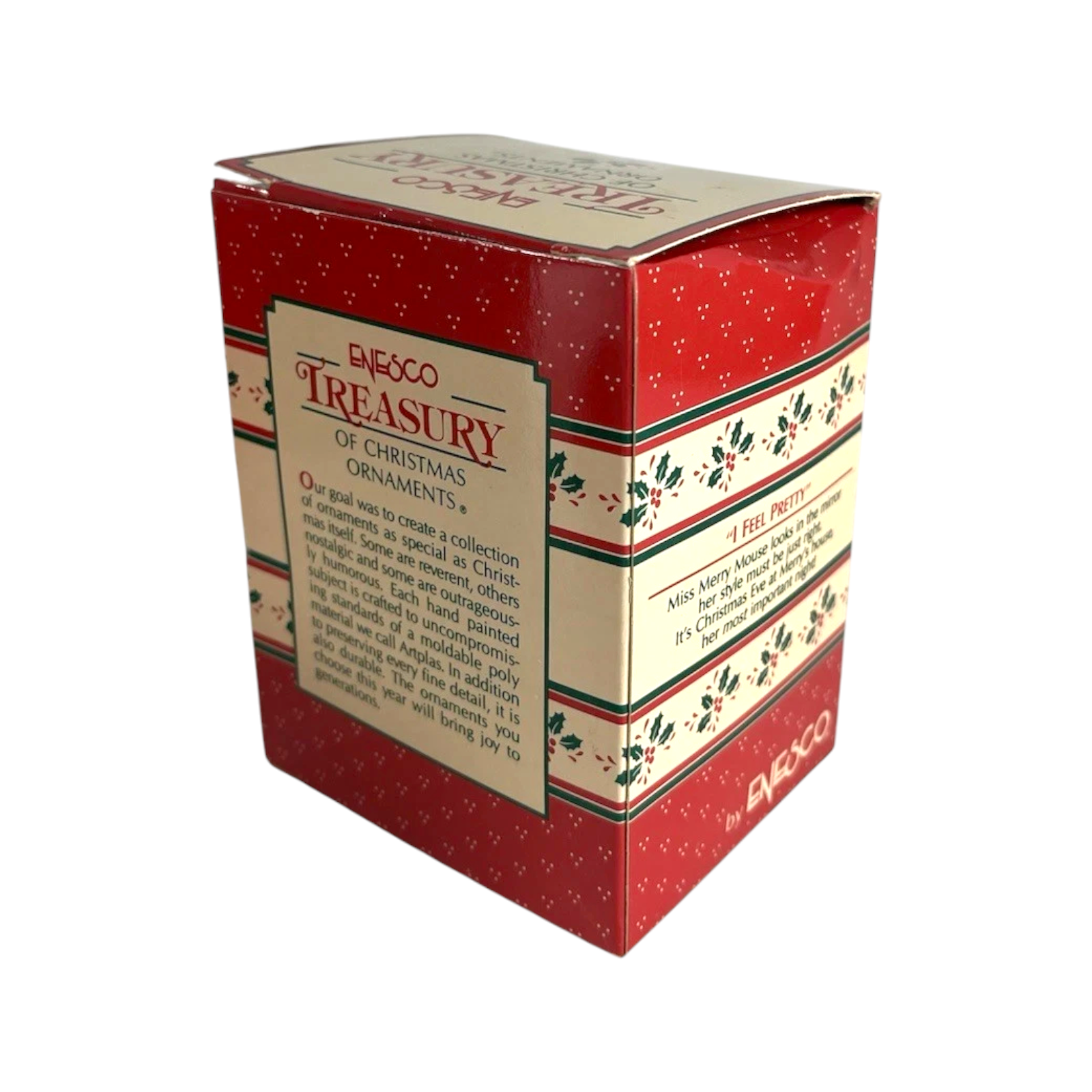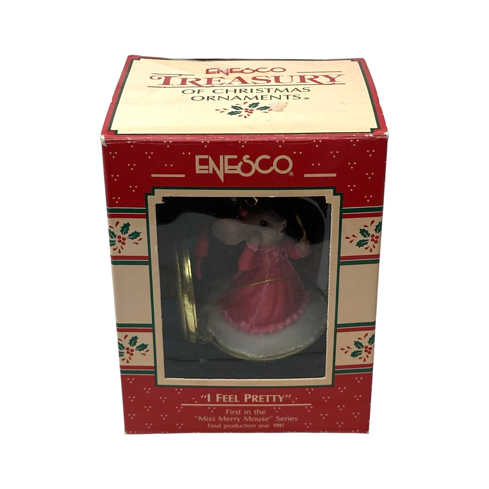Add a touch of whimsy and charm to your holiday décor with the 1989 Enesco “I Feel Pretty” ornament — the first issue in the delightful “Miss Merry Mouse” series. This adorable collectible features Miss Merry Mouse admiring herself in a mirror, dressed in her festive finest with a bow and holiday accessories. Hand-painted in warm, cheerful tones, this piece showcases Enesco’s signature attention to detail and storytelling charm. A must-have for collectors, animal lovers, and fans of Enesco’s vintage mouse series, this ornament captures the playful spirit and joy of Christmas.