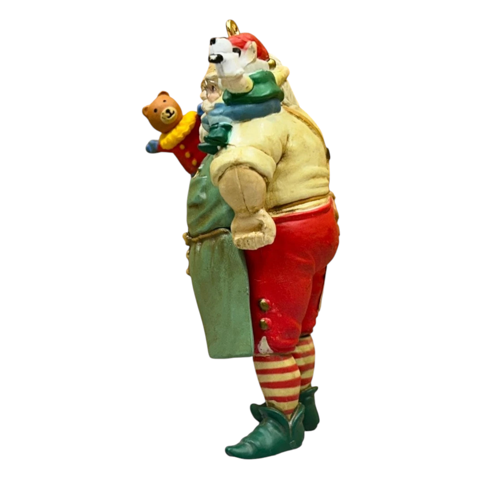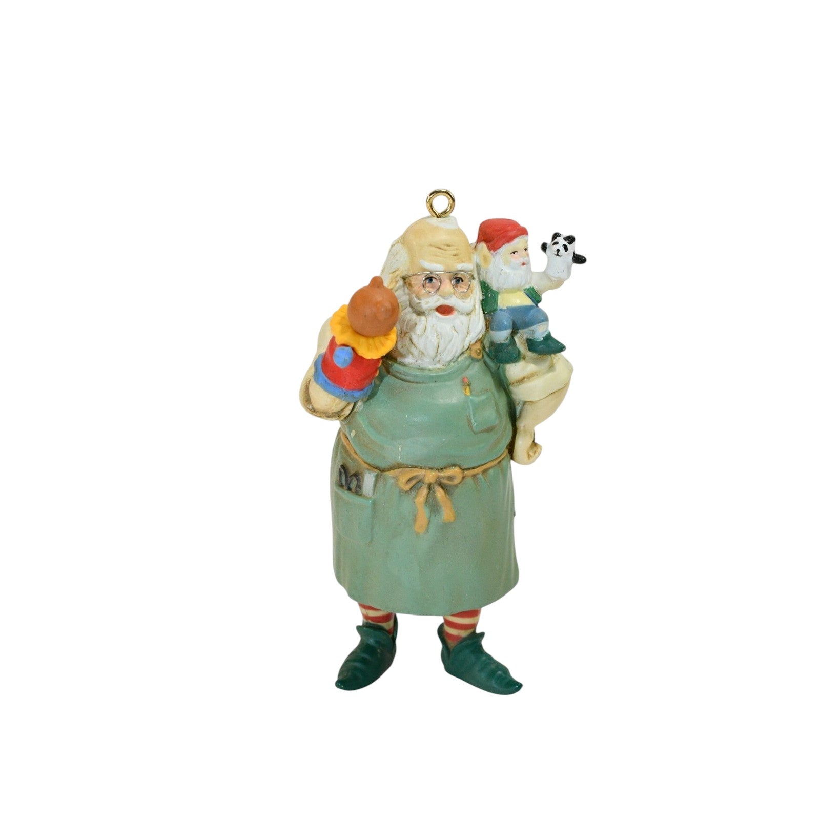 Step into Santa’s creative world with the “In the Workshop (Toymaker Santa)” ornament—SKU 114866-4 (also referenced as 102343-8). Released by Carlton Cards in 1989, this detailed Heirloom collection piece depicts Santa immersed in his toy-making workshop: wearing a work apron, holding a hand puppet, surrounded by miniature toys and work tools. Crafted in molded resin/plastic with multicolour painted finish and a hanging loop, it evokes nostalgic charm and collector appeal. It’s an ideal keepsake for lovers of Santa-workshop scenes, toy-themed decor or vintage Christmas ornament collections.
