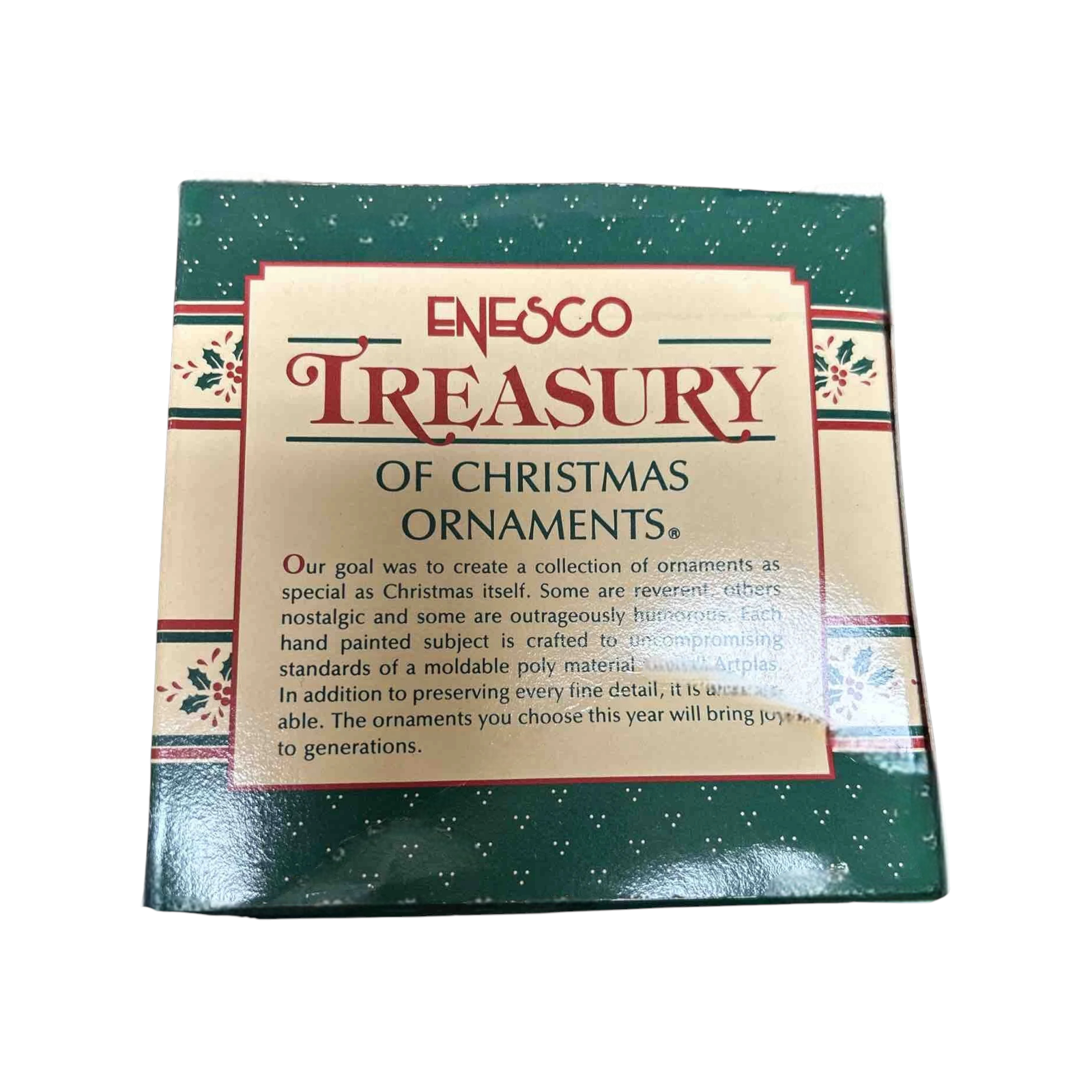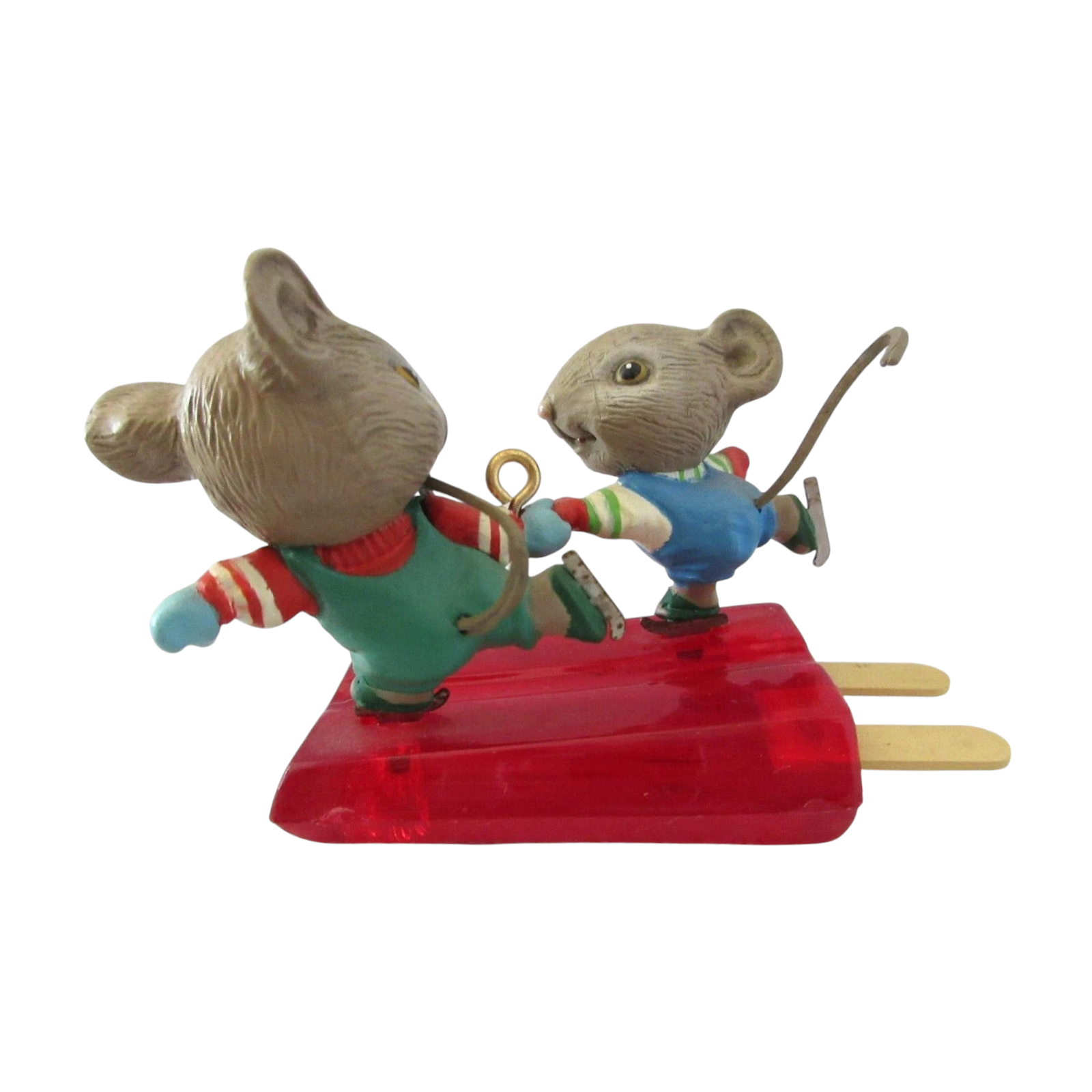 This whimsical vintage ornament features two cheerful mice ice-skating hand-in-hand atop a red popsicle base engraved with “Merry Christmas, Pops!” The charming scene, crafted in hand-painted Artplas (a durable molded polymer) and rich holiday colours, reflects Enesco’s playful collectible style from the late 1980s. Its nostalgic “Pop” (father or grandfather) sentiment and ice-skating motif make it especially endearing for families, collectors of mouse/animal-themes, or anyone seeking a fun and heartwarming holiday decoration. As a 1989 release, it also holds added vintage appeal.