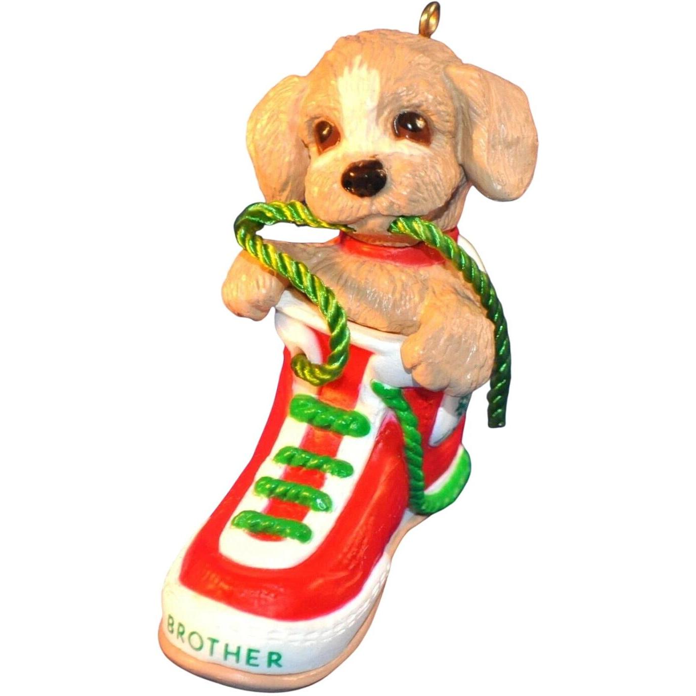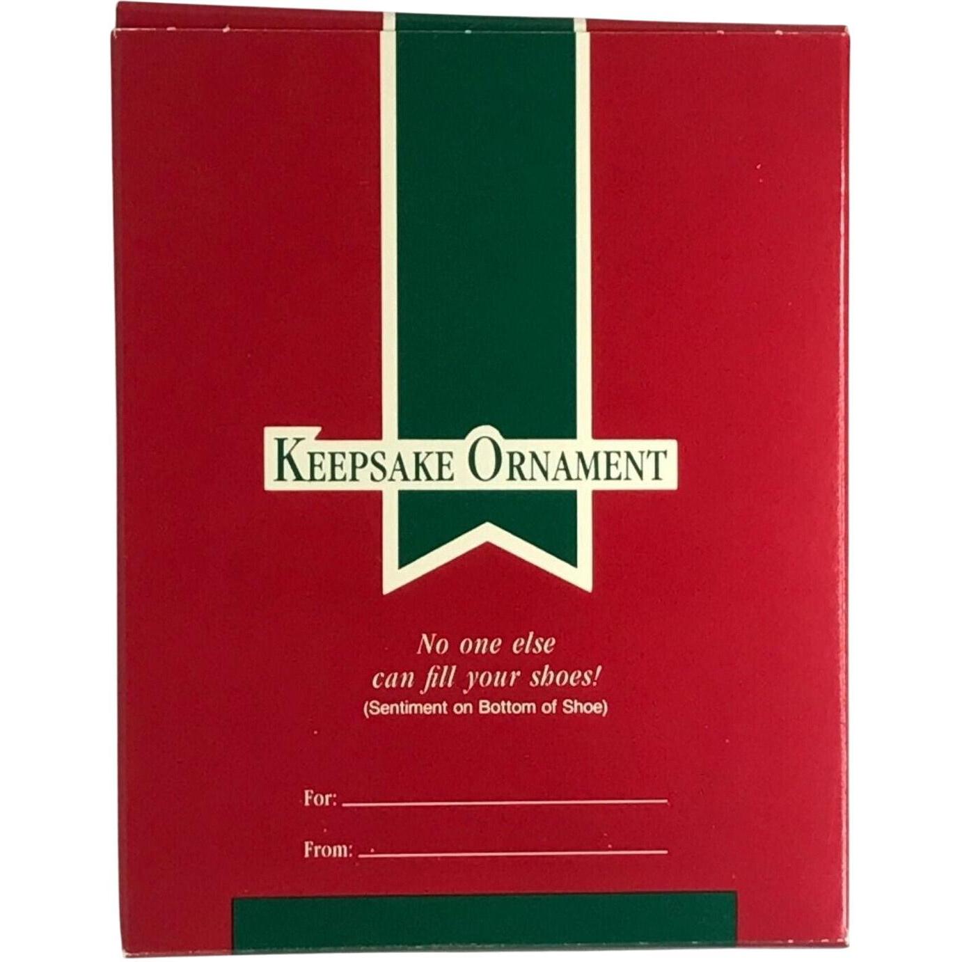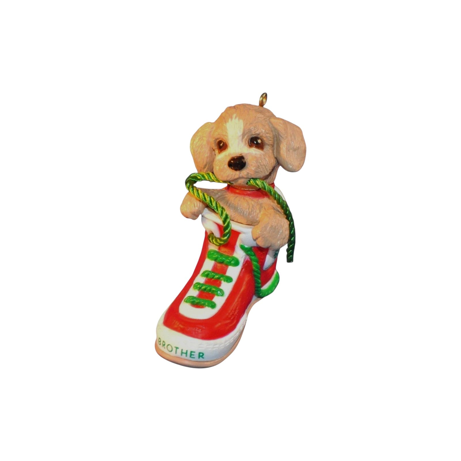 Celebrate brotherly love with 1989 Brother (“No One Else Can Fill Your Shoes”), a nostalgic Keepsake ornament honoring the bond between siblings. This 1989 Hallmark piece features a sweet brown puppy tugging a green shoelace, snug inside a bright red sneaker labeled “Brother.” With the touching sentiment “No one else can fill your shoes!” stamped on the sole, it’s crafted by artist Joyce Lyle, measures about 2½″ high by 2½″ wide, and includes the ornament itself (box when available). No power, motion, or sound—just a heartfelt keepsake.